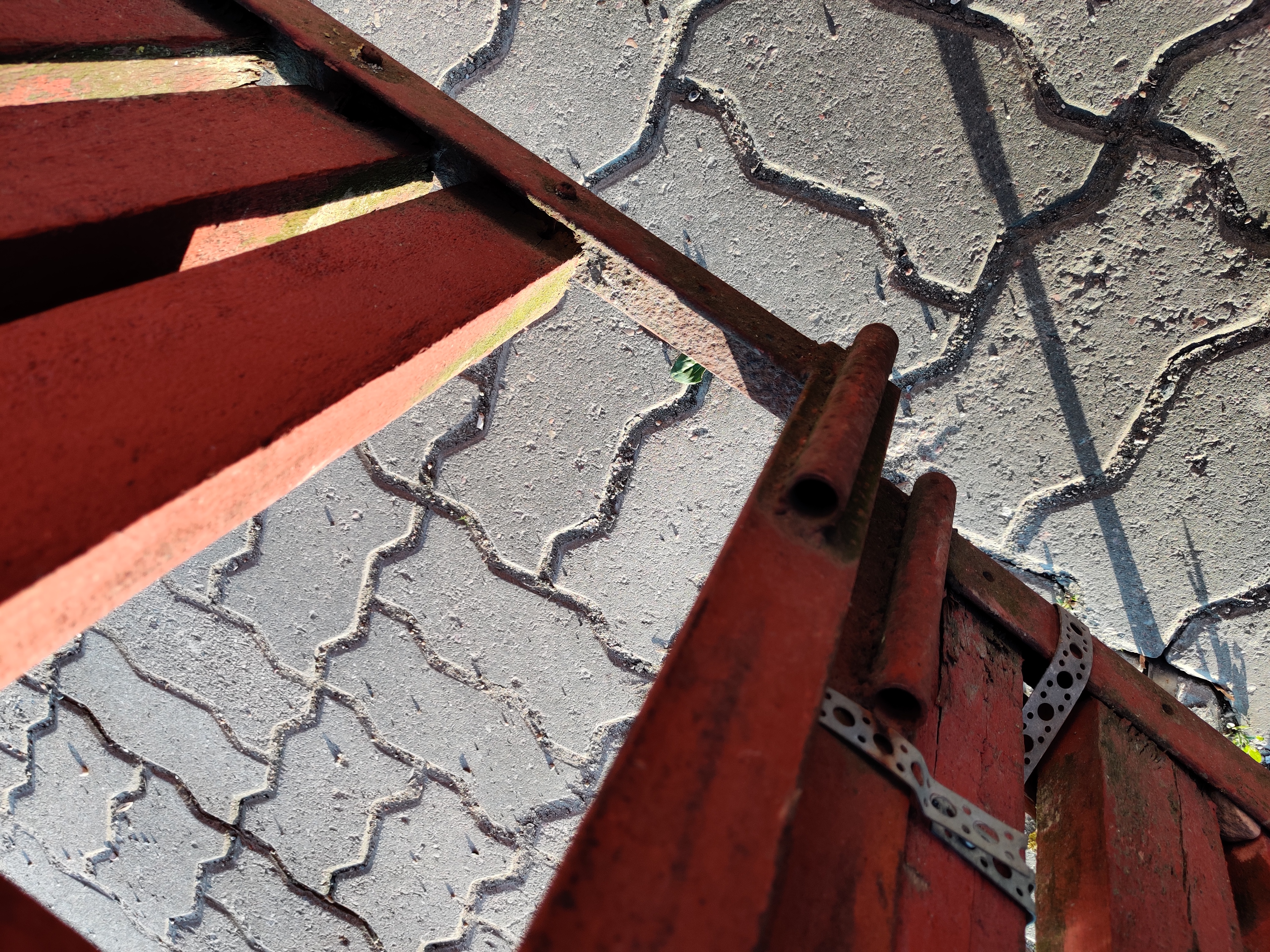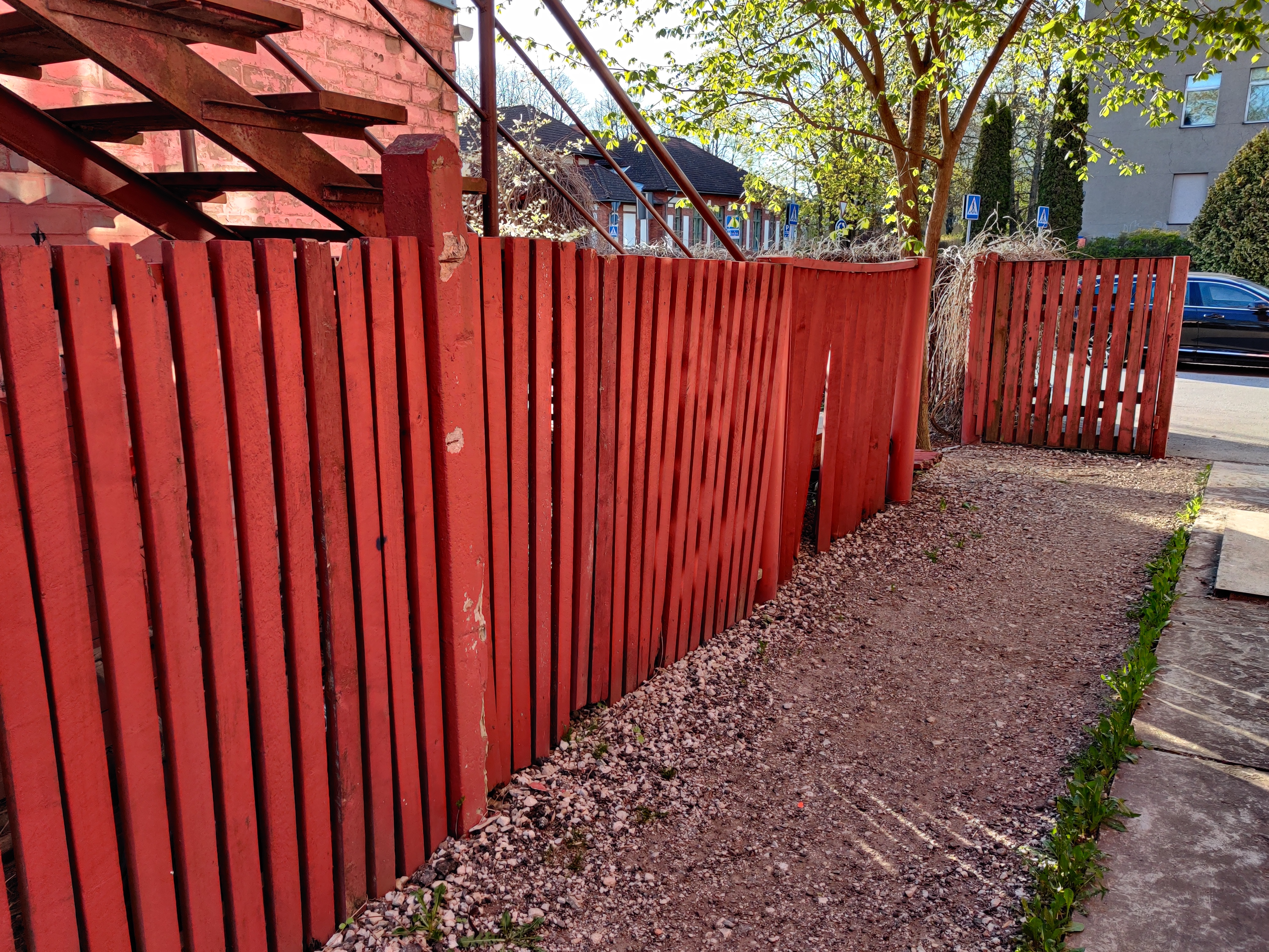 Nagu veel piltidelt näha, on seal 3 sektsiooni, mis traditsioonilisemal moel lahendatud ja siis ülejäänud pisut huvitavama paigutusega - ehk uuel aial siis jätta samamoodi (kuna posti küljes on lati kinnitused ka vastavates asendites). Seda osa, mis kõrgema planguna edasi läheb, ei ole hetkel vaja uuesti teha.