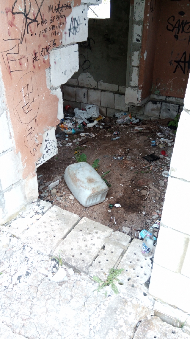Ehitise sees on ka paar prügikotti kogust prügi, need peab ara viia (koos purustatud tellistega). Vaata pilt.