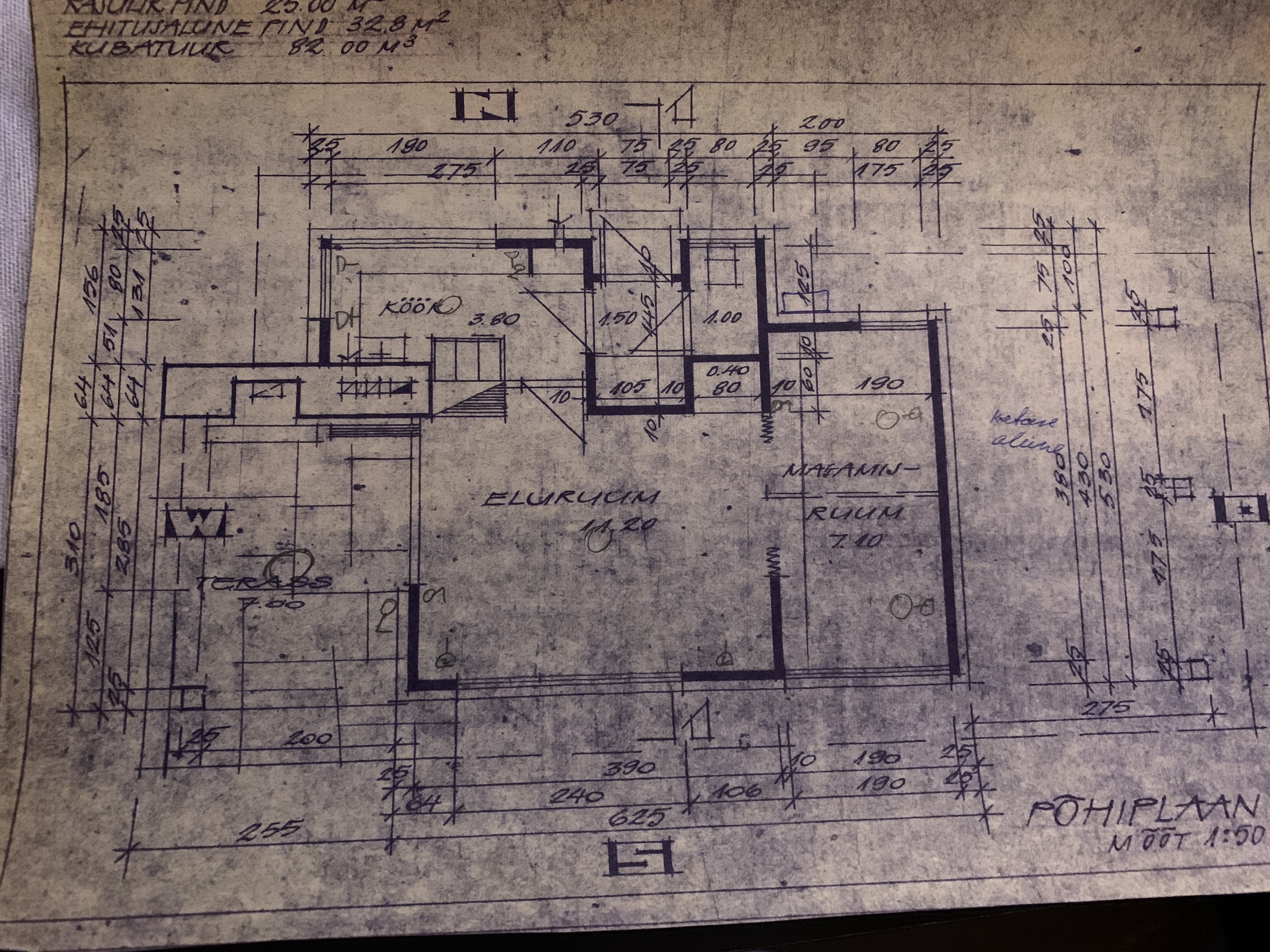 Vaja teha majale tagantjärgi projekt (mõõdistusprojekt), et saaks katastrisse kanda. Olemas on esialgne plaan mille järgi maja on ehitatud, aga ajaga muudeti terass (ehitati elutuba) ja katusealune kinniseks (ehitati eesruum, pesuruum, saun ning kuur. Olemas on ka eraldi plaan nende suuruste kohta)