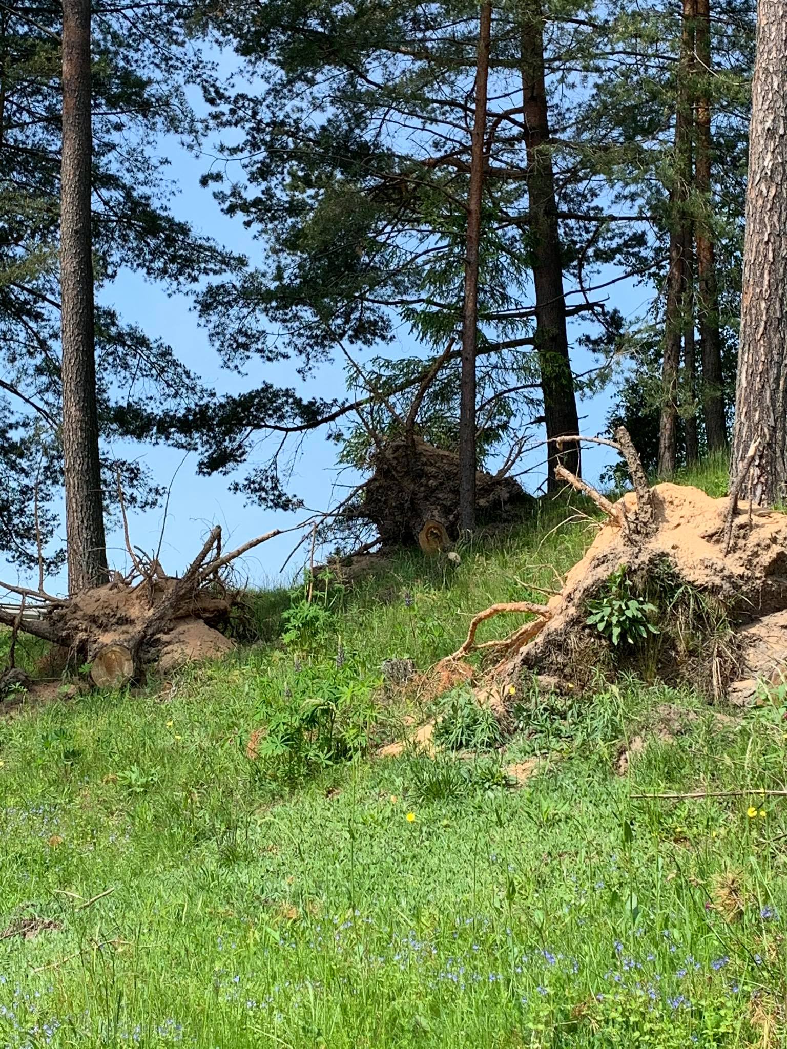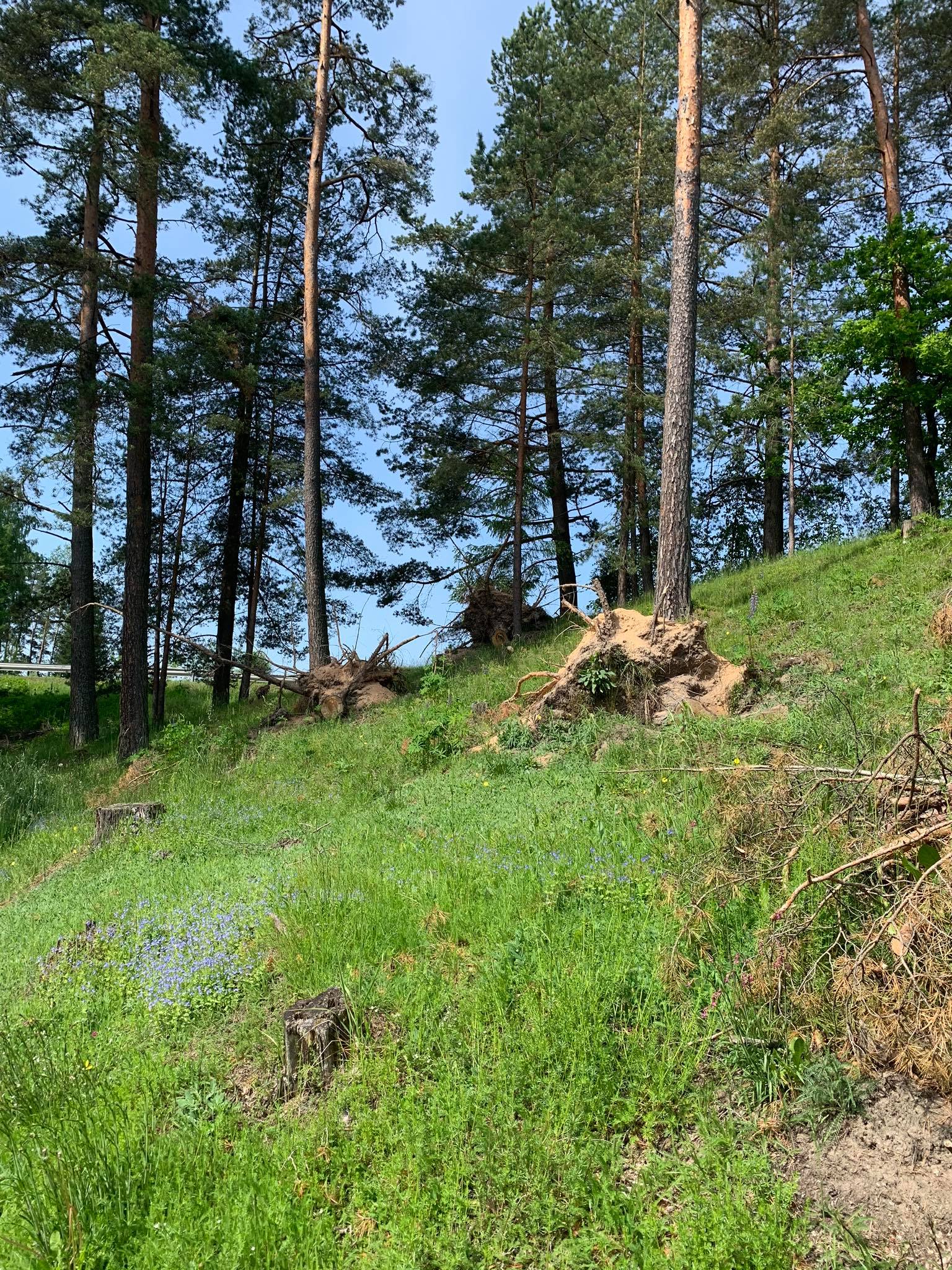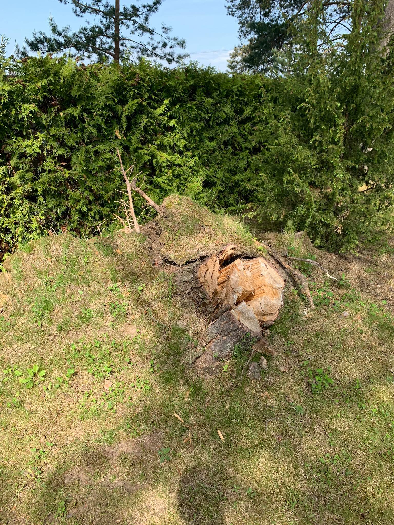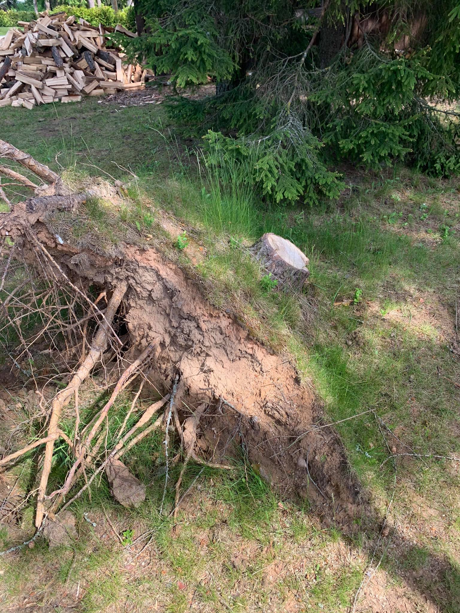 Oleks vaja tõmmata välja 2 kändu lageda maa peal ja 3 kändu mäe peal. Kännud tuleks ka ära viia. Kännud on poolenisti väljas maast, kuna puud murdusid tormi käigus.