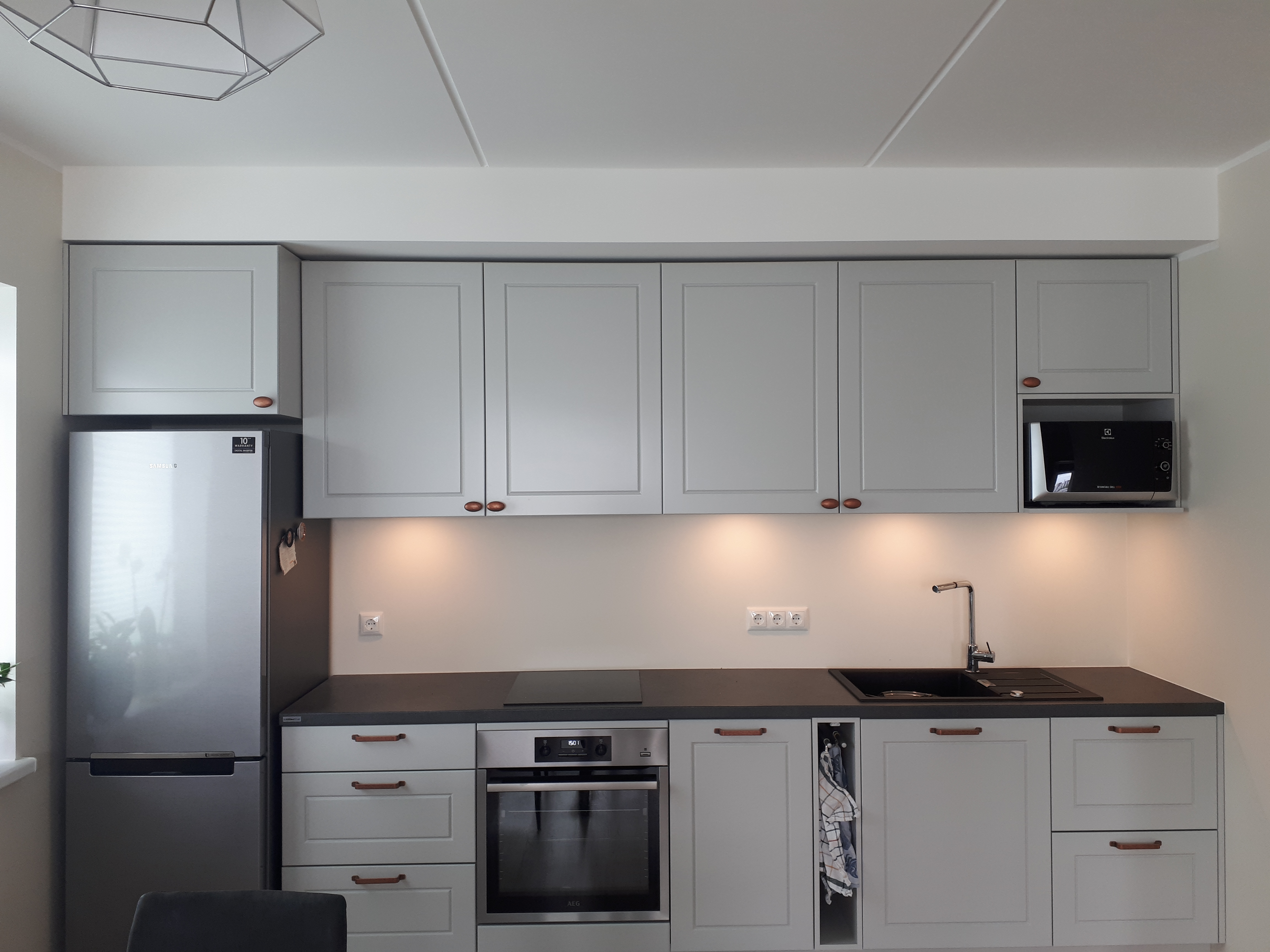 Tegu on sirge köögi tagaseinaga - mõõdud 300x59cm. Külmkapi taha ei pane plaate. Seinas on kaks erisuuruses pistikupesa. Keraamilised plaadid on olemas (Equipe Rhombus Wall 15,2 x 26,3 cm). Valged rombikujulised plaadid halli vuugiga, et muster paistaks välja. Soovitud mustri foto lisatud.
