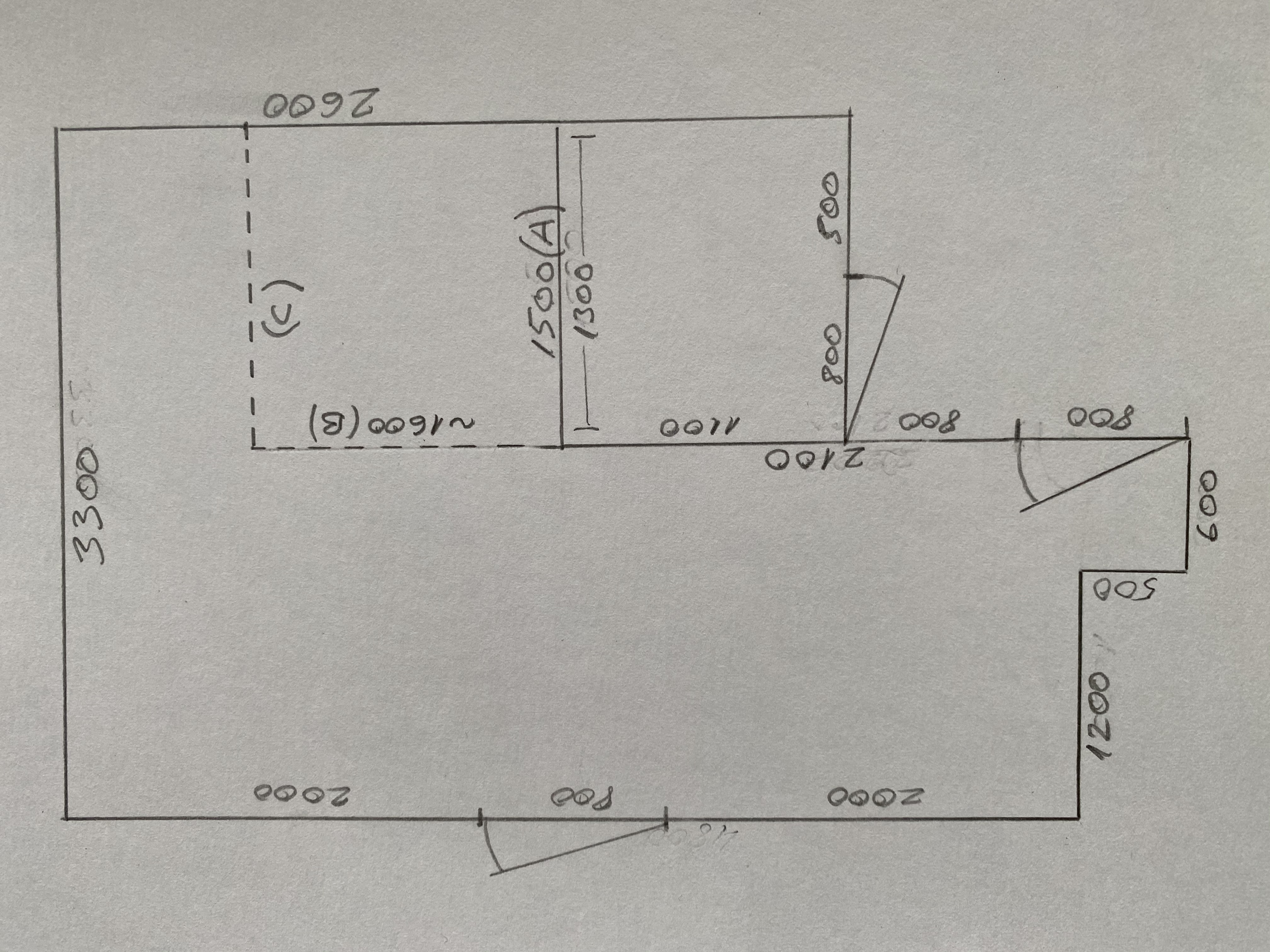 * ruumide 1 ja 2 vahele kahe uue vaheseina ehitamine (joonisel tähistatud (B) ja (C));