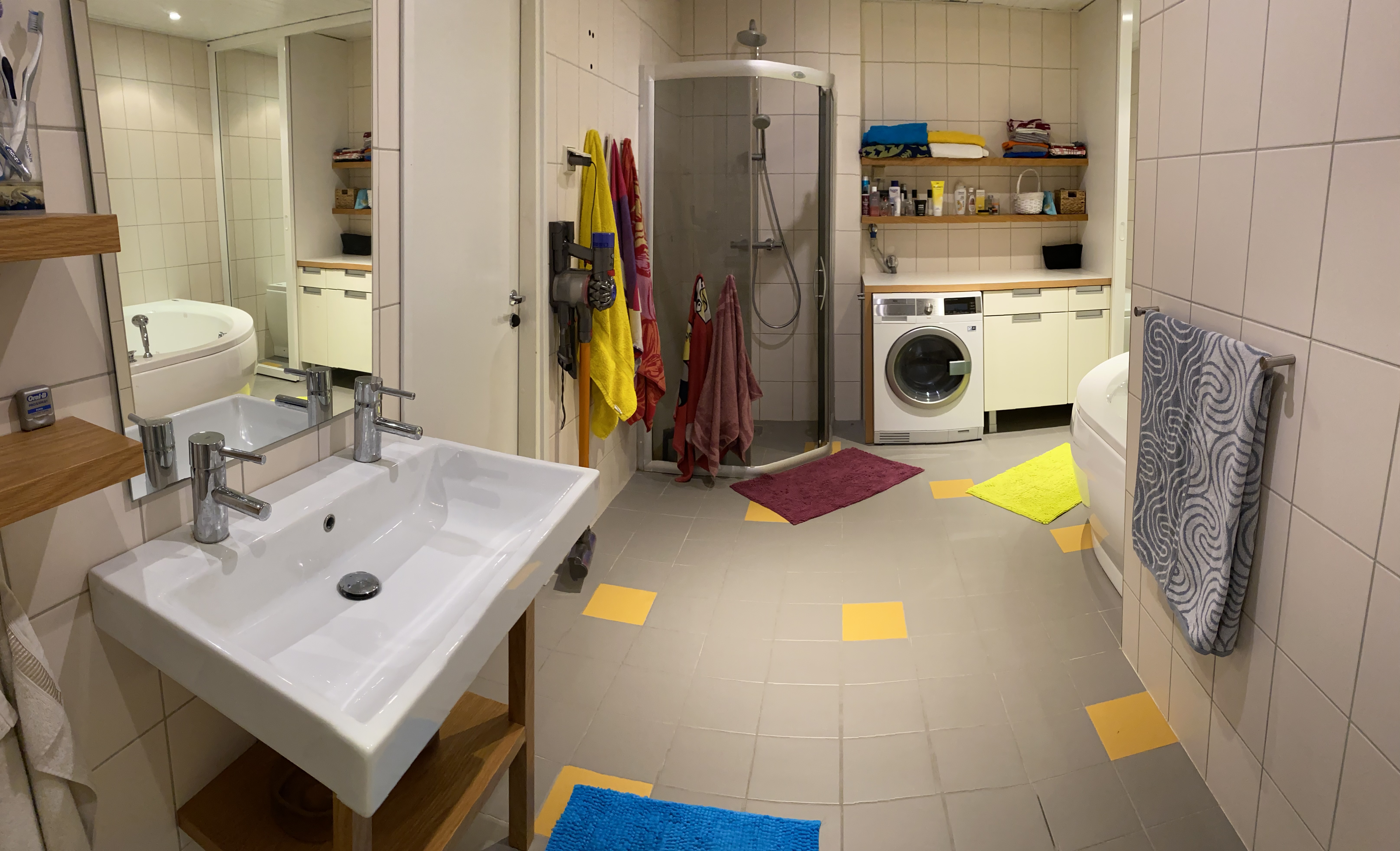 * paigaldada: uued veevõtuotsad, trapid, vajalikul määral vee-ja äravoolu torustikku, elektriühendused ja kaabeldus;, duśśinurk ruumi 1 ja duśśisein ruumi 2 koos segistitega, kaks valamut segistitega, kaks wc potti, põranda- ja seinaplaadid, ripplagi ja vajalikud luugid selles, valgustid, ventilatsiooniavade katted, nagid ja hoidikud, kolm siseust, vannitoa mööbel;