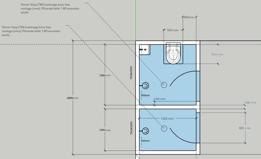 Eesmärk on kõik kenasti paigaldada nii, et (seestpoolt vaadates) oleks suurem osa vee sisselaskeavadest peidetud väljapoole, tagaseina taha. Seoses on kaks duši+valamu+kuivkäimla valatud betoon seintega, seega peate saama puurida läbi armatuuriga valatud betoonseinte.