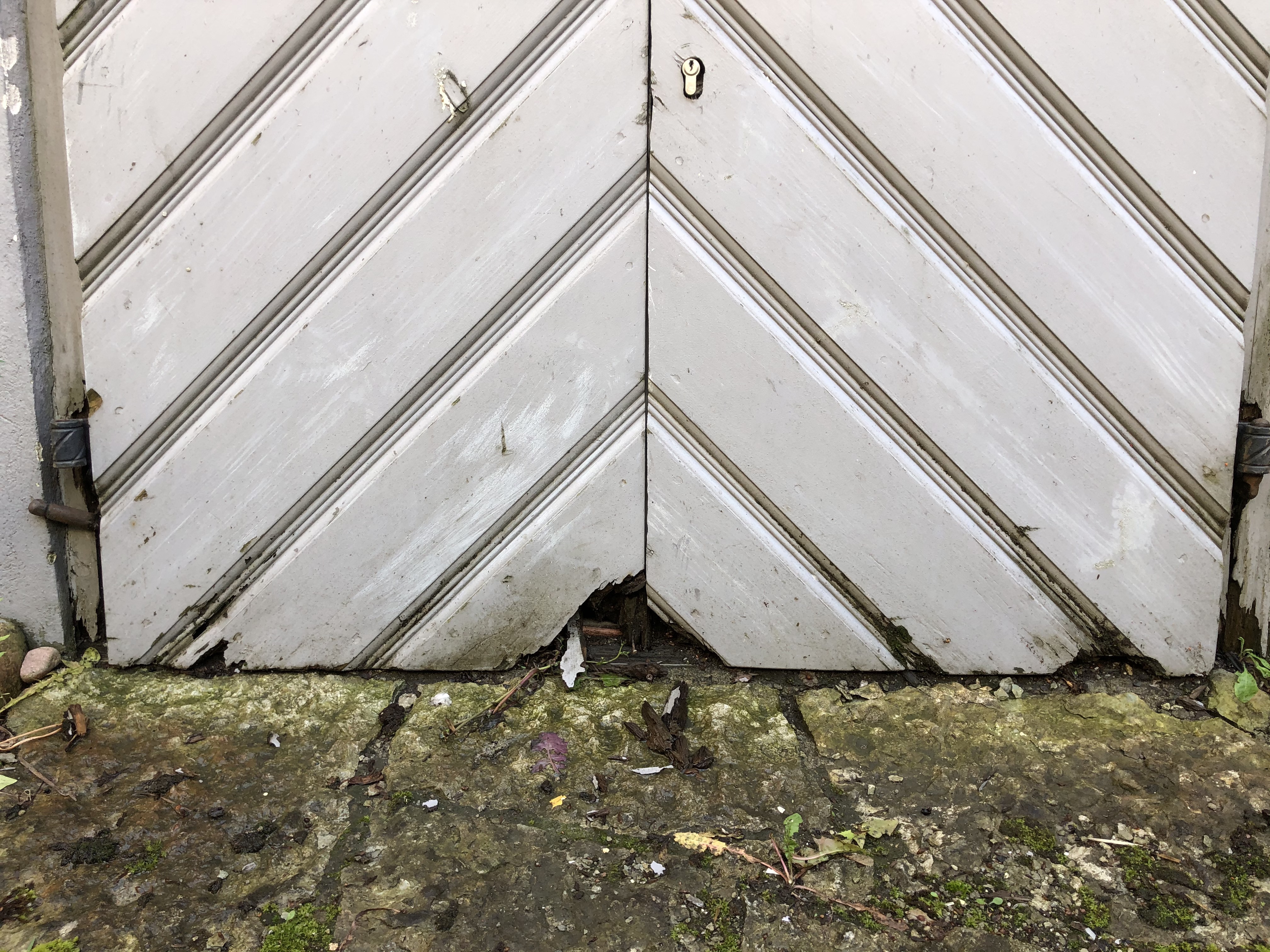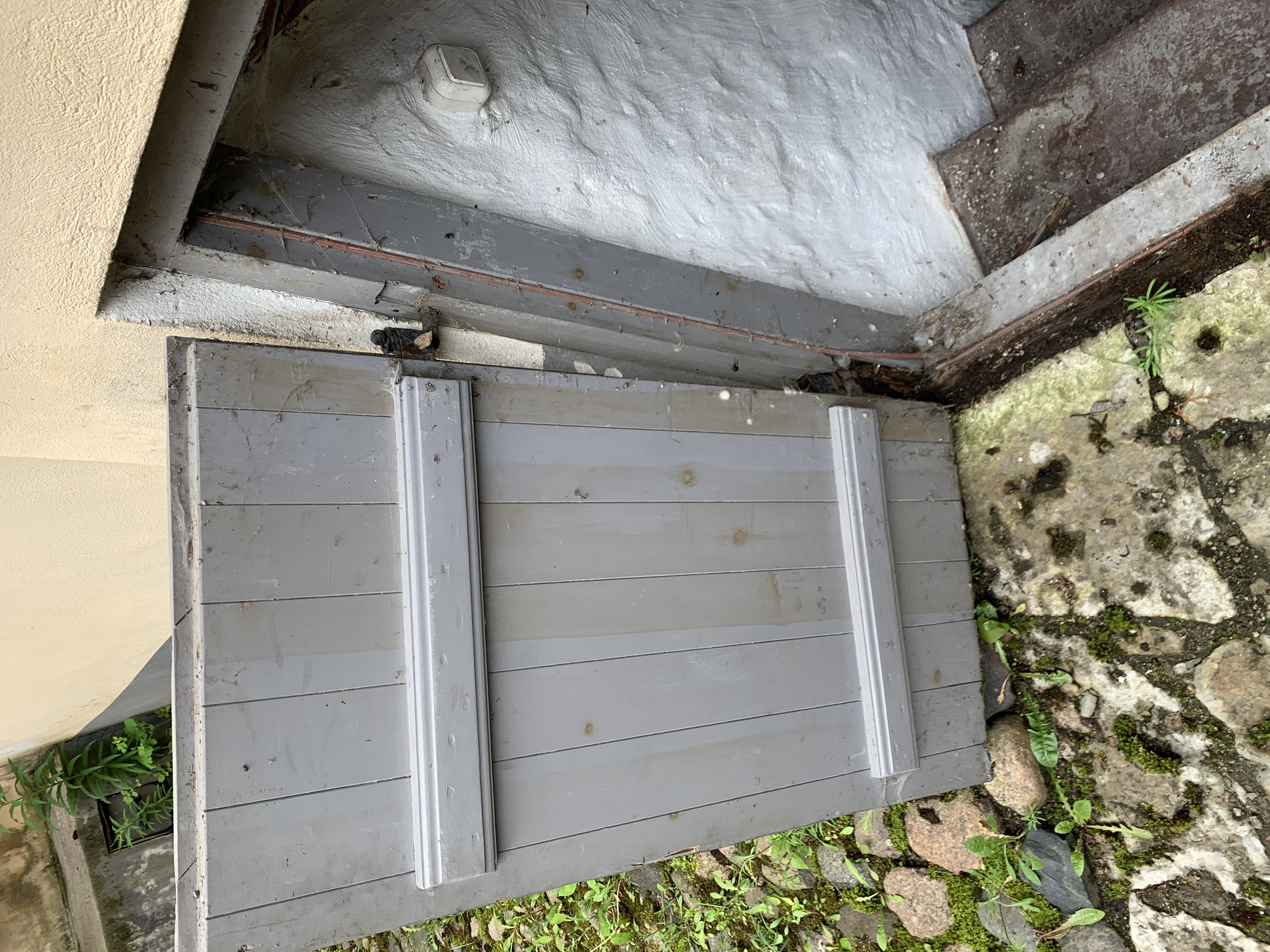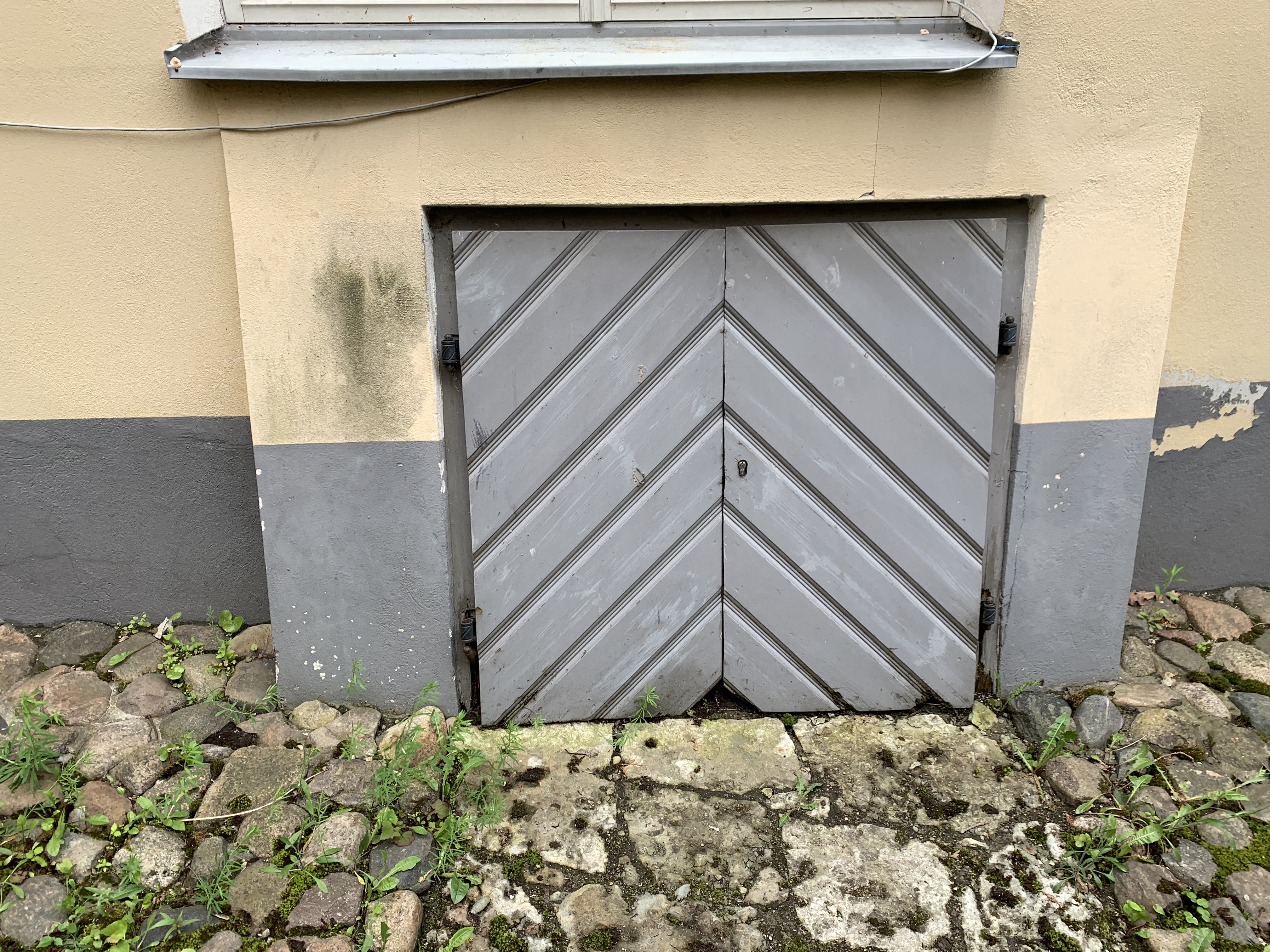 On Tallinnas üks keldri välisuks, mis on ära kulunud. hinged on ära väsinud ja lävepakk alt ka läbi vettinud ja katki. Lisaks on ukse diagonaalsete voodrilaudade alumine osa katki.