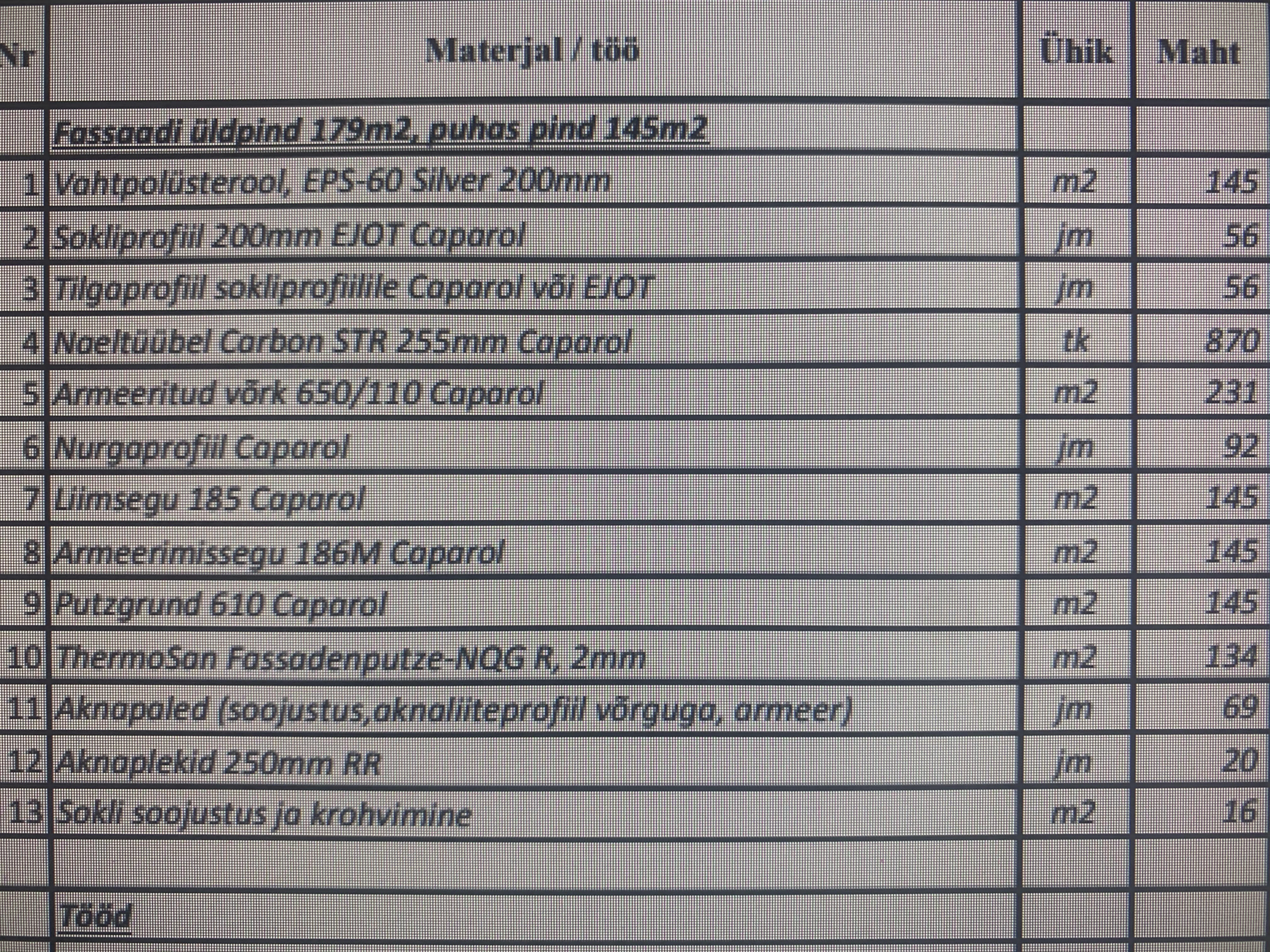 Meiepoolne pakkumine fassaadi soojustamis ja krohvimistöödele 30€ m2 145x28= 4060€ Hinnas soojustuse kleepimine nõuete kohaselt, tüübeldamine, armeerimine, ja struktuurkrohv. Arvega tasumisel lisandub hinnale käibemaks. Materjalid tellija poolt, samuti vajaminevad ehitustellingud. Tööde teostamise aeg augustikuu. Teeme pakkumise ka katusetöödele, neid saaksime teostada paralleelselt fassaadiga . Tervitades Veiko |