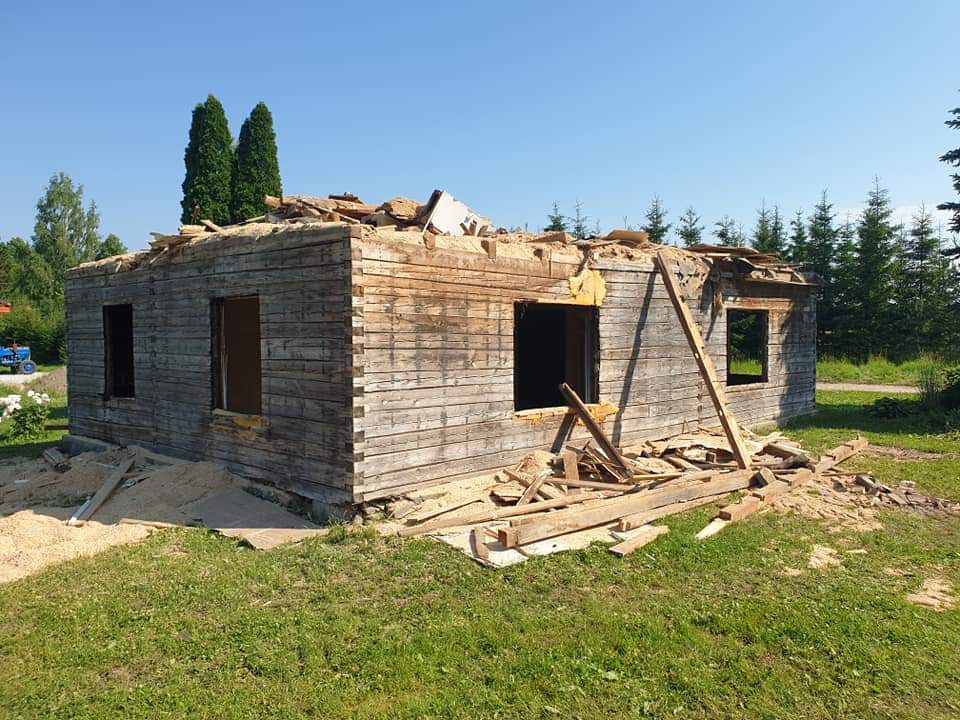 Palkmaja seinad nummerdada ja ladustada iga sein eraldi pakina. Ladustada maja ette tee äärde. Töö alguseks on lae pealne puhastatud.