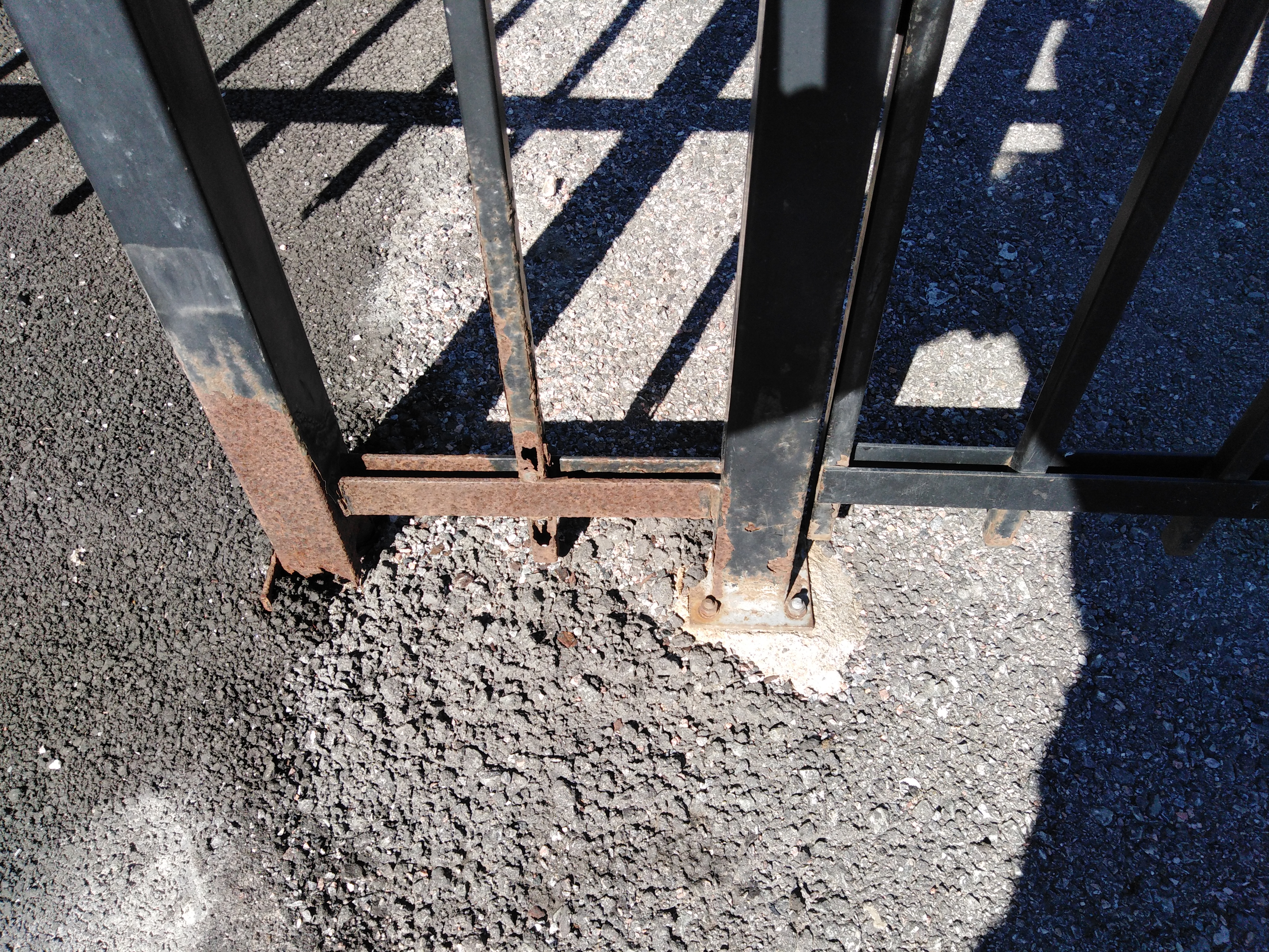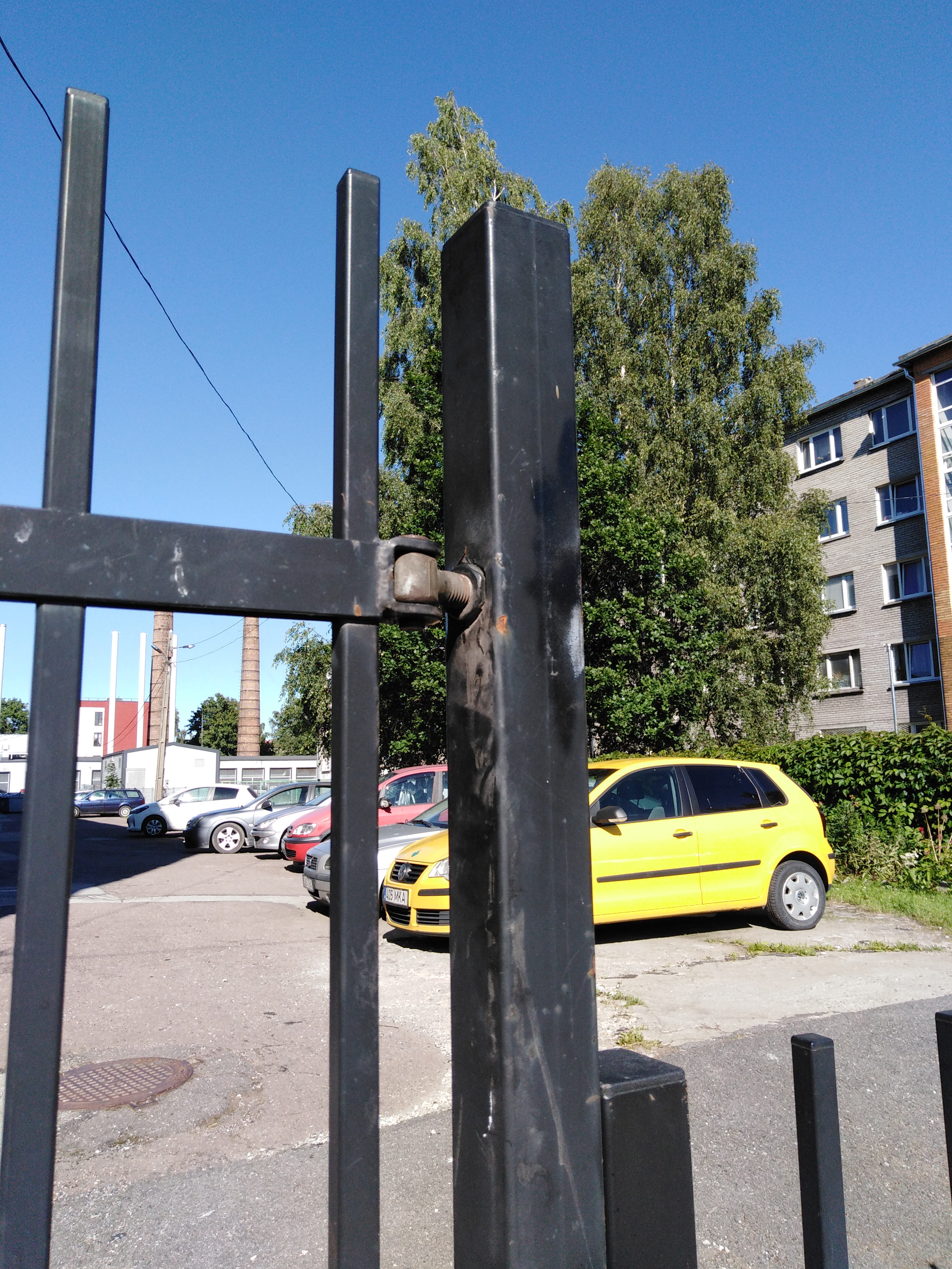 Aed kõigub, sest luku kinnitusposti kõrval asuva posti juurest eemaldati betoonserv, mille vastu ta toetus ja ei olnud iseseisvalt maapinnale kinnitatud. Alumine ots läbi roostetanud. Ilmselt tuleks mingi tald külge keevitada ja see ühendada maapinnaga. Hinged on ka väsinud väraval ja needki tuleks välja vahetada.