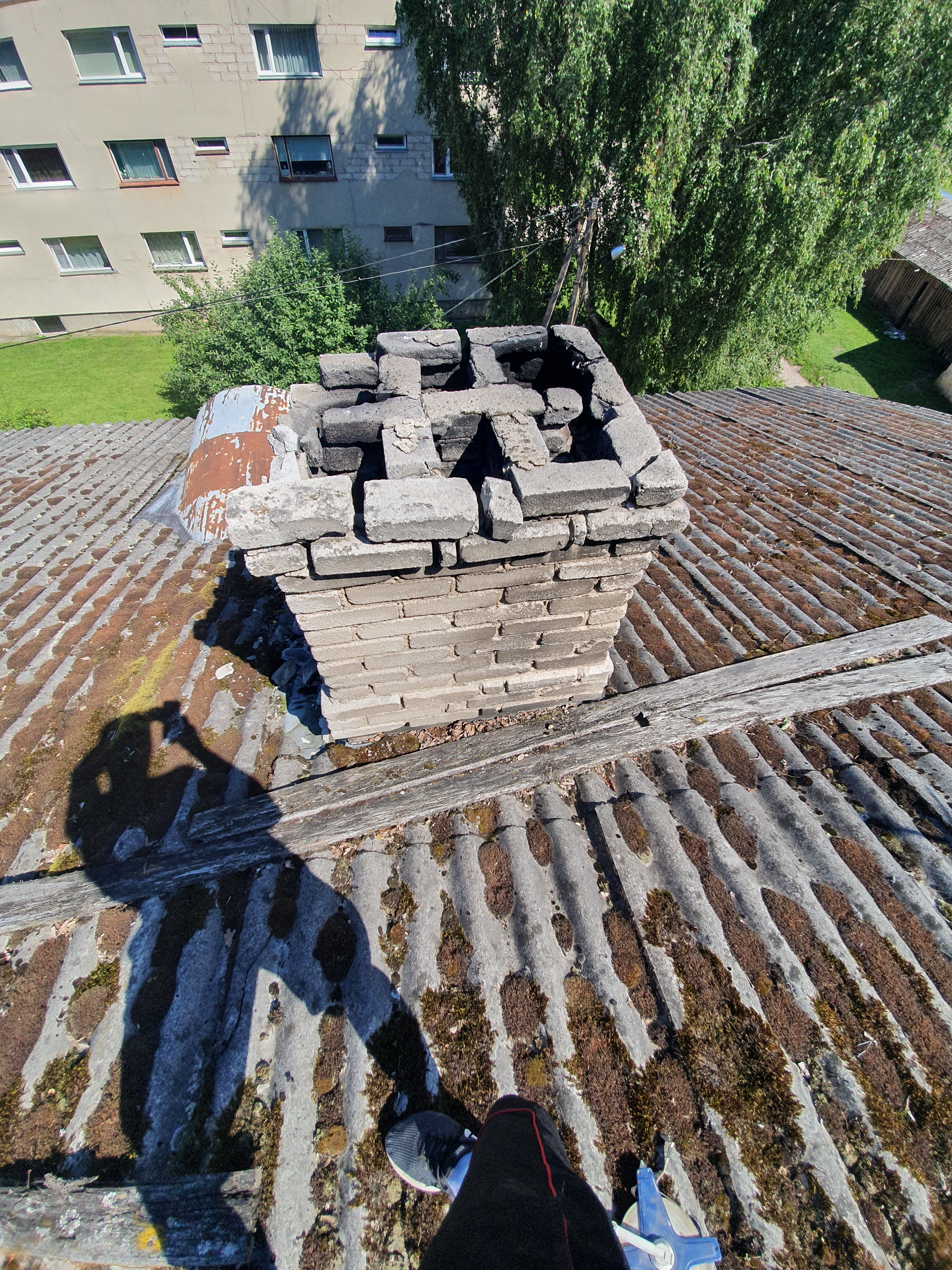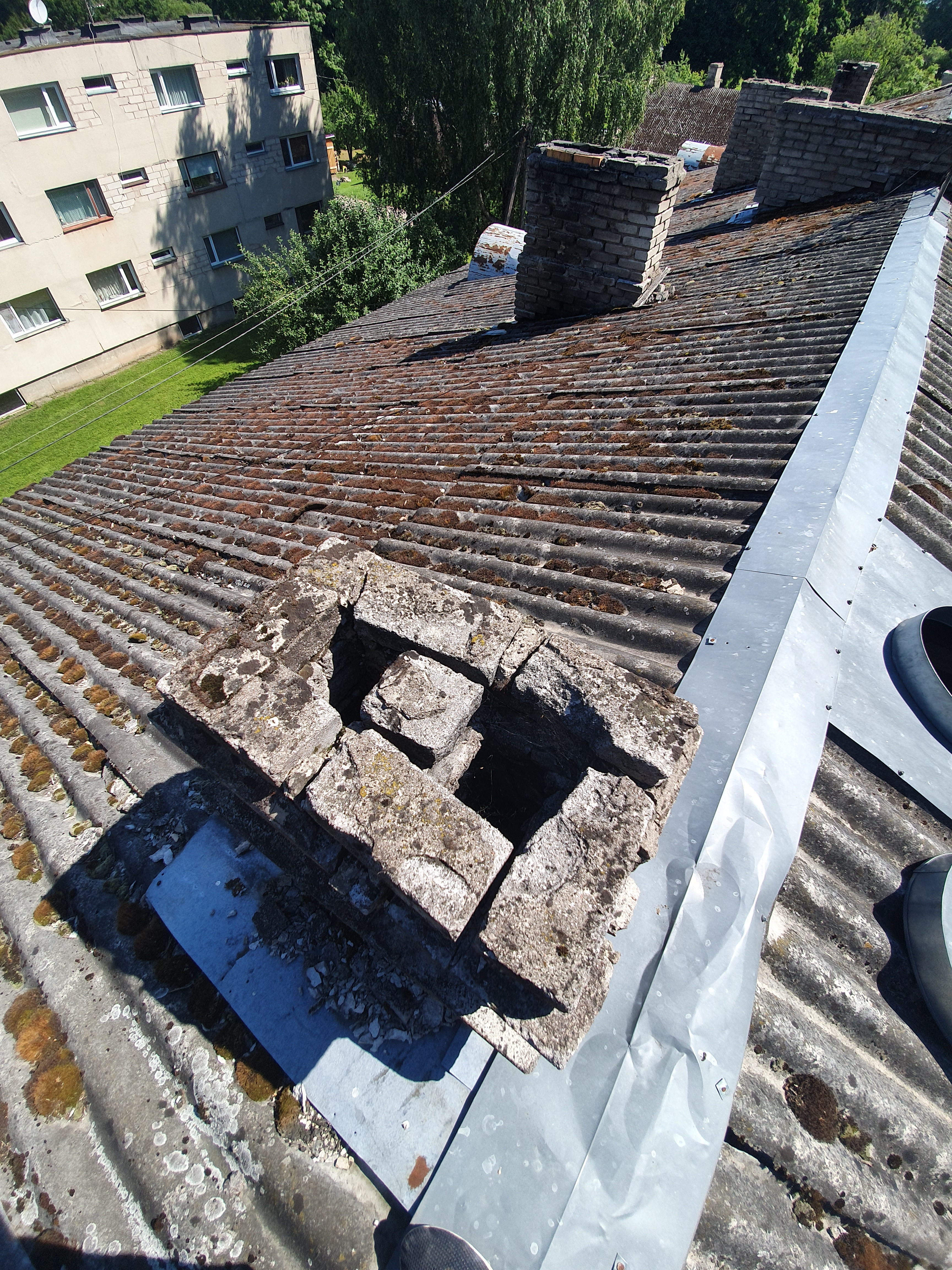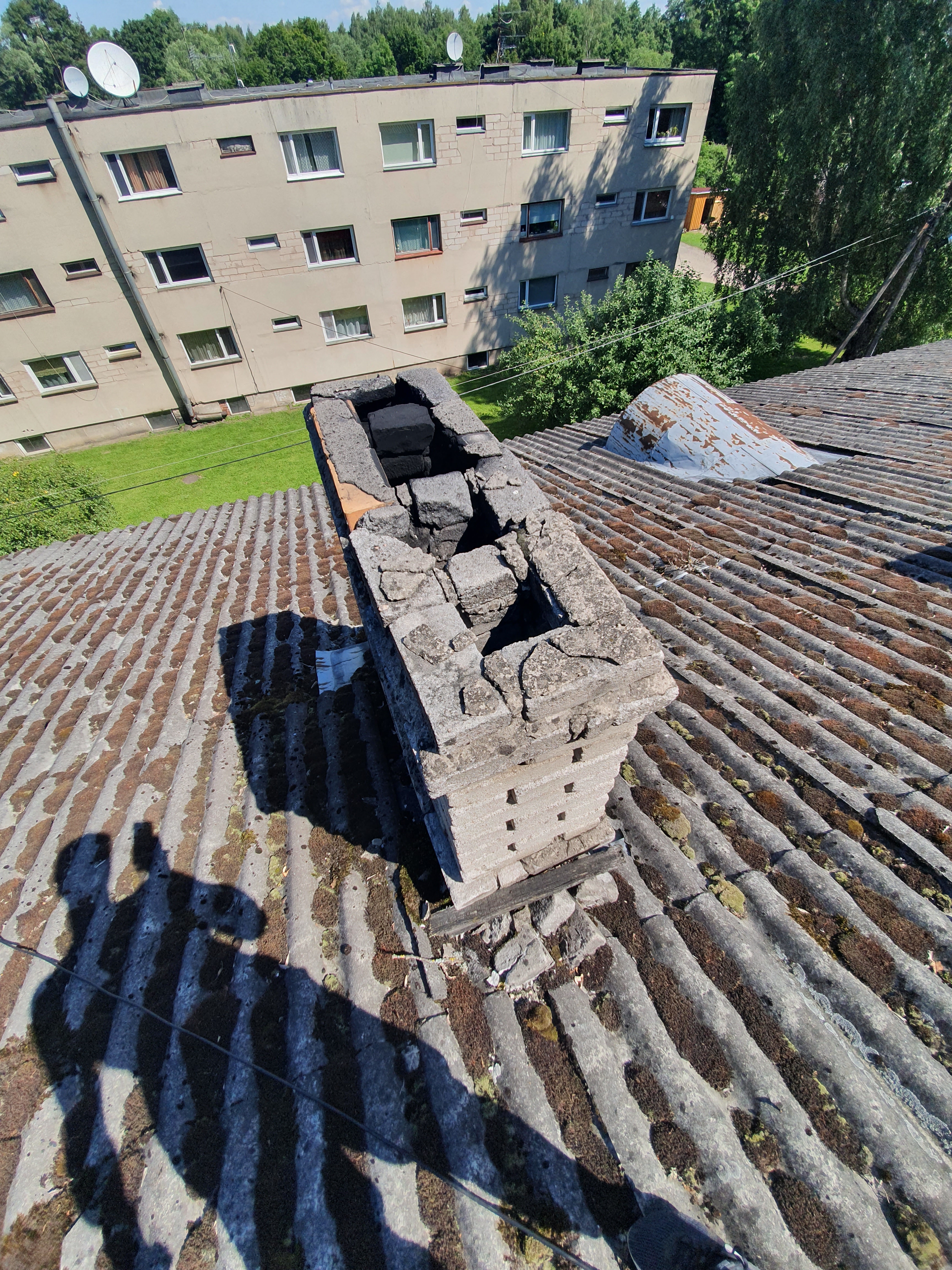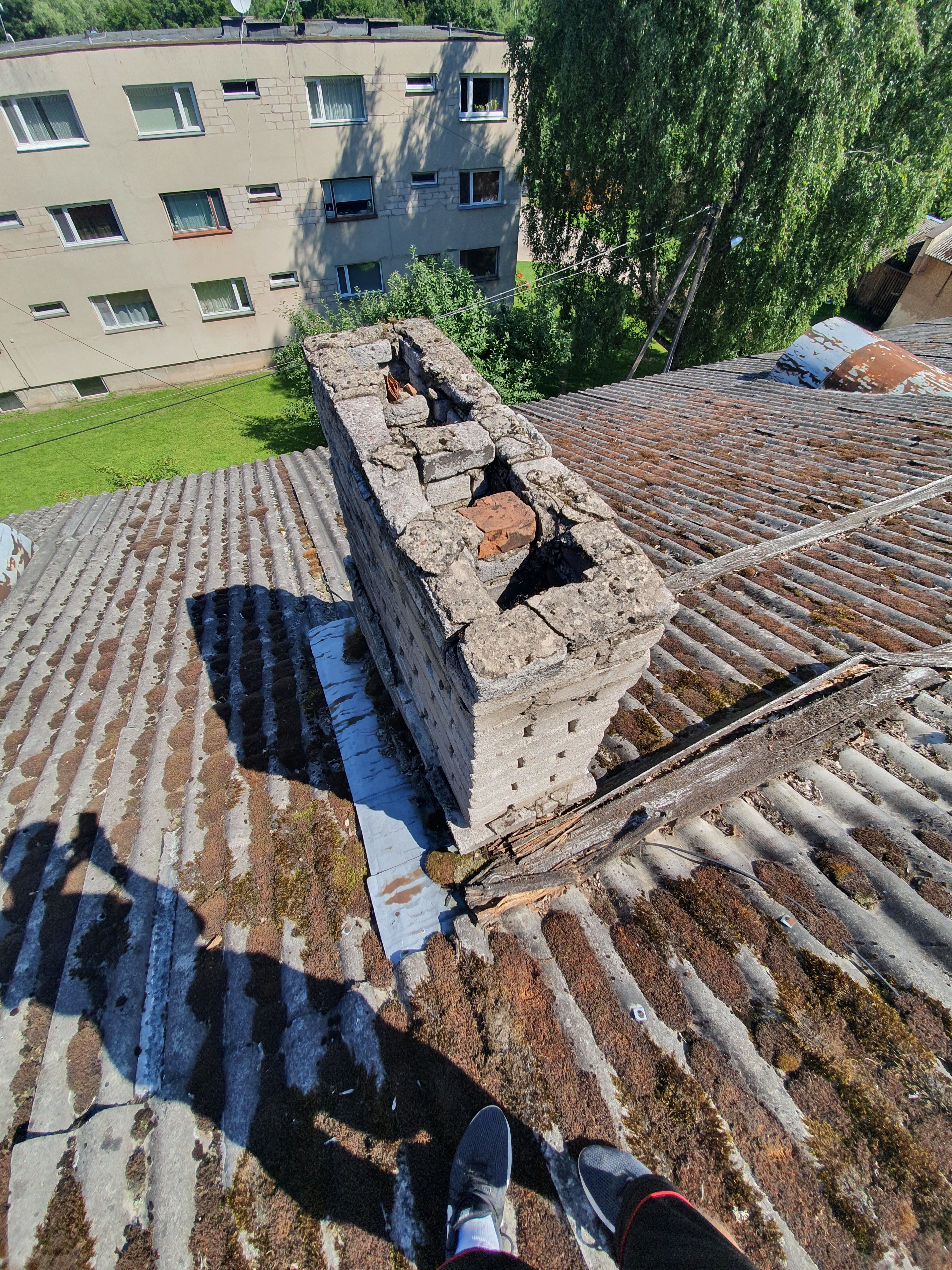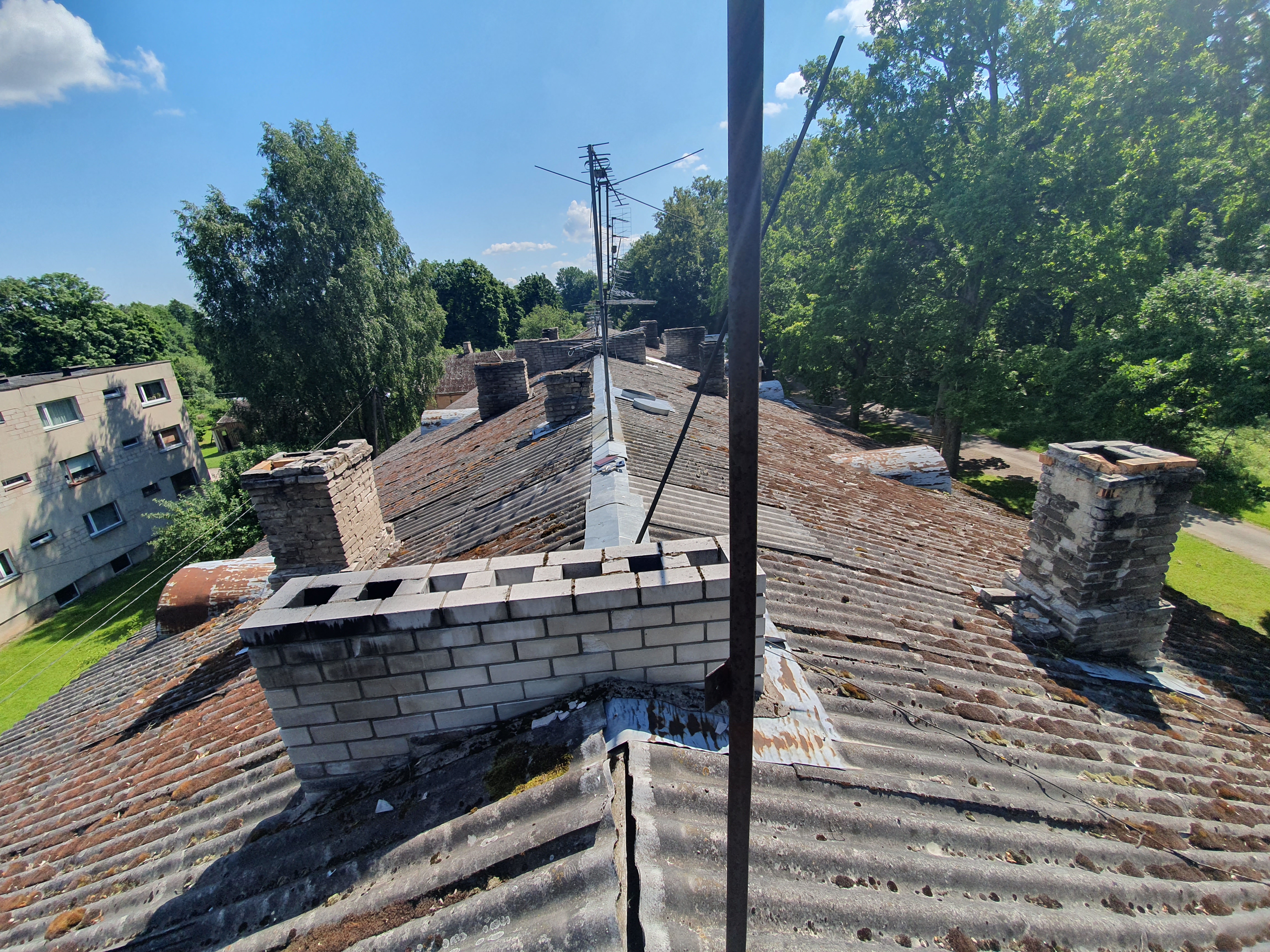 Vana katuse renoveerimine. Eterniit ja roov maha. Sarikaid ja vööd vaja kohati plommida või völja vahetada. vanad korstnapitsid vaja lammutada ja laduda uued. Keskmine korstnapitsi kõrgus 1,3-1,4 m.