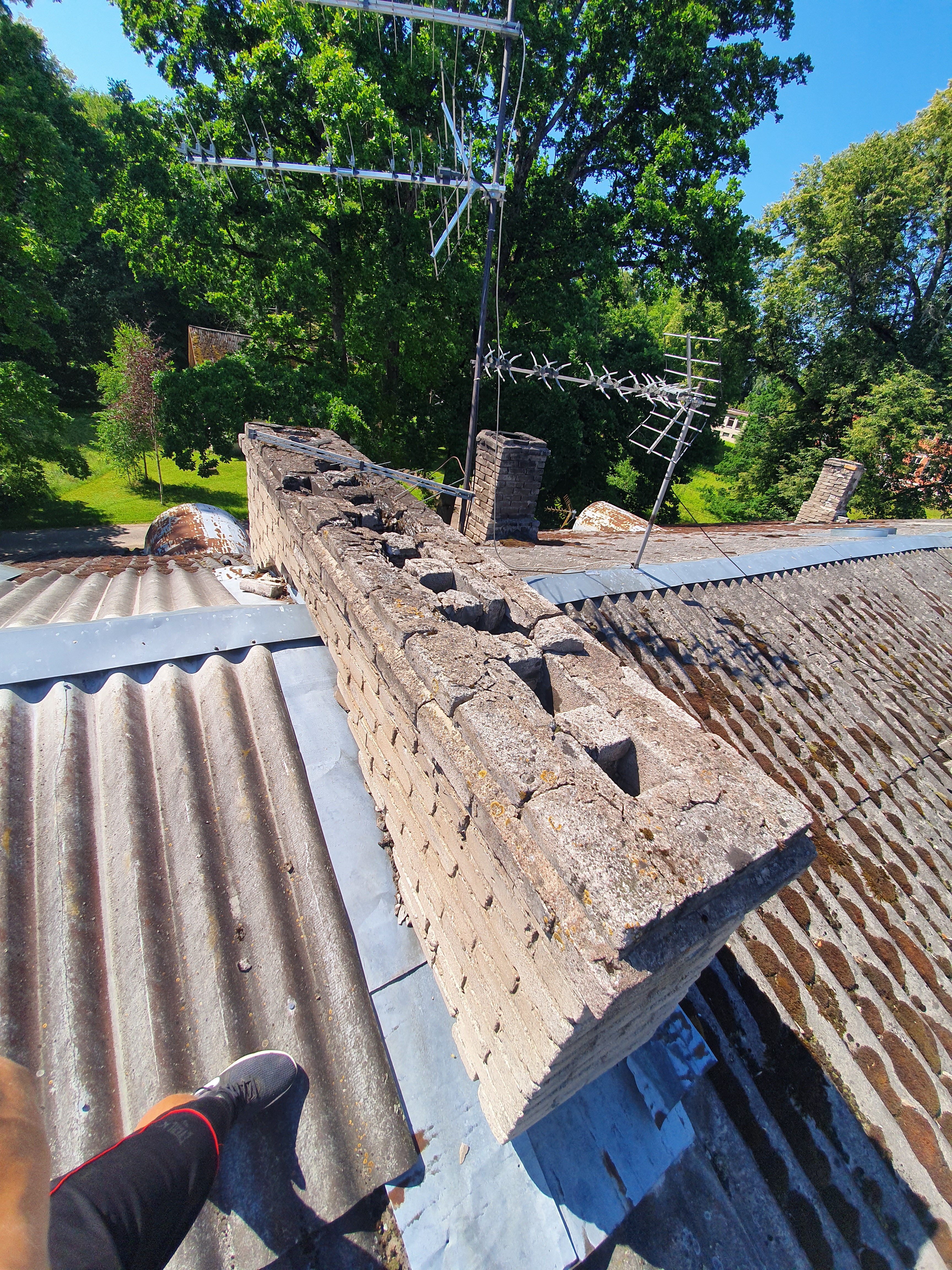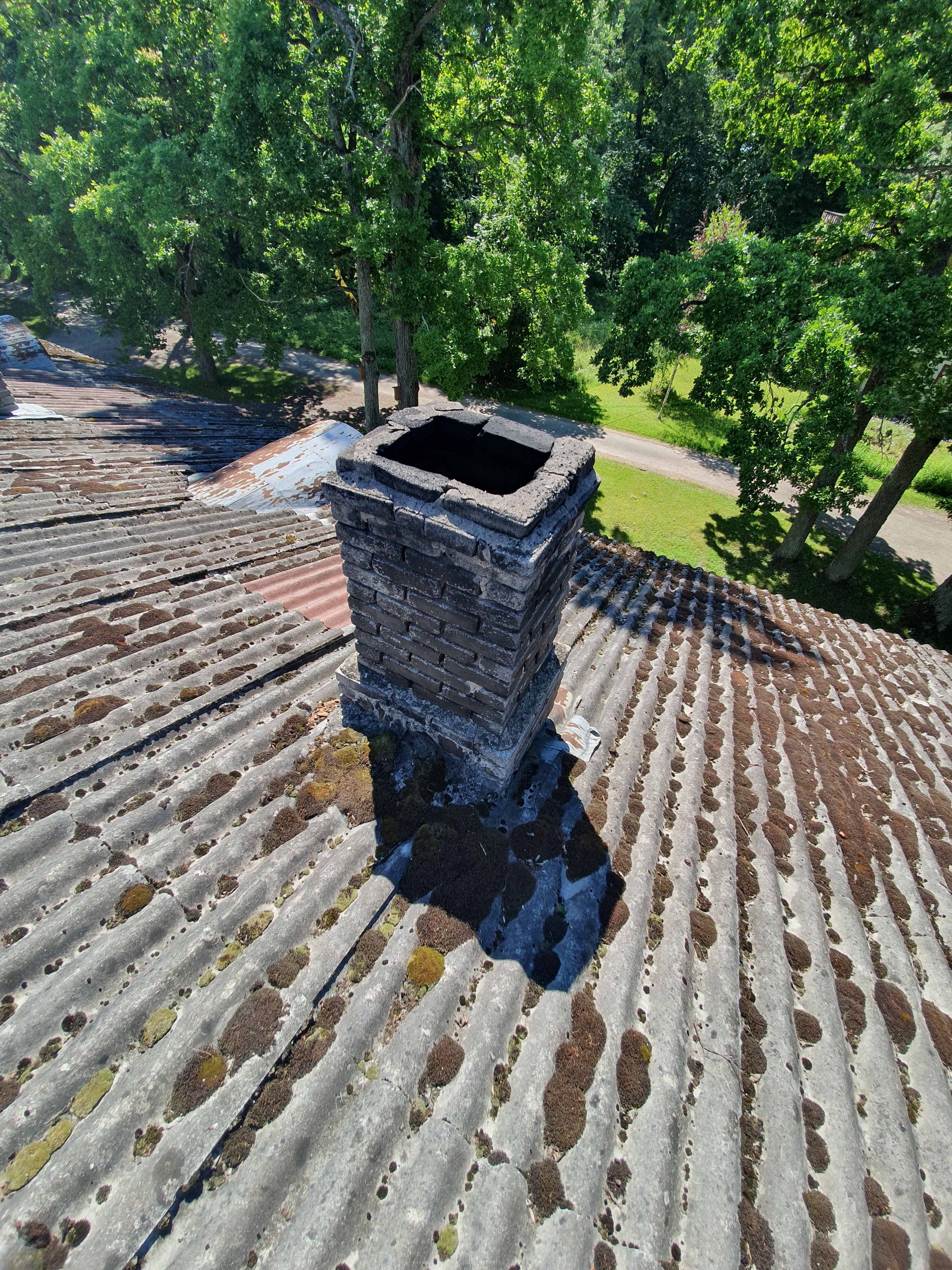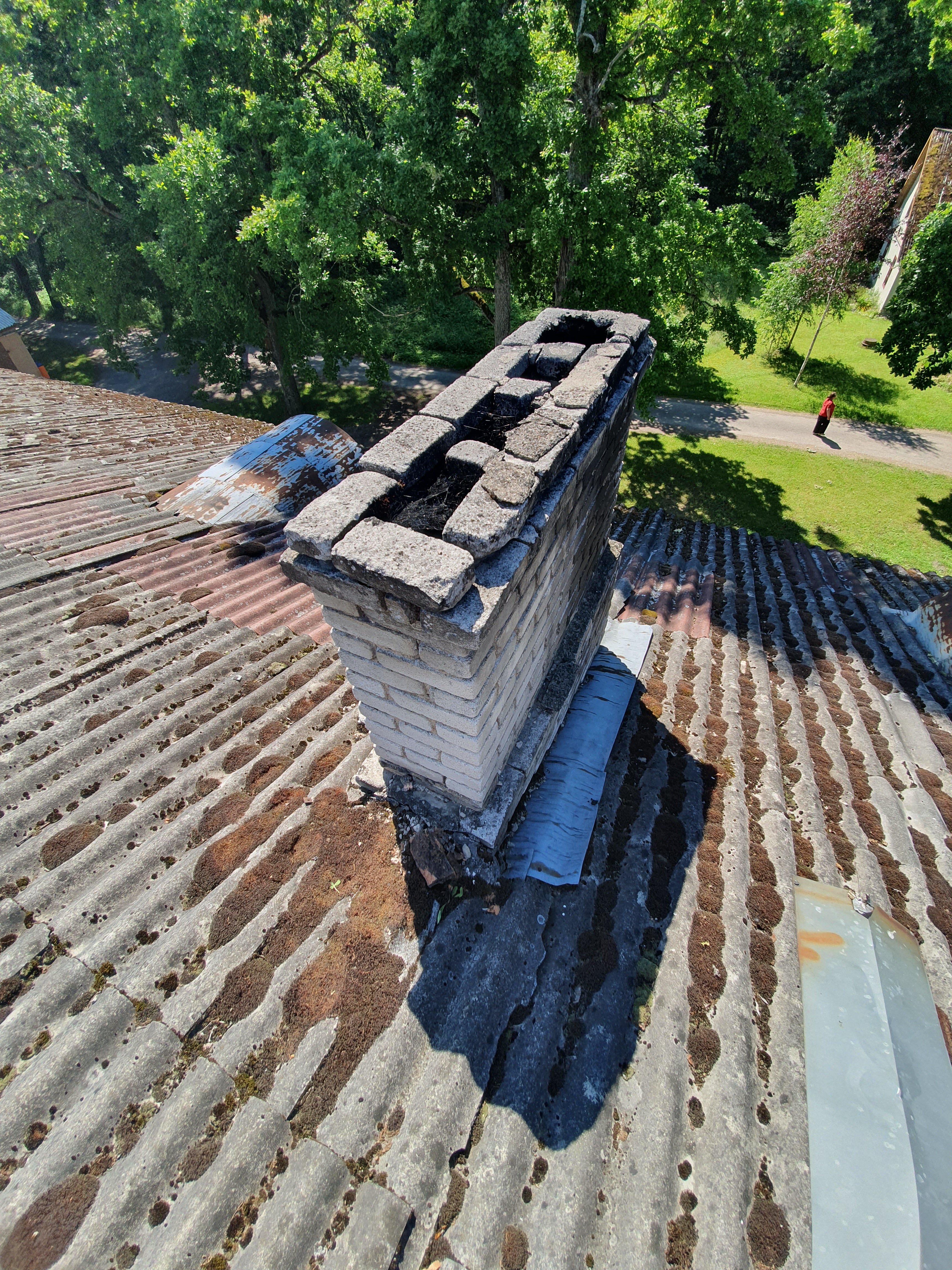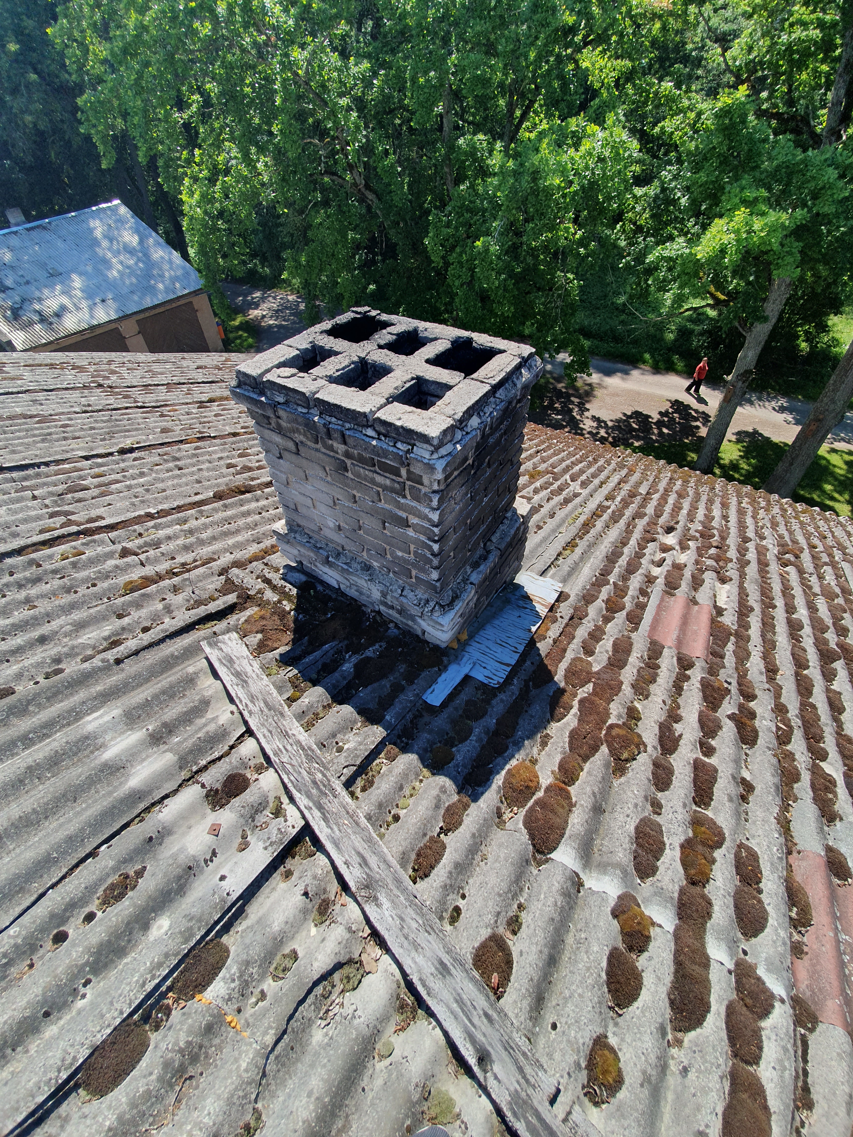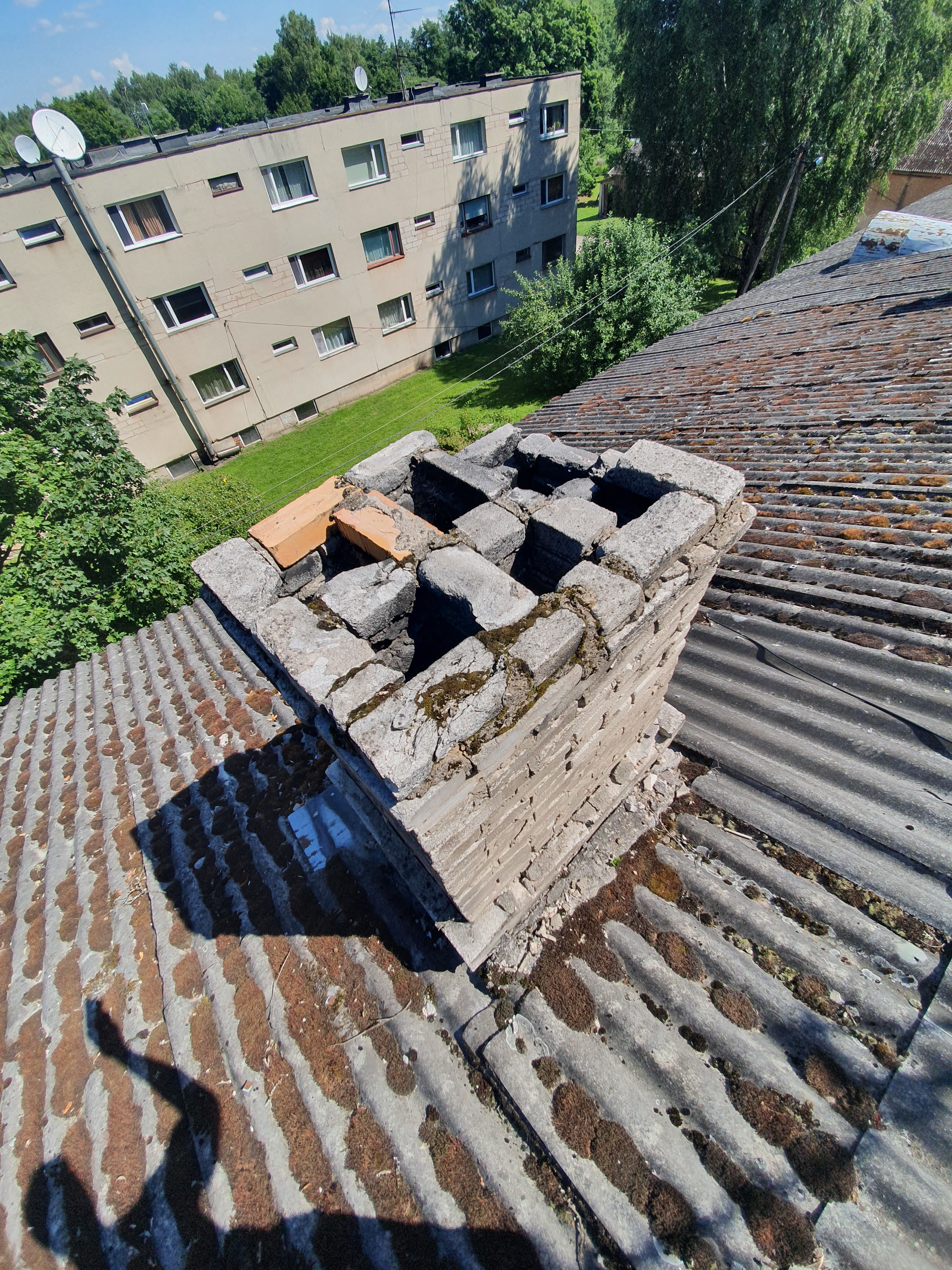 Vana katuse renoveerimine. Eterniit ja roov maha. Sarikaid ja vööd vaja kohati plommida või völja vahetada. vanad korstnapitsid vaja lammutada ja laduda uued. Keskmine korstnapitsi kõrgus 1,3-1,4 m.