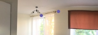 Manuses on kaks pilti. Kips seinal on vigastused, mis on tingitud valesti paigaldatus kardina puu tõttu. Kardina kinnitusest paremal pool seina peal on teine uus vigastus, mis on märgitus teisel pildil. Milline on töö maksumus defektide likvideerimise puhul. Värvi numbrit ei ole, tuleb leida sarnast.
