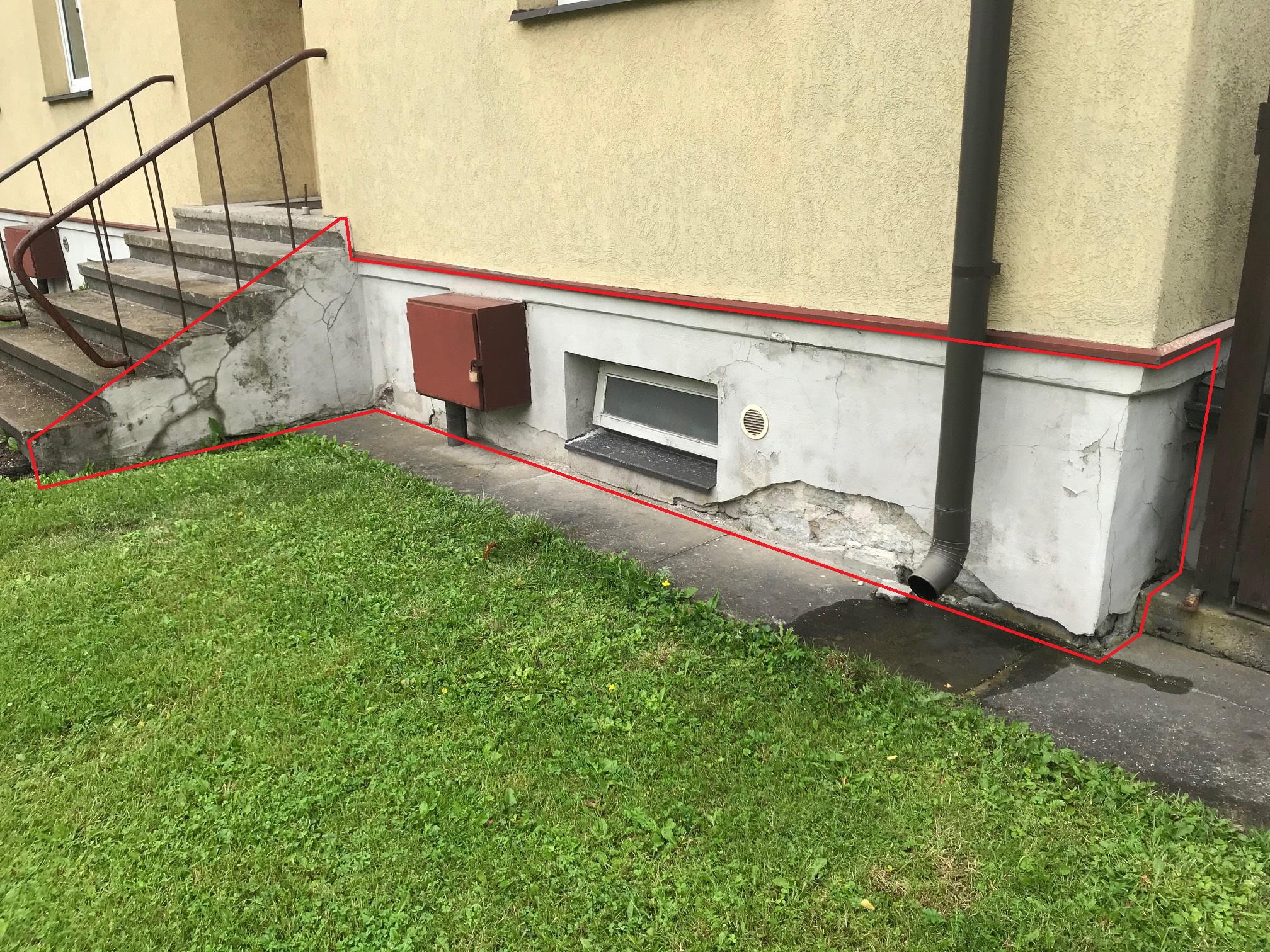 4. Krohvimistööd nii vundamendil kui trepi küljel (vt. pilti - märgitud punasega) - kokku 6 m2