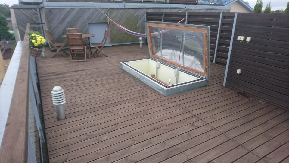 2. Uue roovituse paigaldus ja rihtimine 420 eurot 3. Uuue laudise paigaldus 840 eurot. 4. Valgustite vahetus 150 eurot Kokku 1830 eurot. Soovitaks panna uue roovituse samast materjalist ikka ja ilmselt vana roovitus ei ole sobiva sammuga ka(350mm). Eelmine suvi vahetasime katuseterrasi lauad välja Inglise kolledzil. Seal õnnestus uued lauad kraana autoga toomisel ka katusele tõsta. Aga see juba oleneb ligi pääsust. |