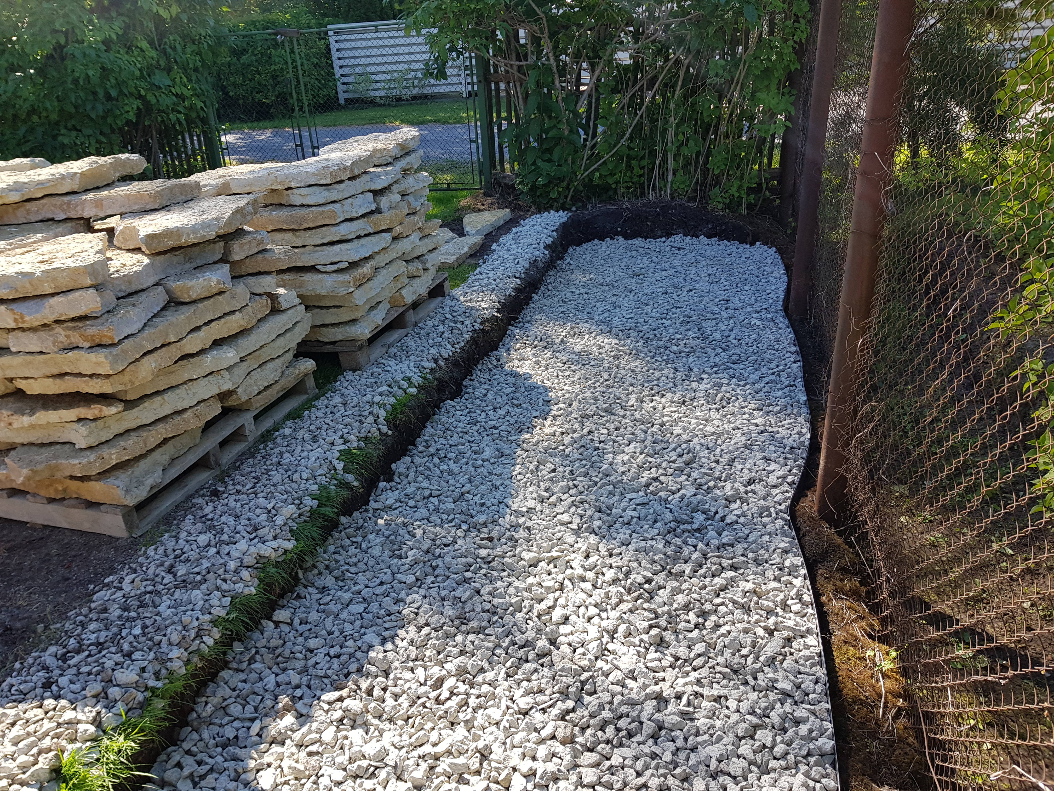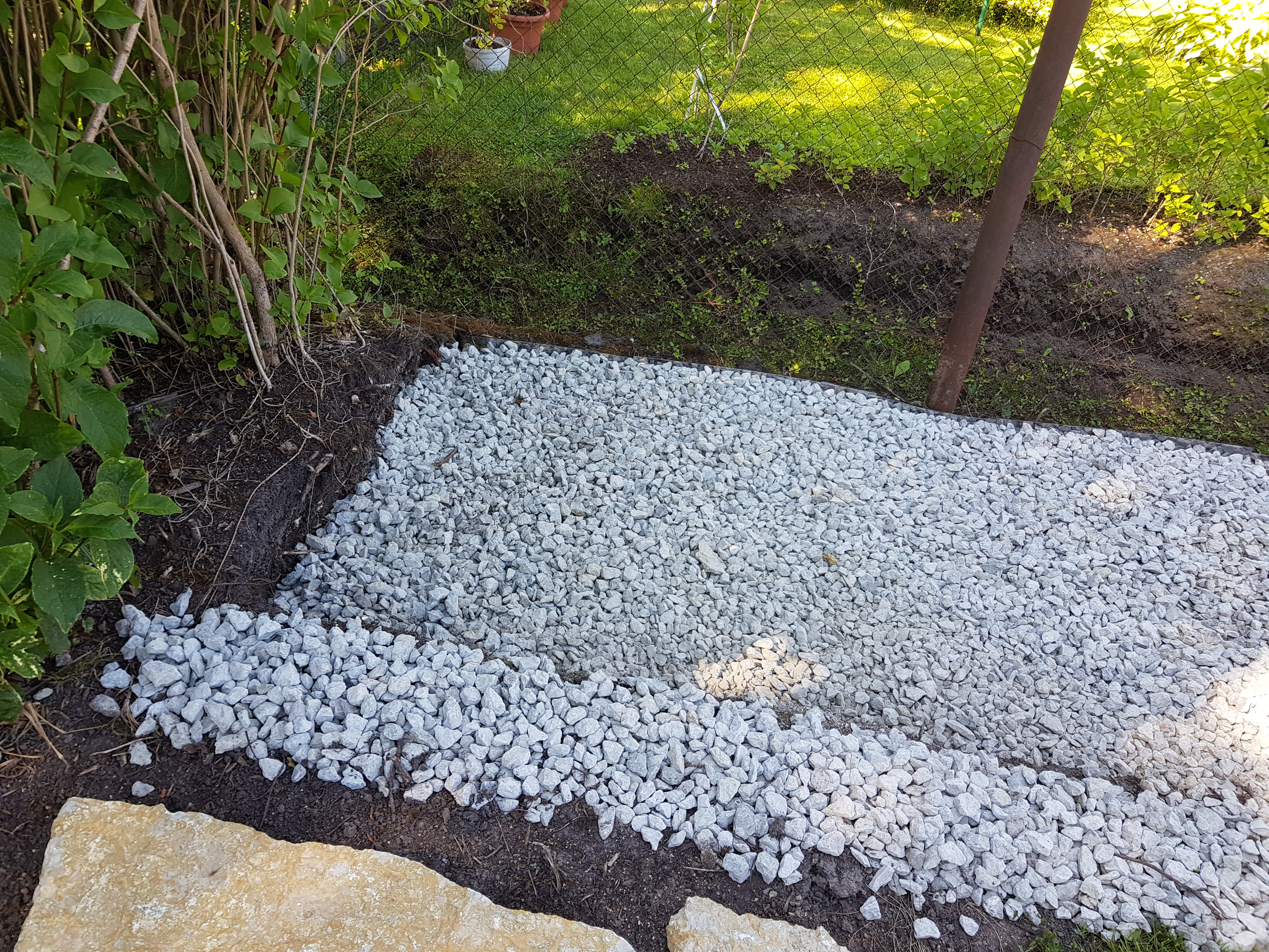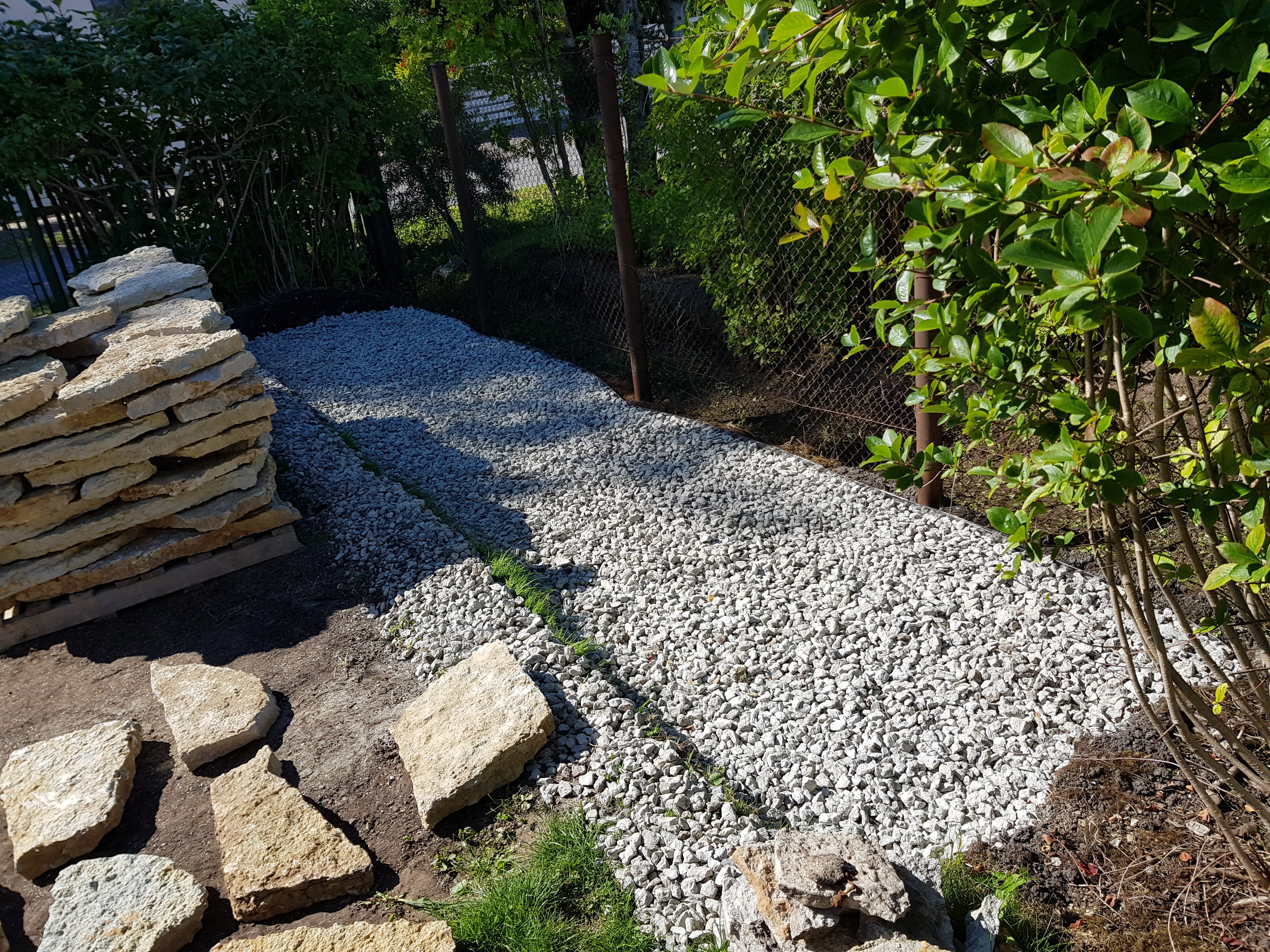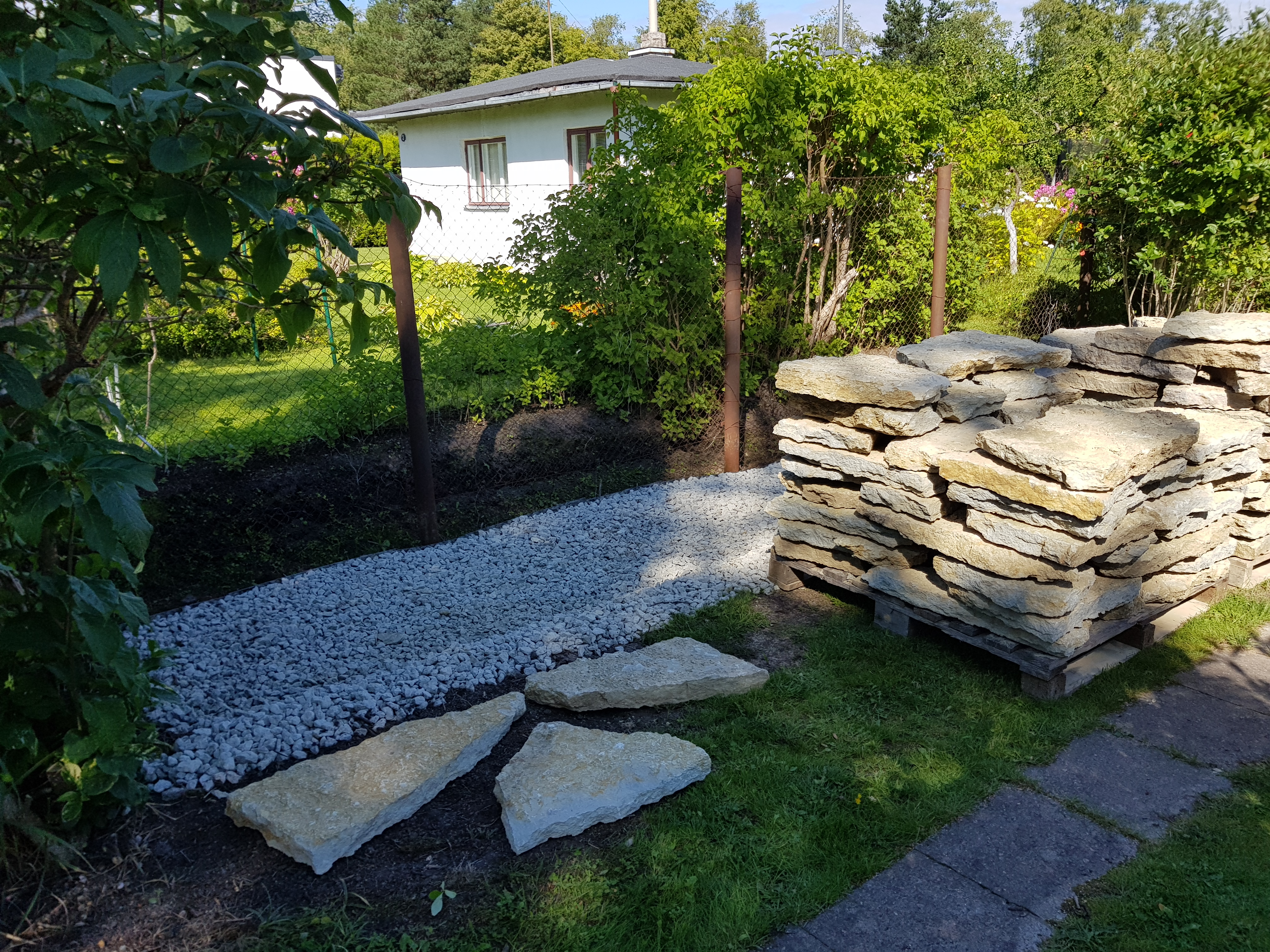 Vaja laduda 5...7 cm paksustest vabakujulistest paekivitükkidest ristkülikukujuline peenraserv/müür - tagumine osa (vastu võrkaeda) kõrgusega ~45 cm (pikkus 7 m), esimene osa kõrgusega ~30 cm (pikkus 7 m), mõlemad küljed (ühe pikkus ~1,2 m) kõrgusega ~45 cm. Tagumine osa hakkab toetuma killustikule, esimene osa pinnasest kõrgendi peale. Paekivid olemas. Peenraserv/müür laduda ilma seguta. Mõlema müüri paksus ~40 cm. Osad kivid liiga rasked üksinda tõstmiseks. Asukoht: Muuga