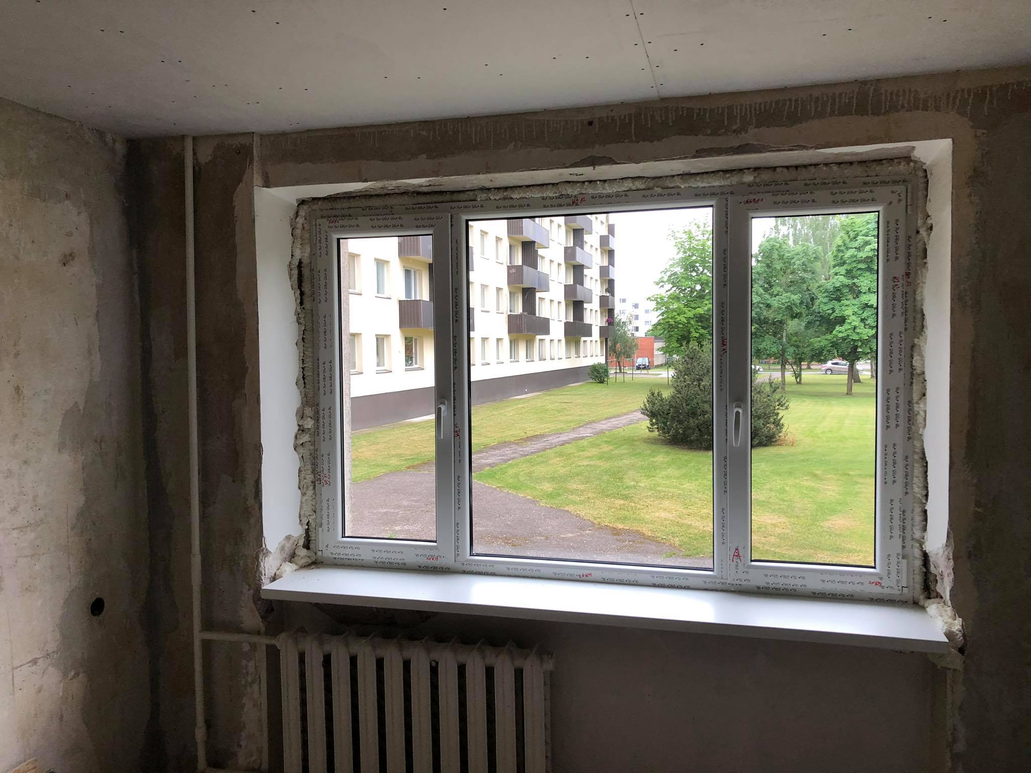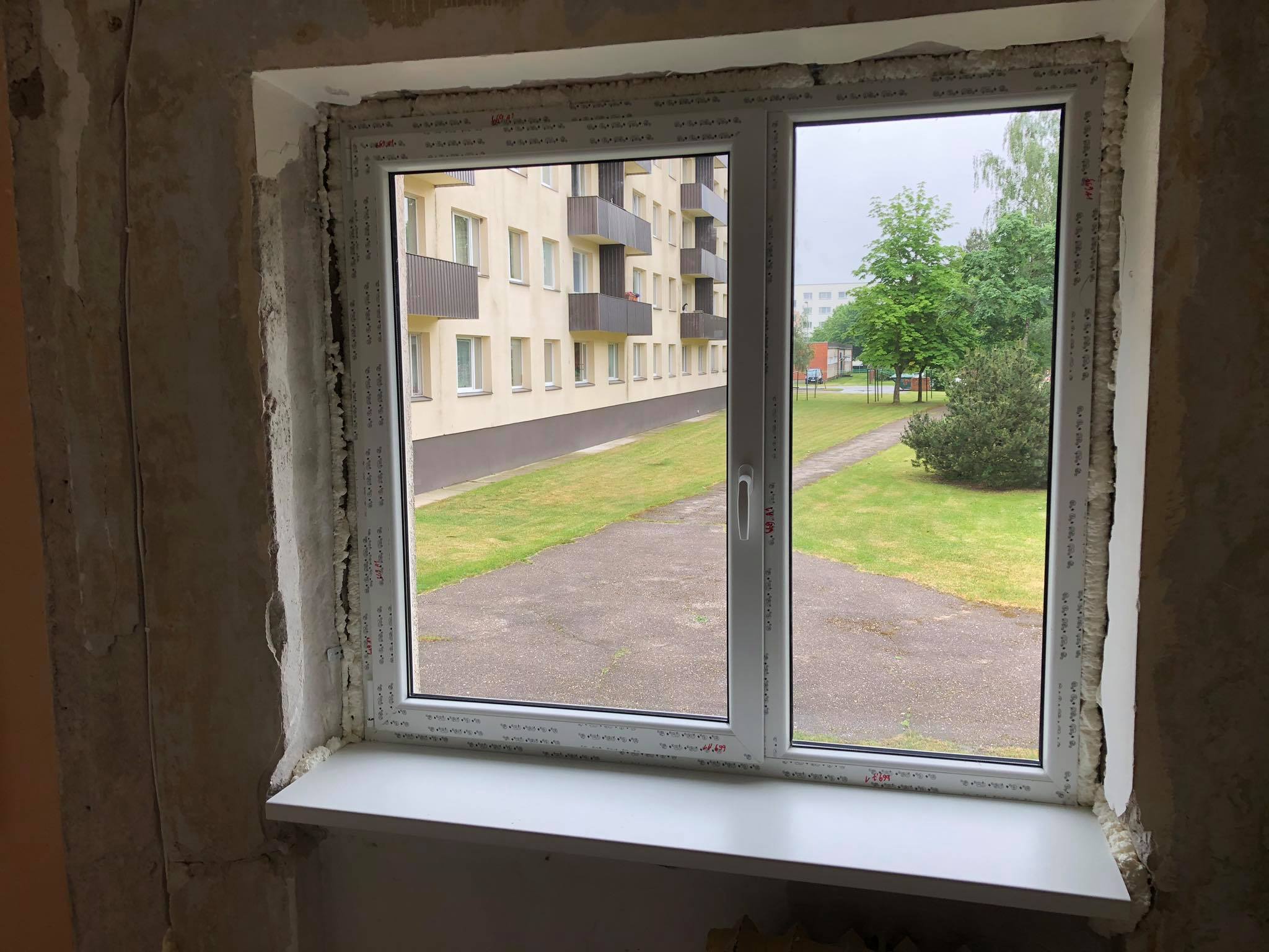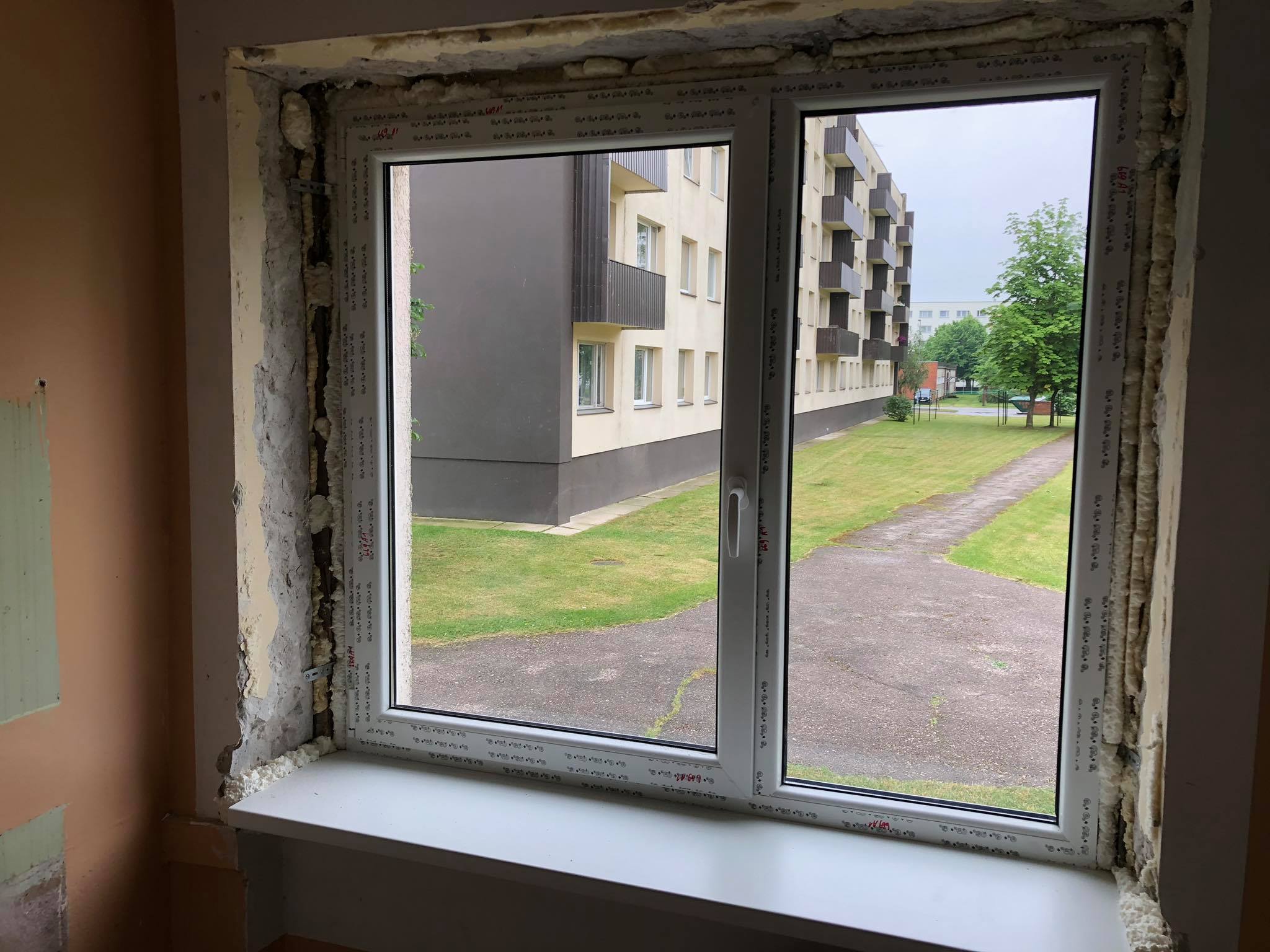 a). teostatakse 3 akna- ja 1 välisukse palede viimistlustööd. Jm arv 3 akna osas umbes 18 m ja välisukse osas umbes 4 m. Kokku 22 jm