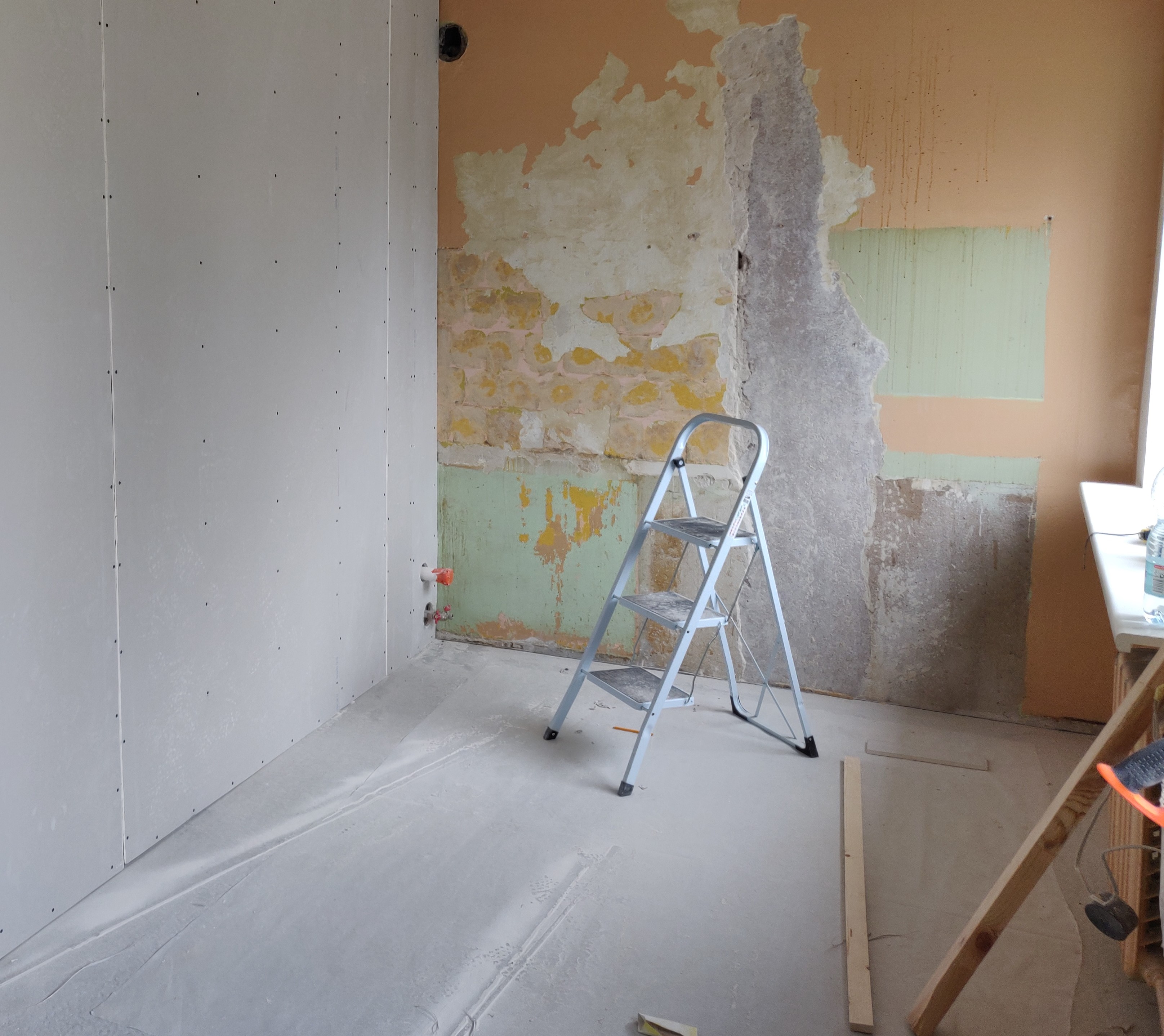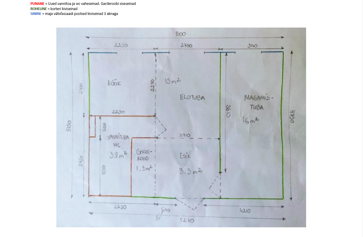 c). pahteldada ja kruntvärvida seinad (vt joonisel roheline, sinine, punane ala). Seinte kogupind umbes 40 m ja kõrgus 2,4 m. Kokku 96 m2.