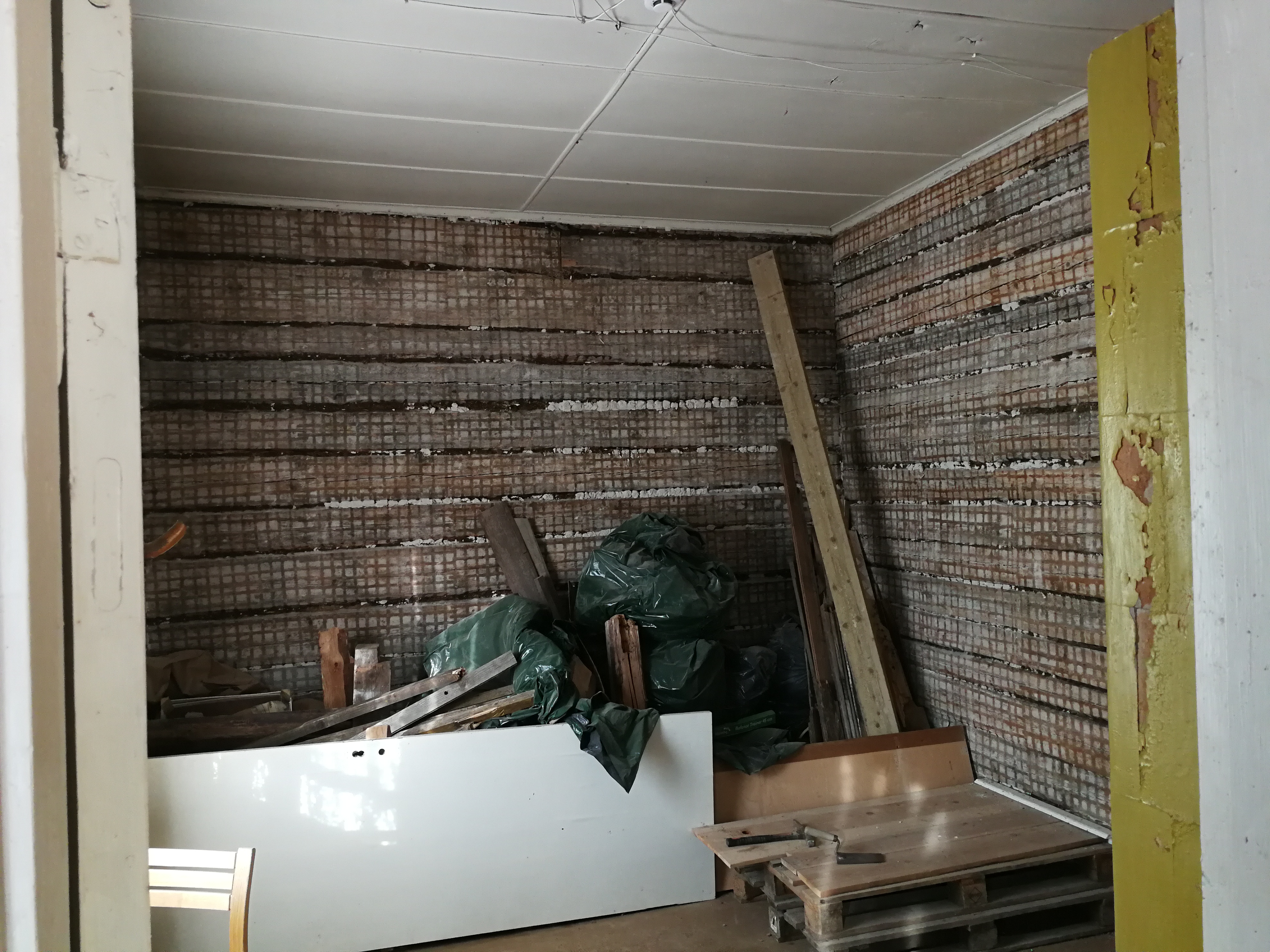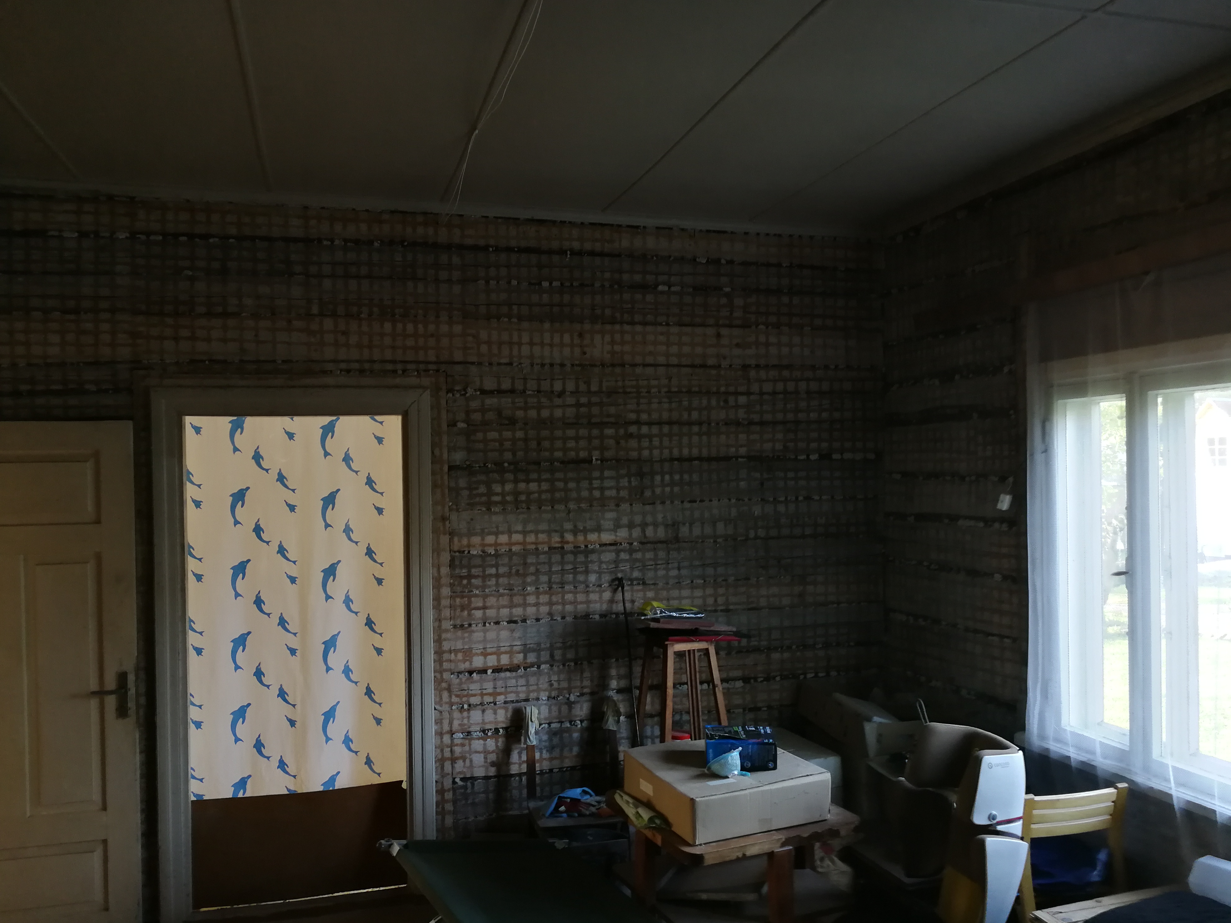 8. Kipsplaadist metallkarkassile ehitatud seinad/kaldseinad ja laed I ja II korrusel. Kogupindala kipsplaadiga kaetult u. 300 m2, koos metallkarkassi, katuslae ristsõrestiku puit, soojustus ja müravill, pahteldus, värvimine. Teise korruse tubade küljel olev katusealune kaldsein läheb alla ühtlaselt kuni põrandani, vertikaalset seina ei teki.