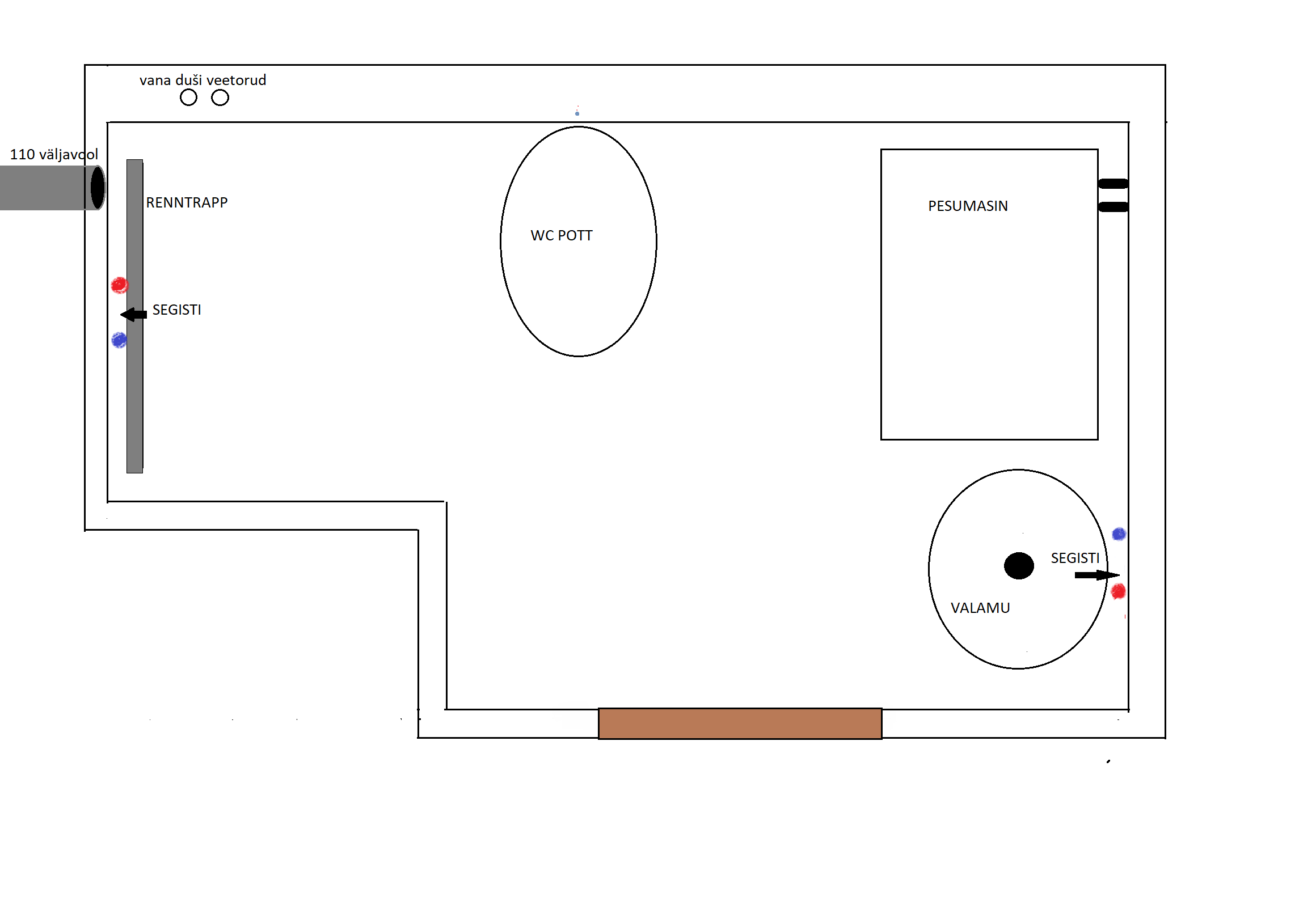 Lisasin ka joonise, et ära märkida kus saab olema kraanikauss, pesumasin, wc-pott ja dušš mis kõik vee sisse- ja väljavoolu vajavad.