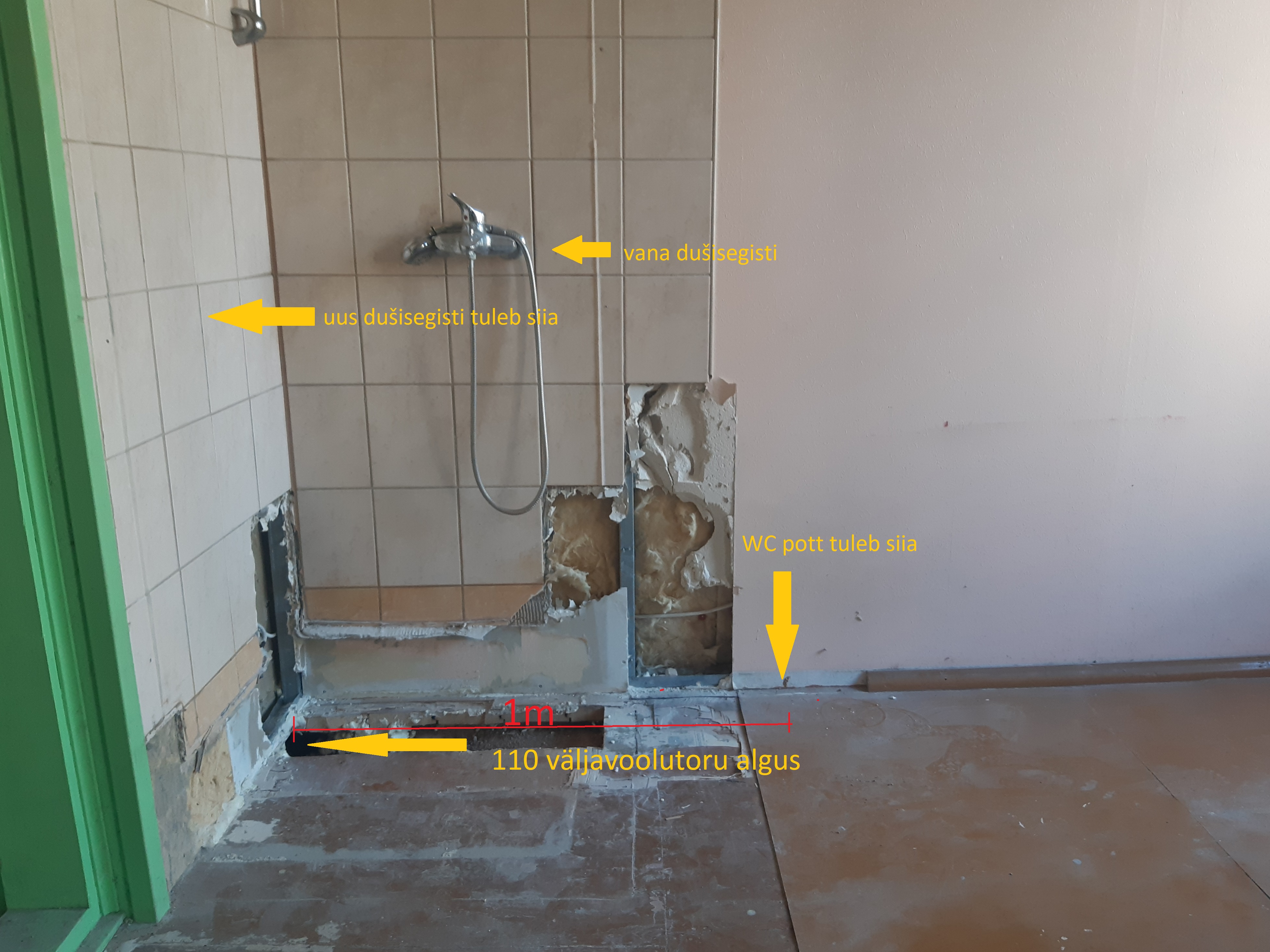 Seinani veetud väljavoolutorust WC potini on 1 meeter ja see veetakse korteri põhipõrandast madalamal. Hetkel on laudpõranda alune tühimik 9 cm. Duširuumi põrandat hakkab täitma valu ja selle kõrguse väljaselgitamiseks tulebki kõigepealt paigaldada väljavoolutorud.