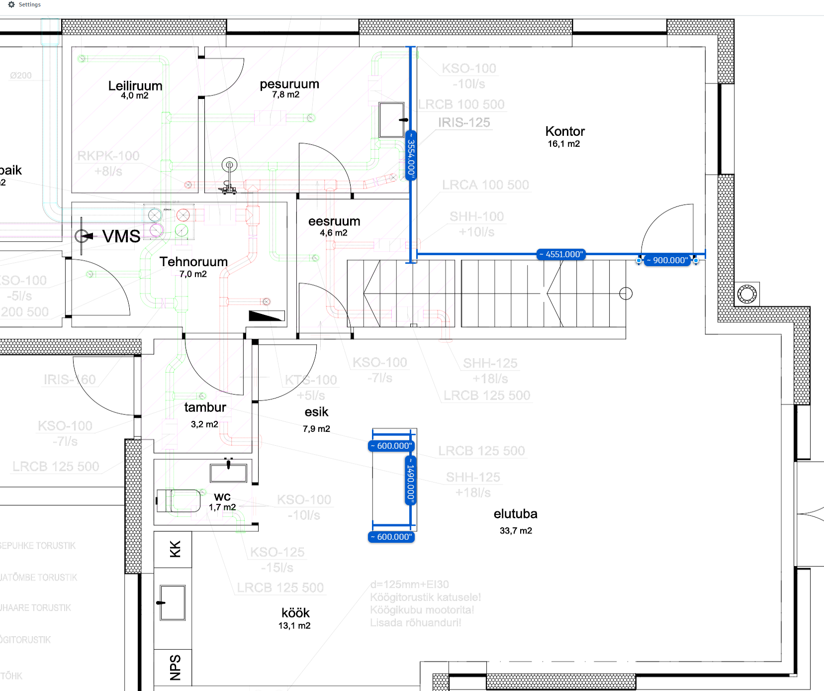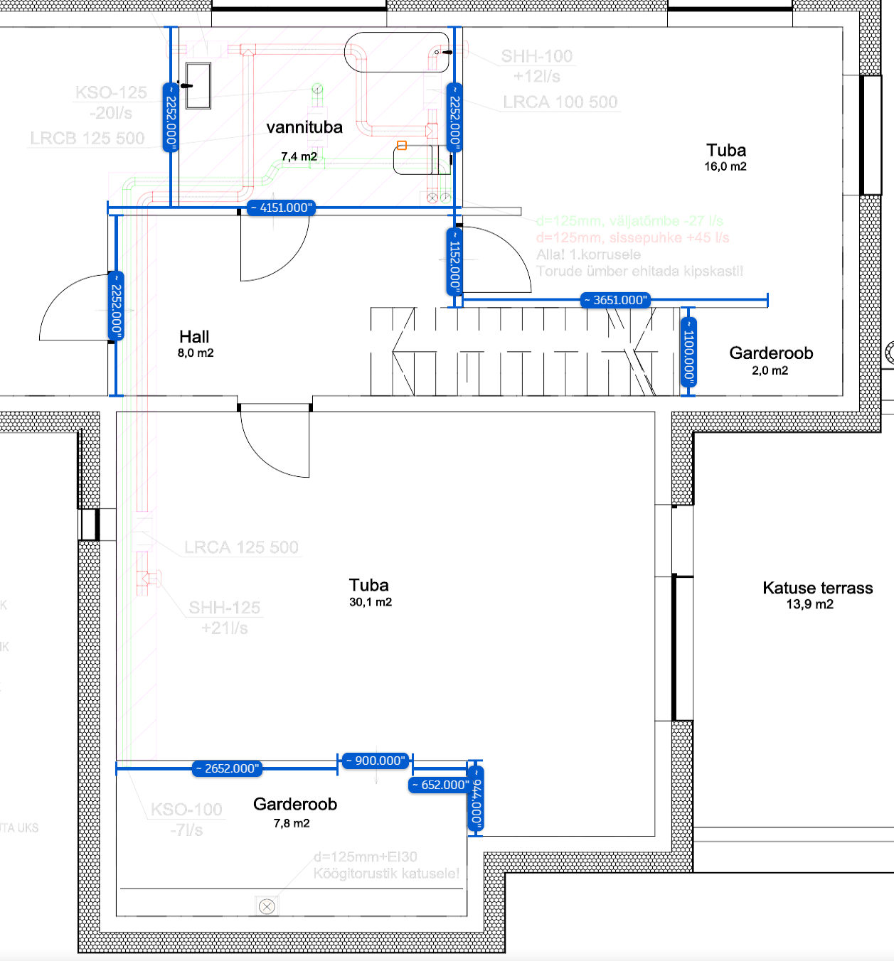 2. korrus - Kõik sinisega märgitud vaheseinad, samuti fibo 3 150. 4 ukseava, kõik 900 mm.Tubade kõrgus ca 3m.