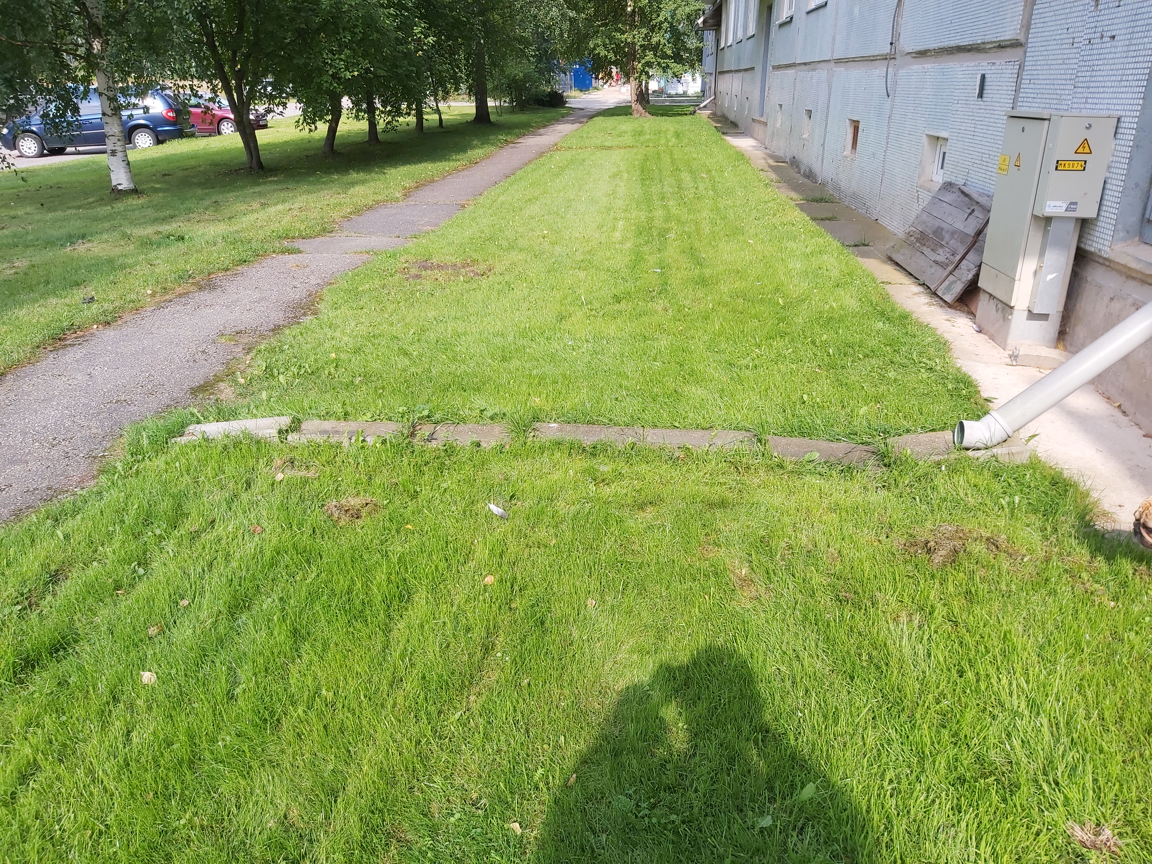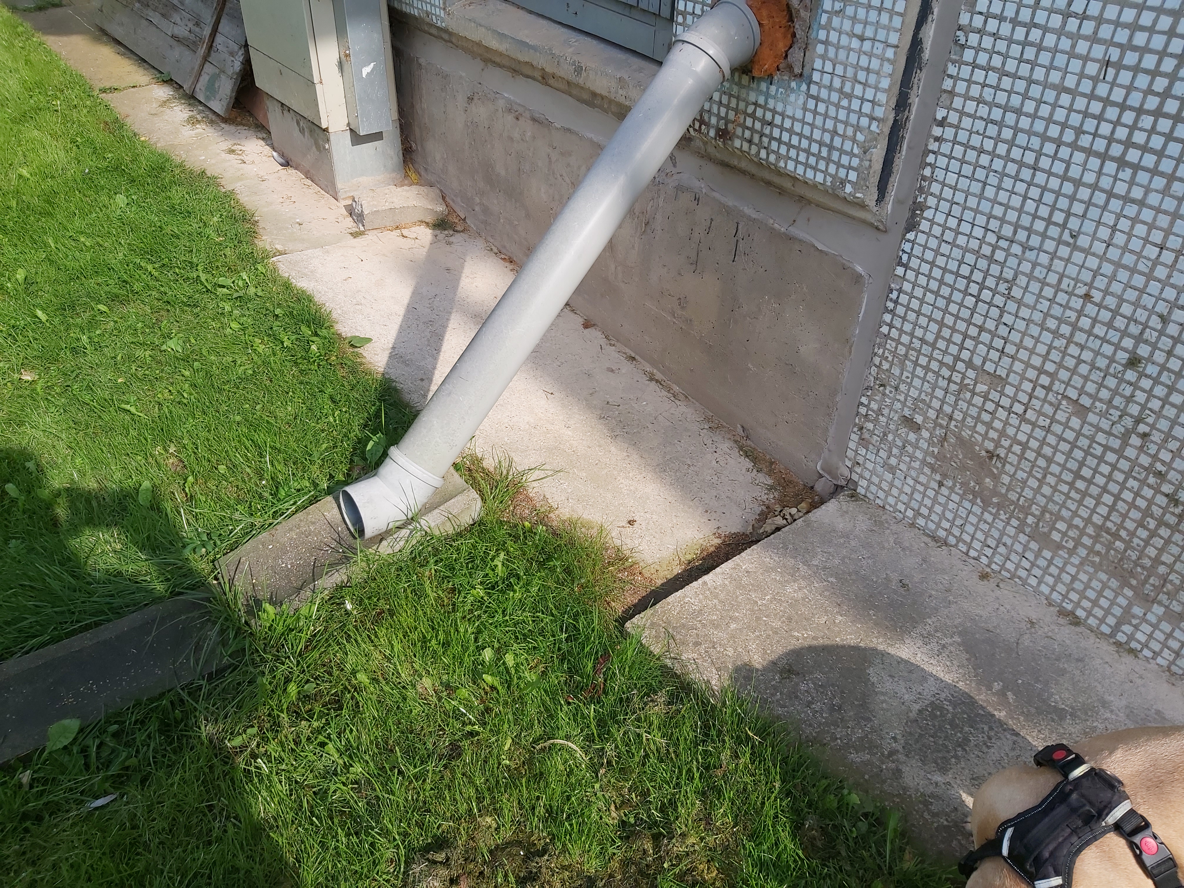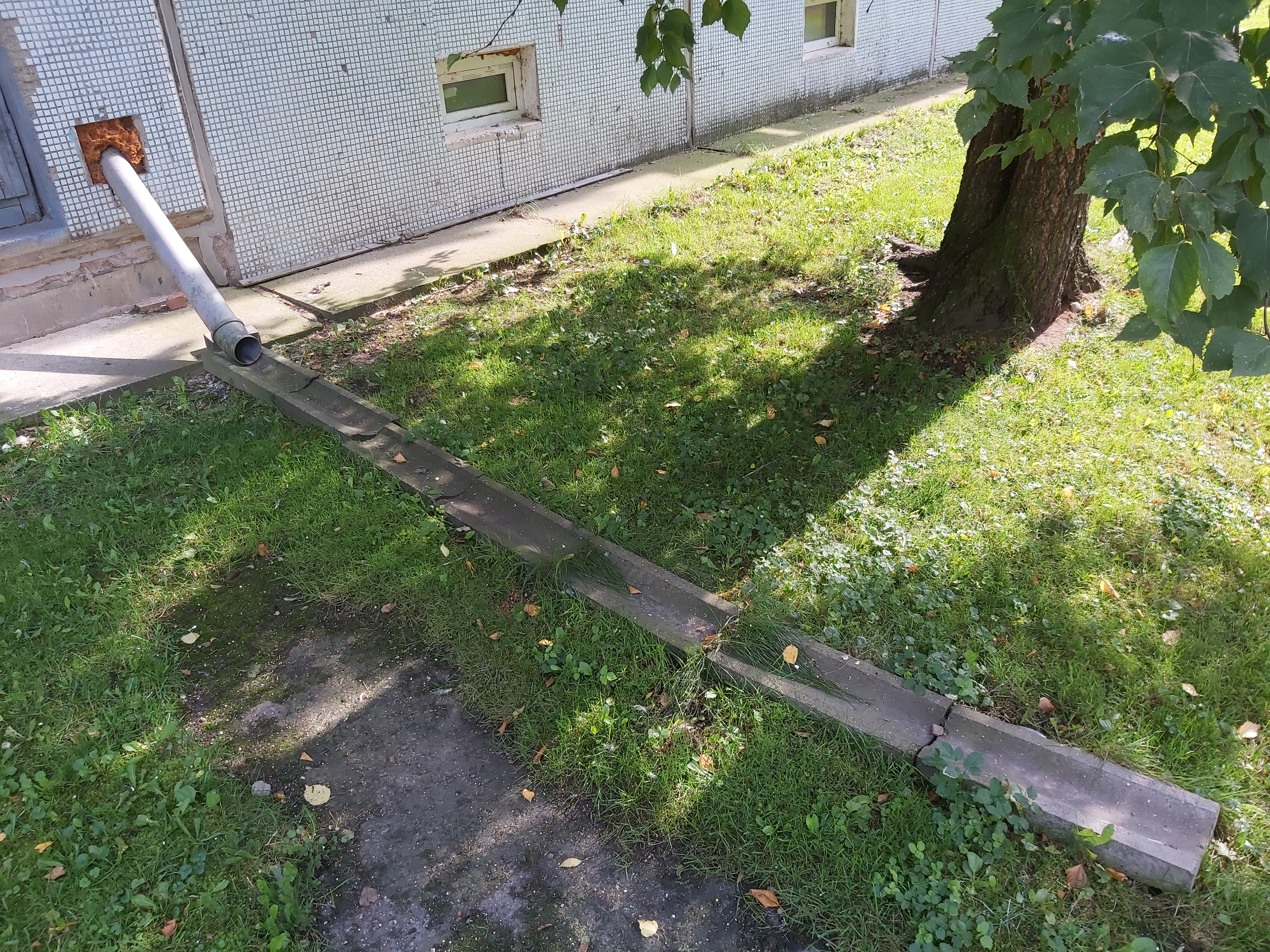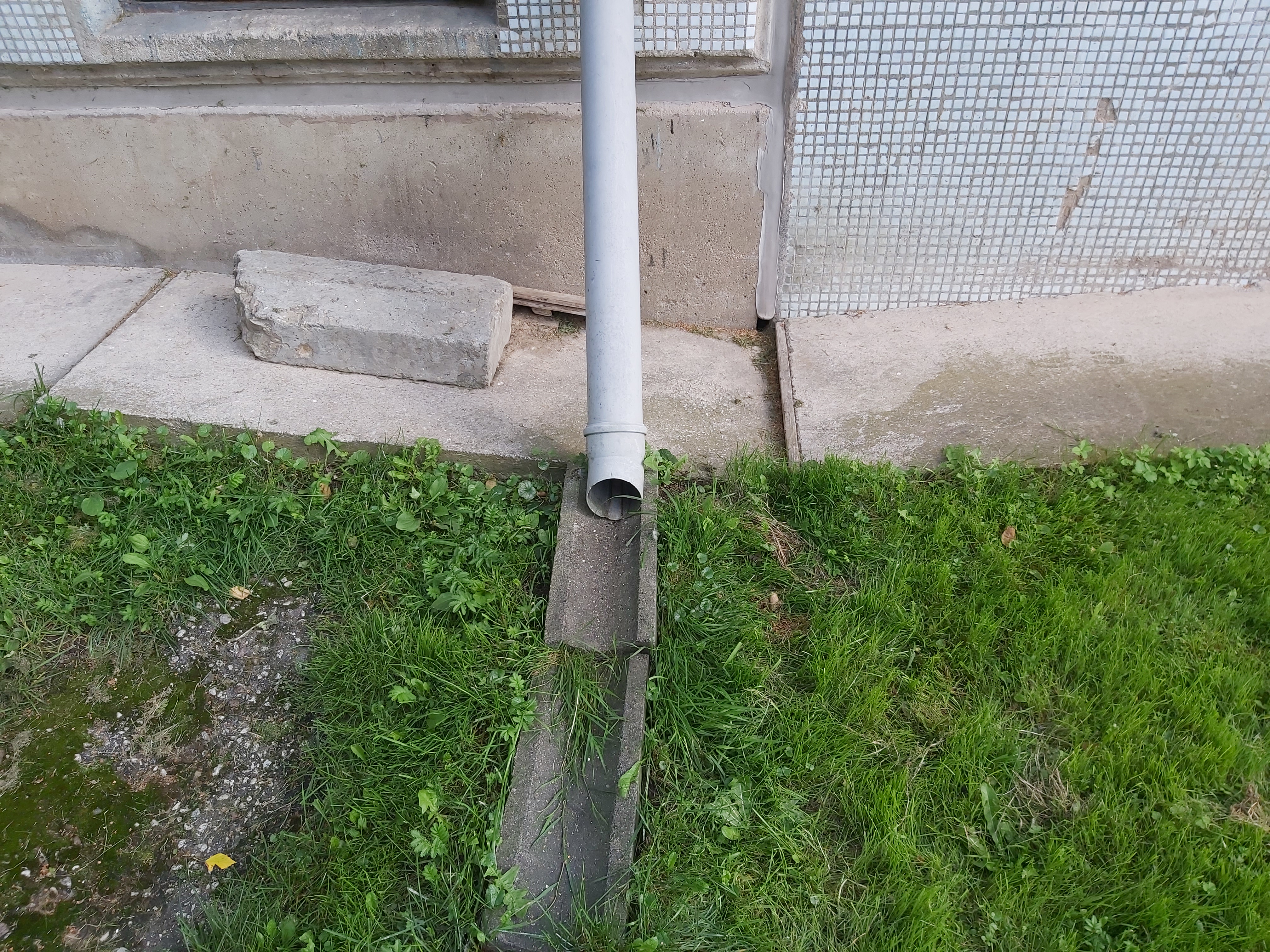 1.Betoonist plaadi korrastamine nii, et see oleks kaldega majast eemale. 2.Uute vihmavee torude paigaldus.(Pildilt nähtavate kanalisatsiooni torude välja vahetamine). Mööda maja seina alla, 90kraadi põlv ja toruga betoonist renni. 3.Betoonist rennikivide korrastamaine killustikust alusele nii,et vesi jookseks majast eemale. |