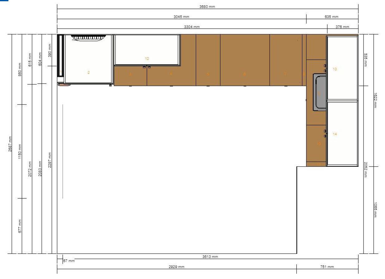 Köök on L-kujuline, pikem sein 368cm ja lühem sein 162cm.