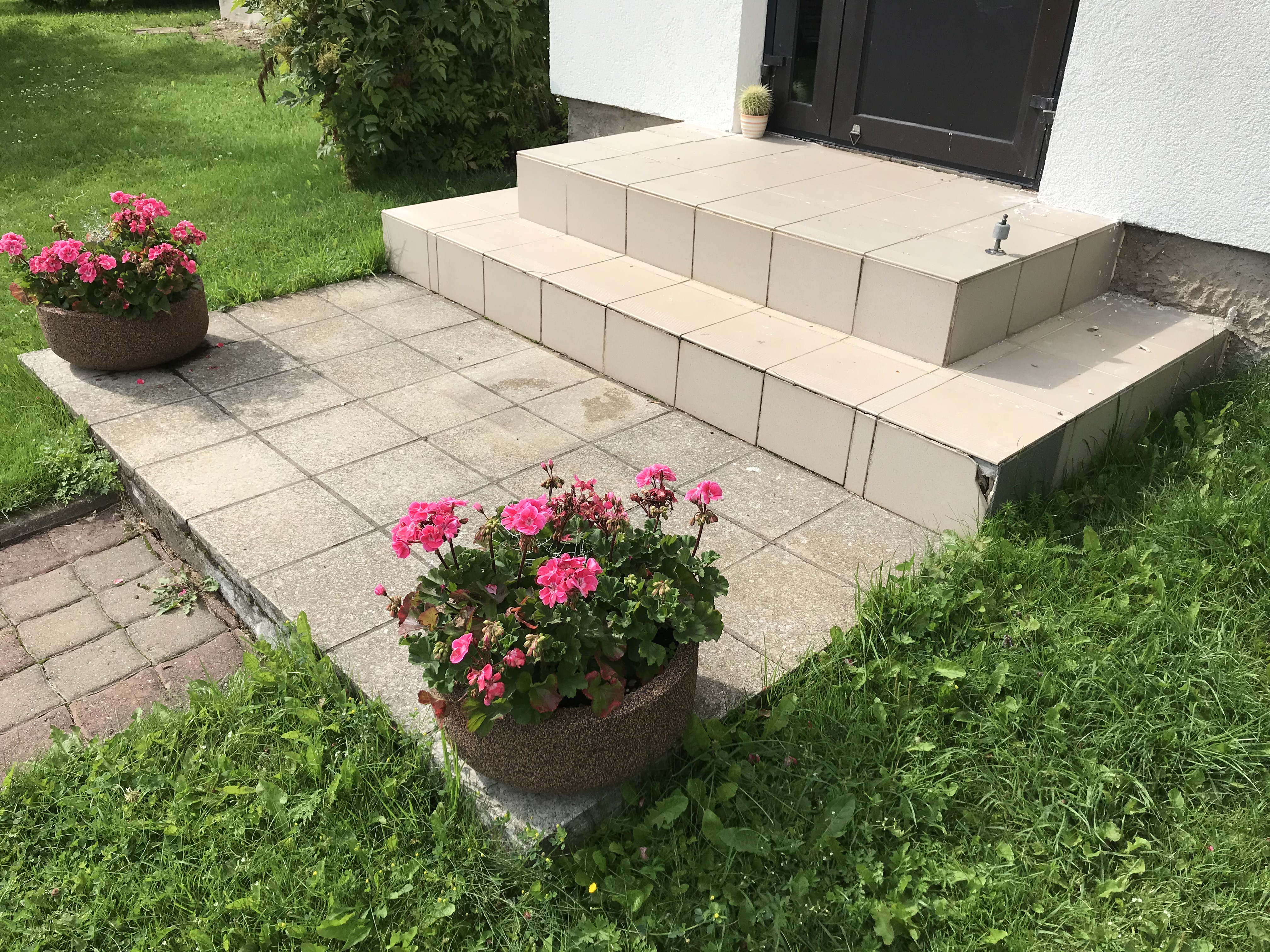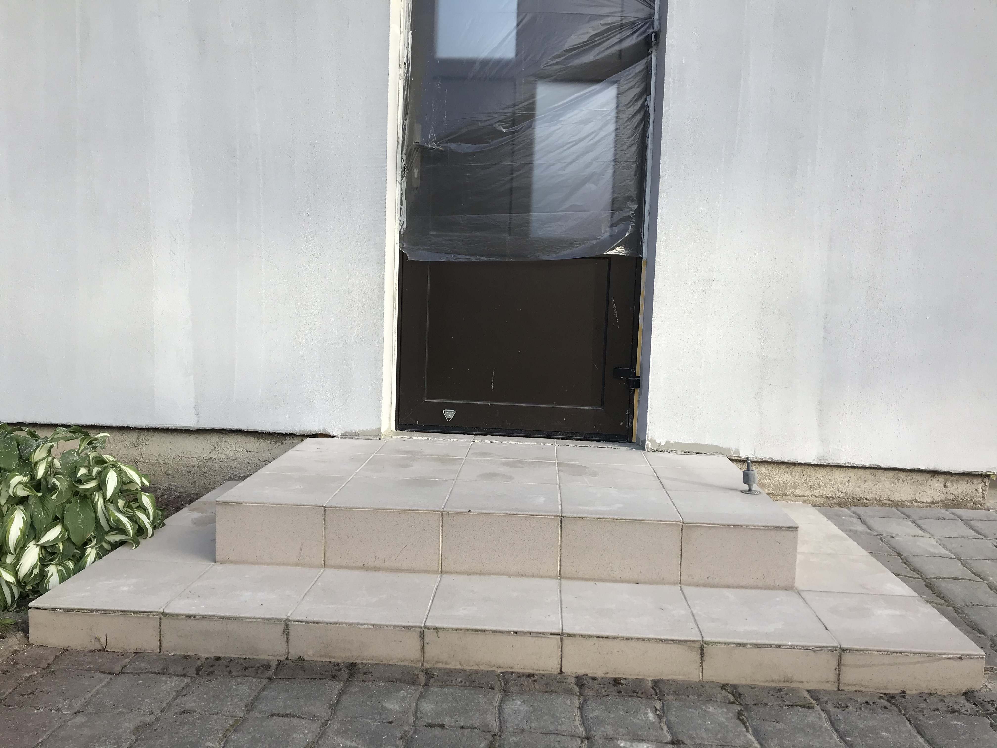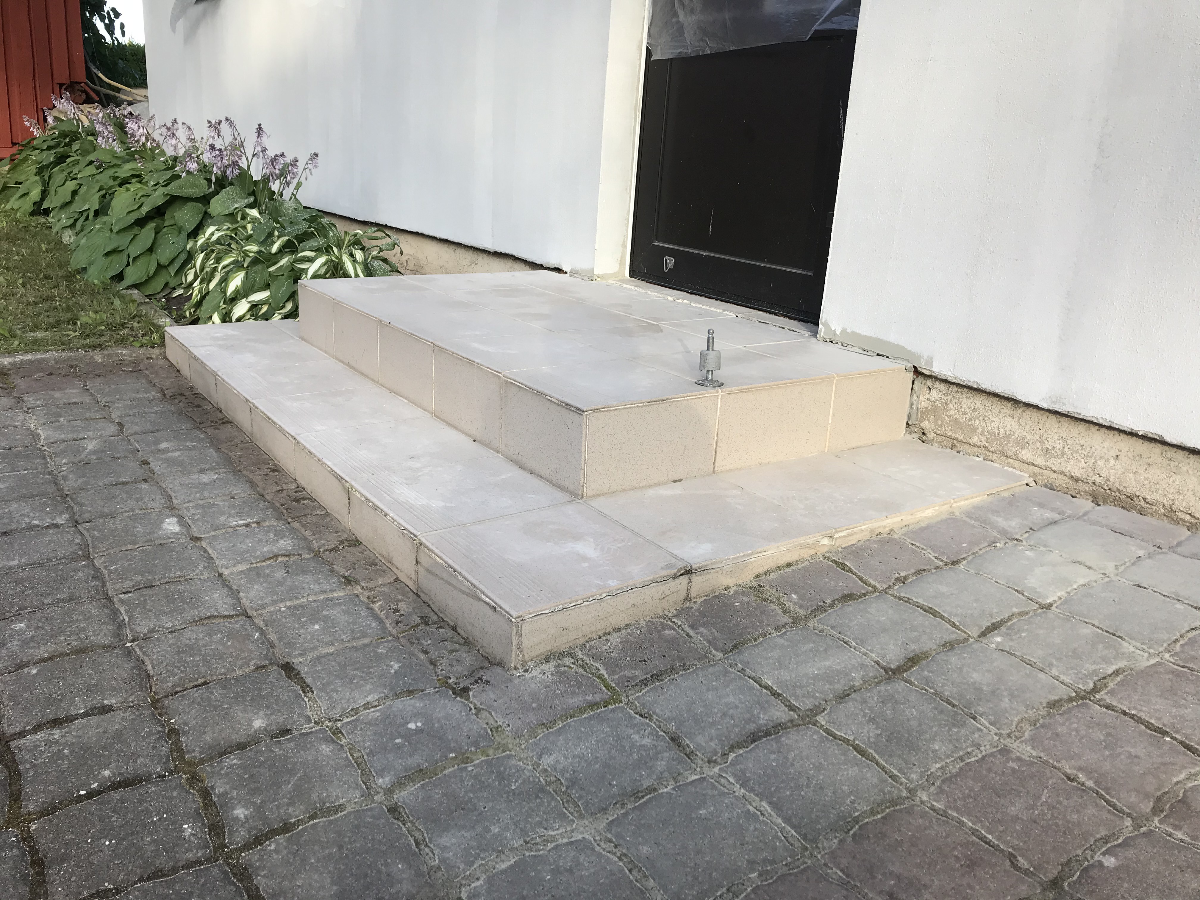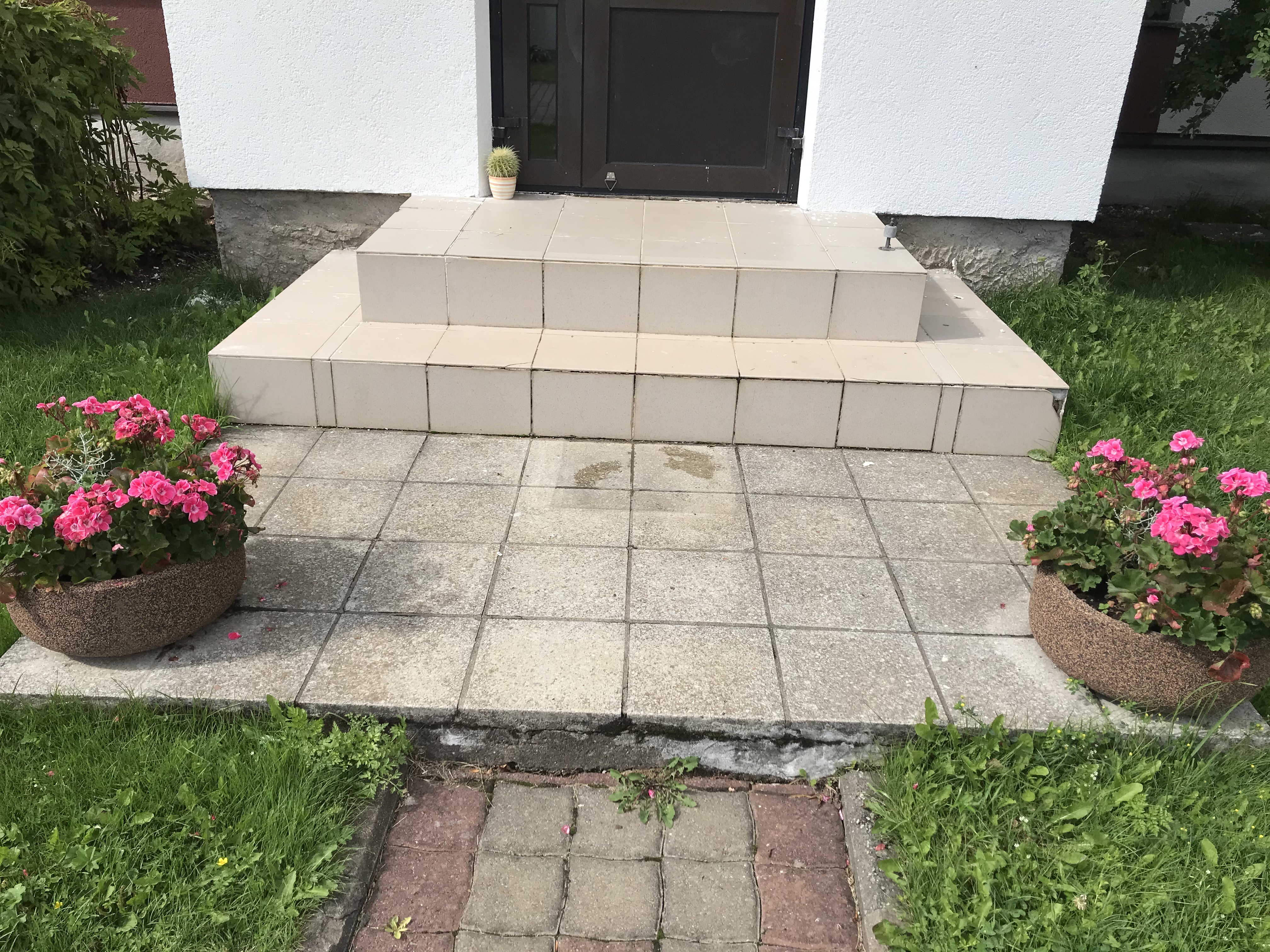 Renoveerida eramajal 2 treppi. Hetkel kaetud klinkerplaatidega. Vanad plaadid eemaldada ja ilmselt saab ära kasutada vanad trepikorpused ning peale betoneerida. Väiksem on kõrvalhoone trepp. Laius 2,10 m, üldkõrgus 0,25 m. Külgedele enam astmeid ei tule. Ülemine platvorm pikendada mõlemas suunas kuni laiuseni 2,10m. Katta pesubetoonplaatidega. Värv kiilibetooni lehelt P412. Ilmselt võimalik tellida ülemine platvorm ühes tükis?