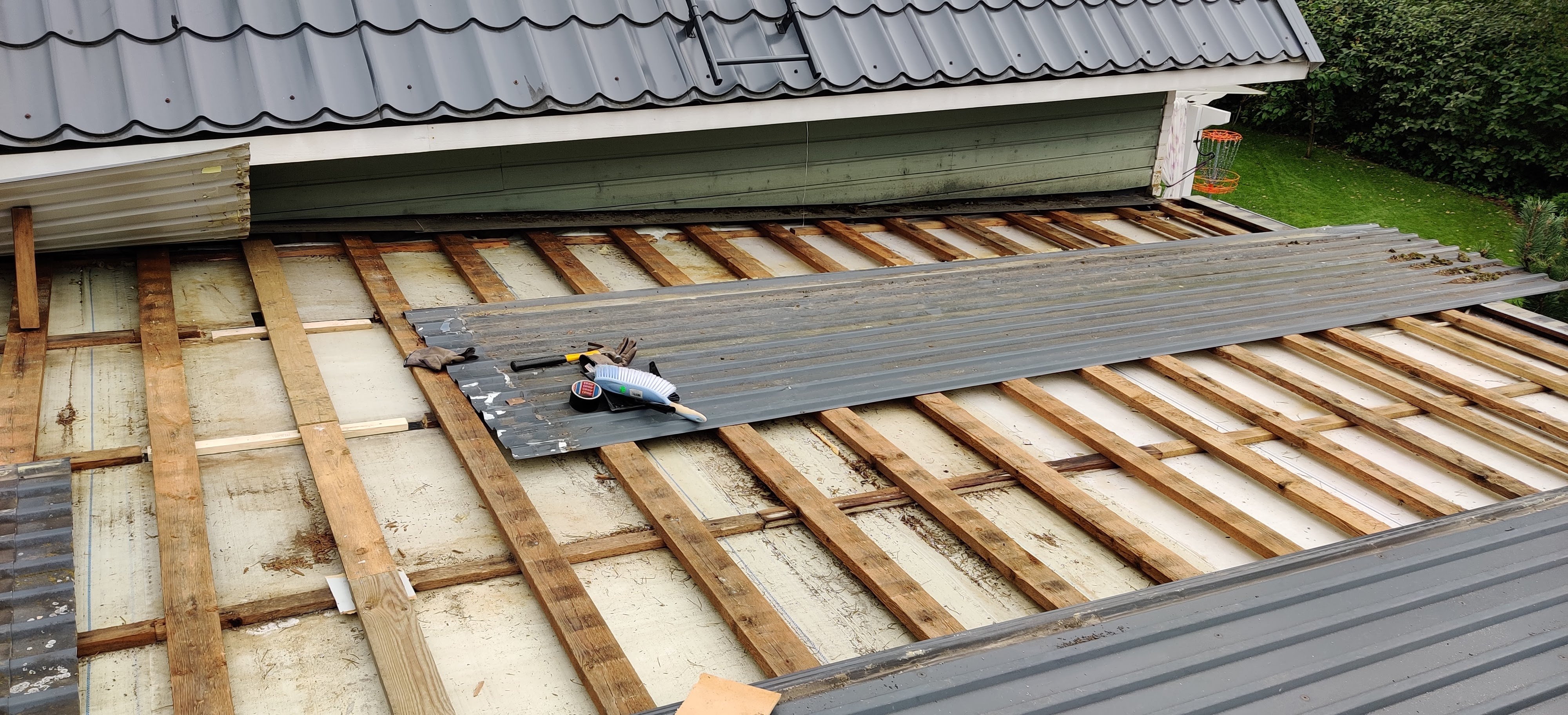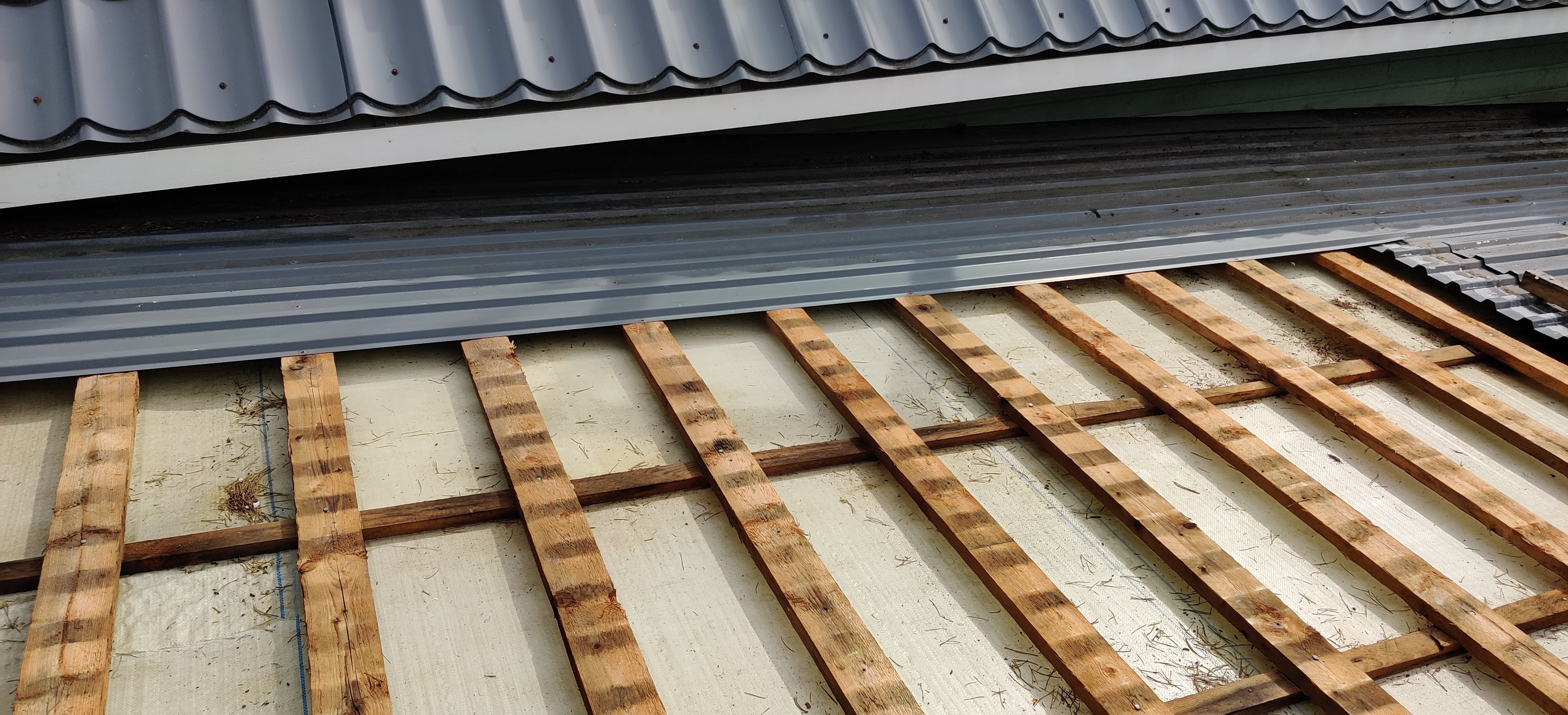 Tegemist on eelneva gaaraaziga, mis on ümber tehtud elutoaks ja selle käigus lisati seestpoolt 10cm soojustust ning uus kipslagi. Tööd on eeldusel, et trapetseplekkide vahelt on niiskuskahjustuse saanud u 4-8m2 ulatuses soojustust ning vana kipslage. Hetkel toast on niiskuskahjustus näha u 3m ulatuses ühe kipsplaadi vahekohas. Seespoolt kipslagi 1m ulatuse lahti võetud, lisasoojustus on kuiv, selle kohal olev eelmine lagi on aga niiskuskahjustusega. Plekk on korra eemaldatud, et olukorda hinnata, probleemiks oli kivistunud silikoon pleki vahekohas.