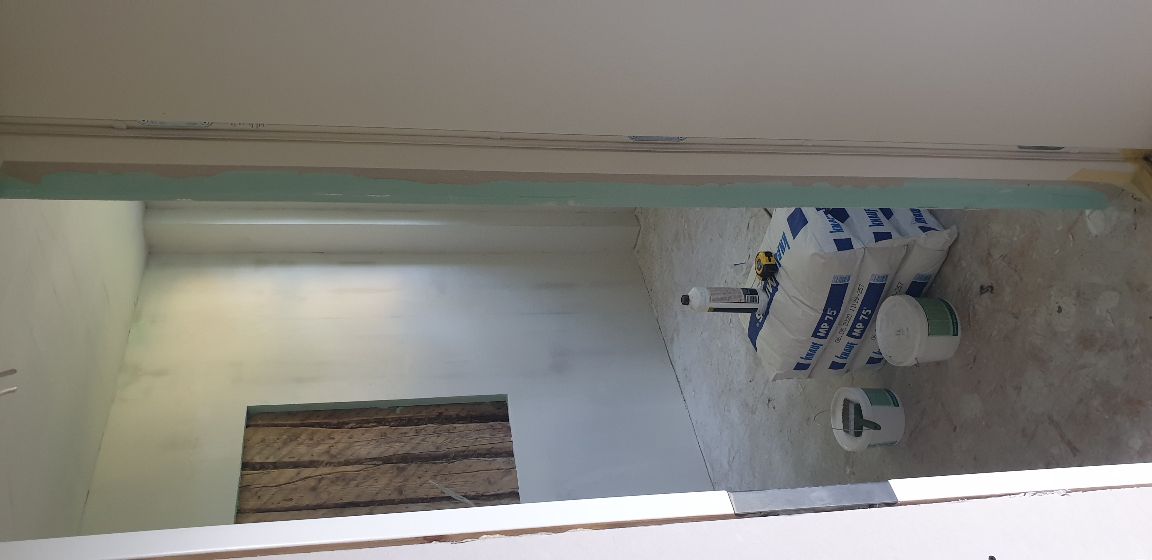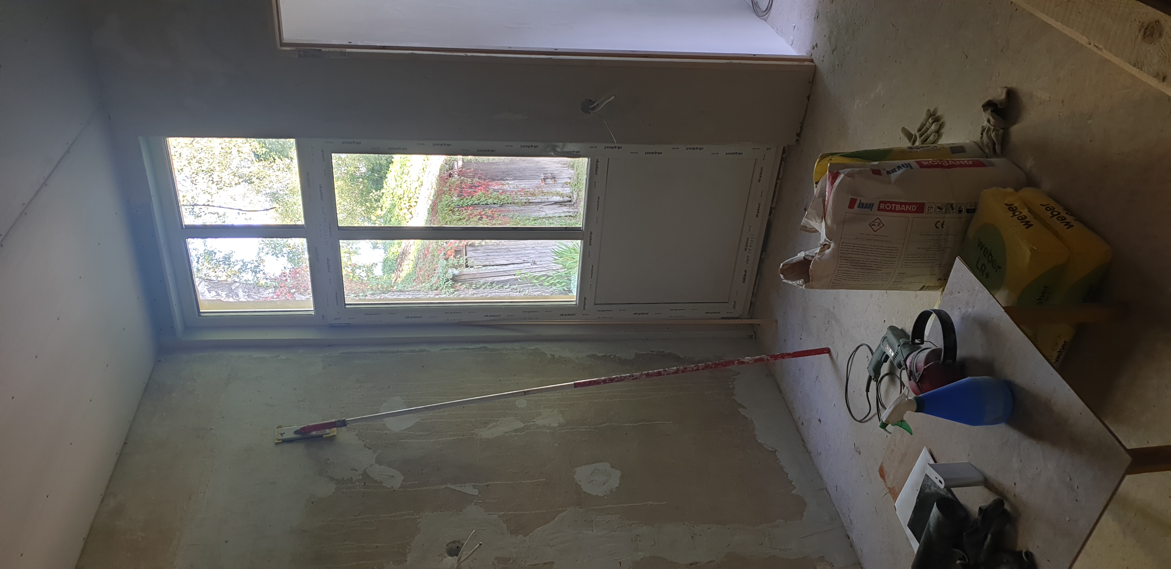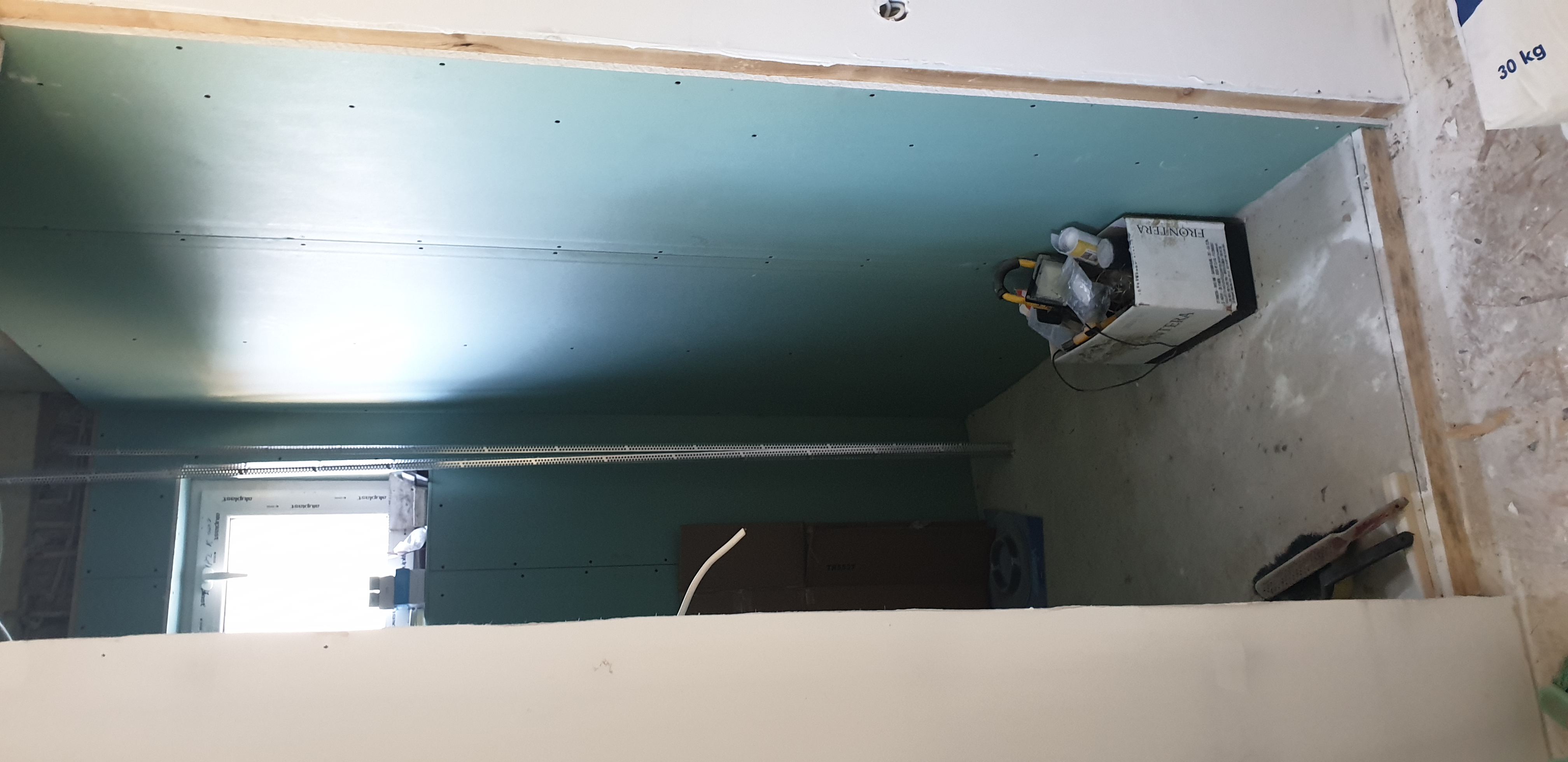 Korteri ehitusjärk- magamistoa seintelt on eemaldatud tapeet, all oli vana krohv. Lagi on kipsplaadiga kaetud. Köök on täielikult kaetud kipsplaadiga ja pahteldatud LR+ pahtliga 2x