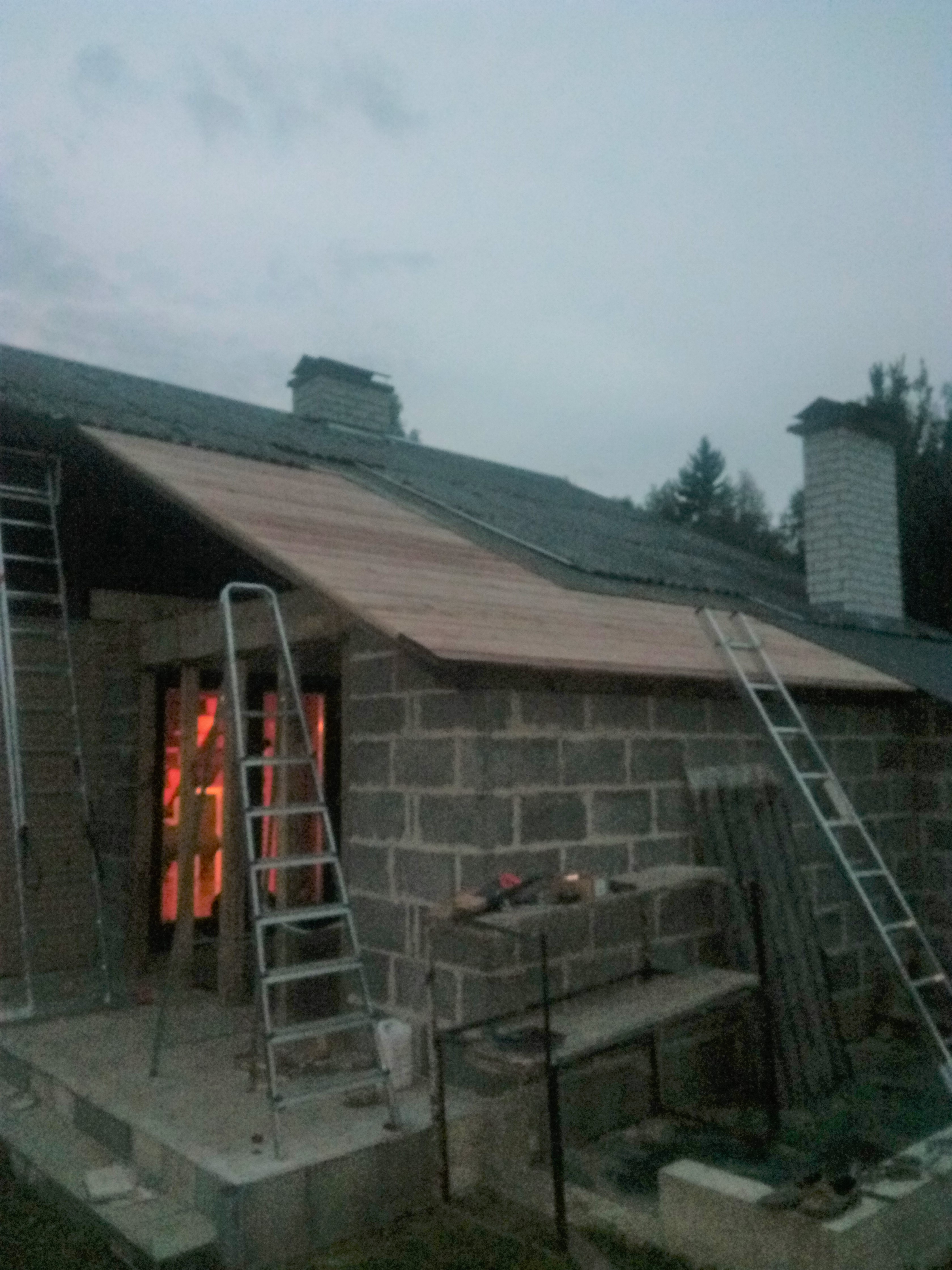 Vaja paigaldada kuumliimimise teel kaks rulli SBS rullmaterjali. Katuse kalle 26 kraadi. Alusmaterjal naelutatud, pildil veel mitte.