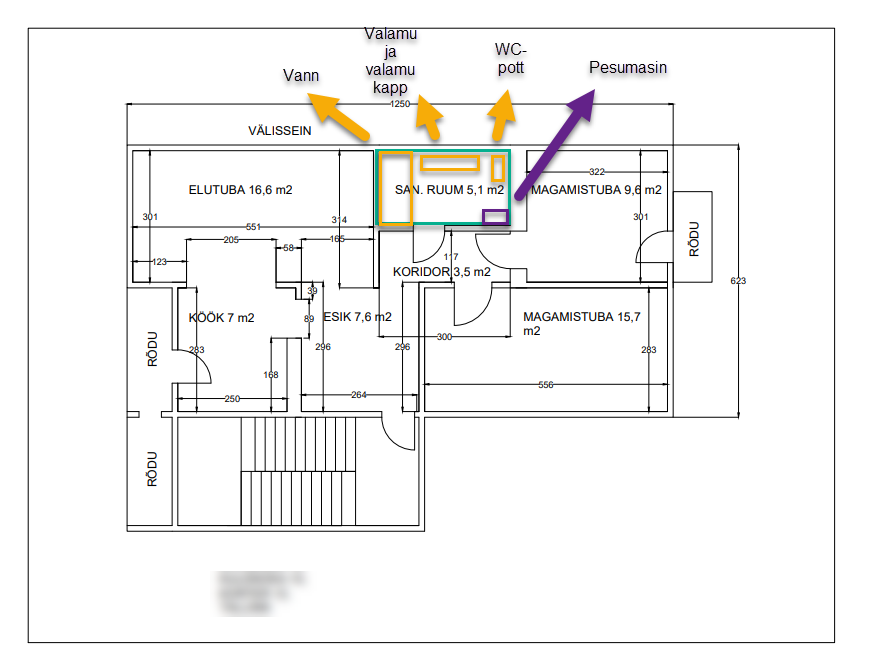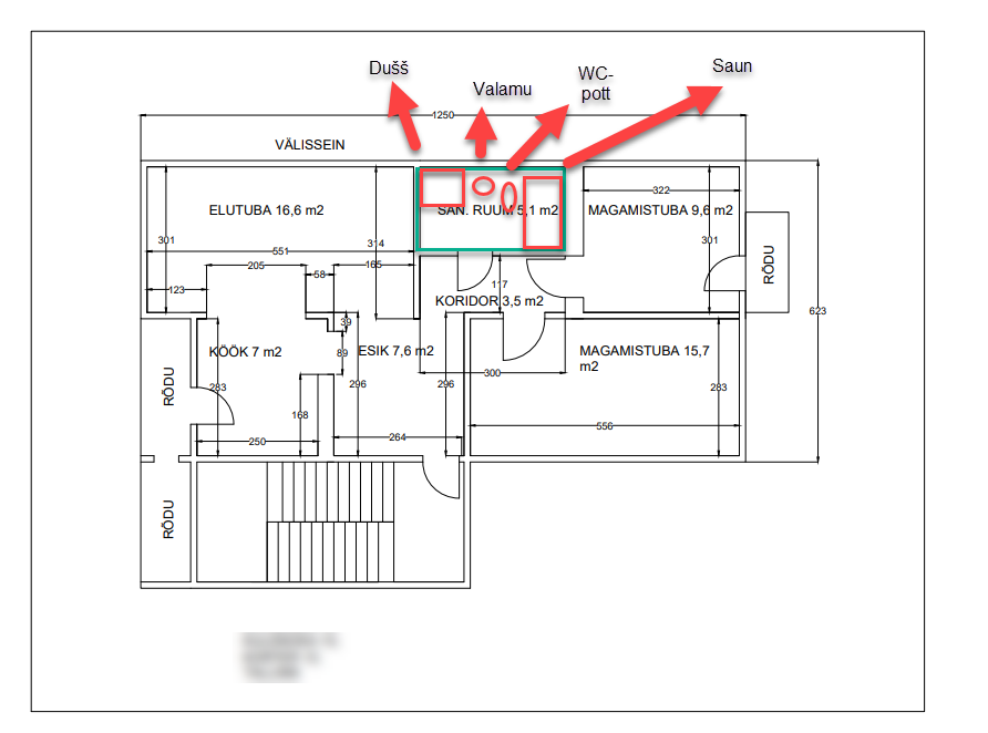 Vannitoa ja WC vaheline sein on osaliselt juba eemaldatud, kuid WC alale on eelmine omanik ehitanud väikese sauna. Soov oleks loobuda saunast ja suurendada selle arvelt vannitoa pinda.