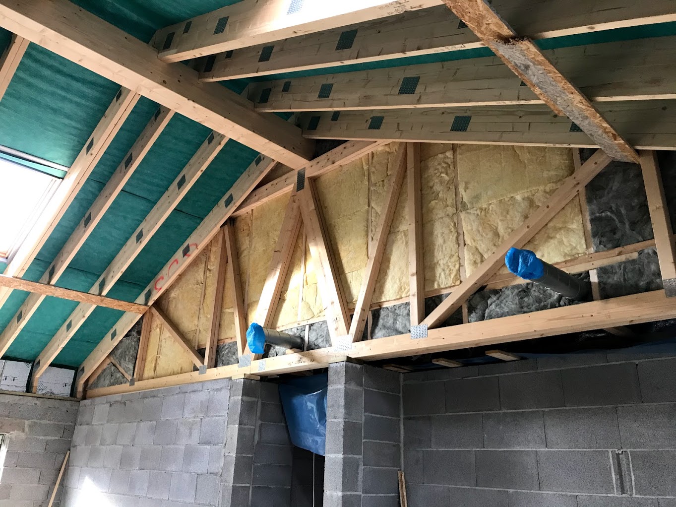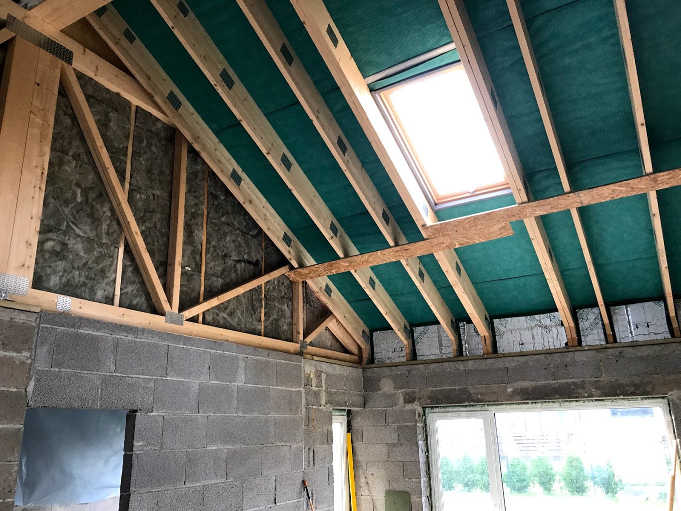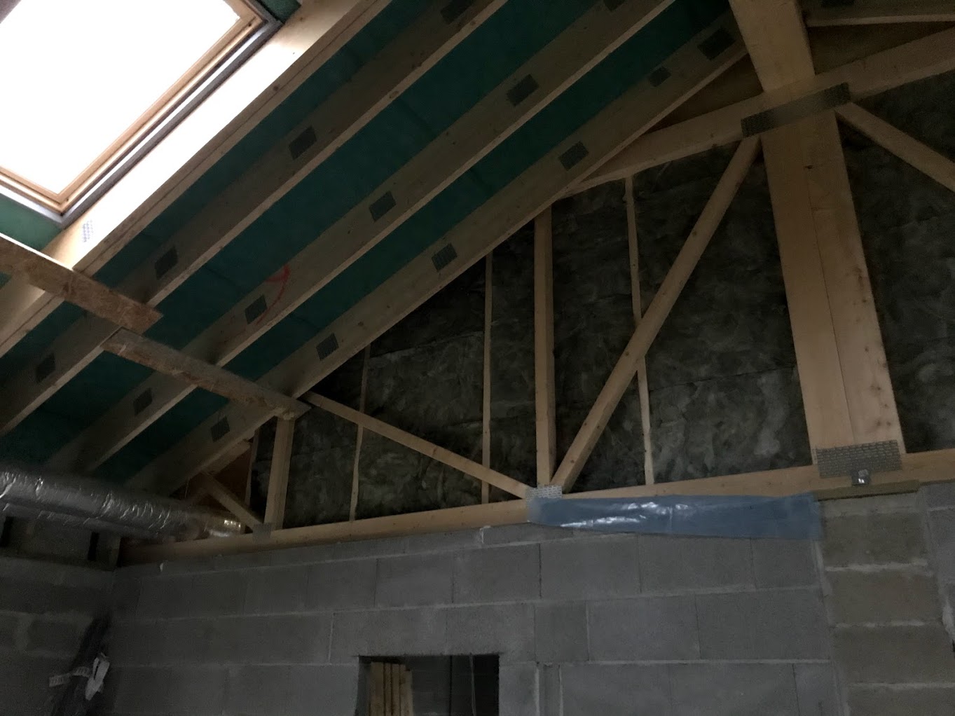 2) aurutõkkekile paigaldus (+teipimine), tuba läbivate ventilatsioonitorude (2 tk) tihendamine + aurutõkketeipimine, aurutõkkekihtide kokkuviimine külgneva horisontaalse laega fermide alaosas