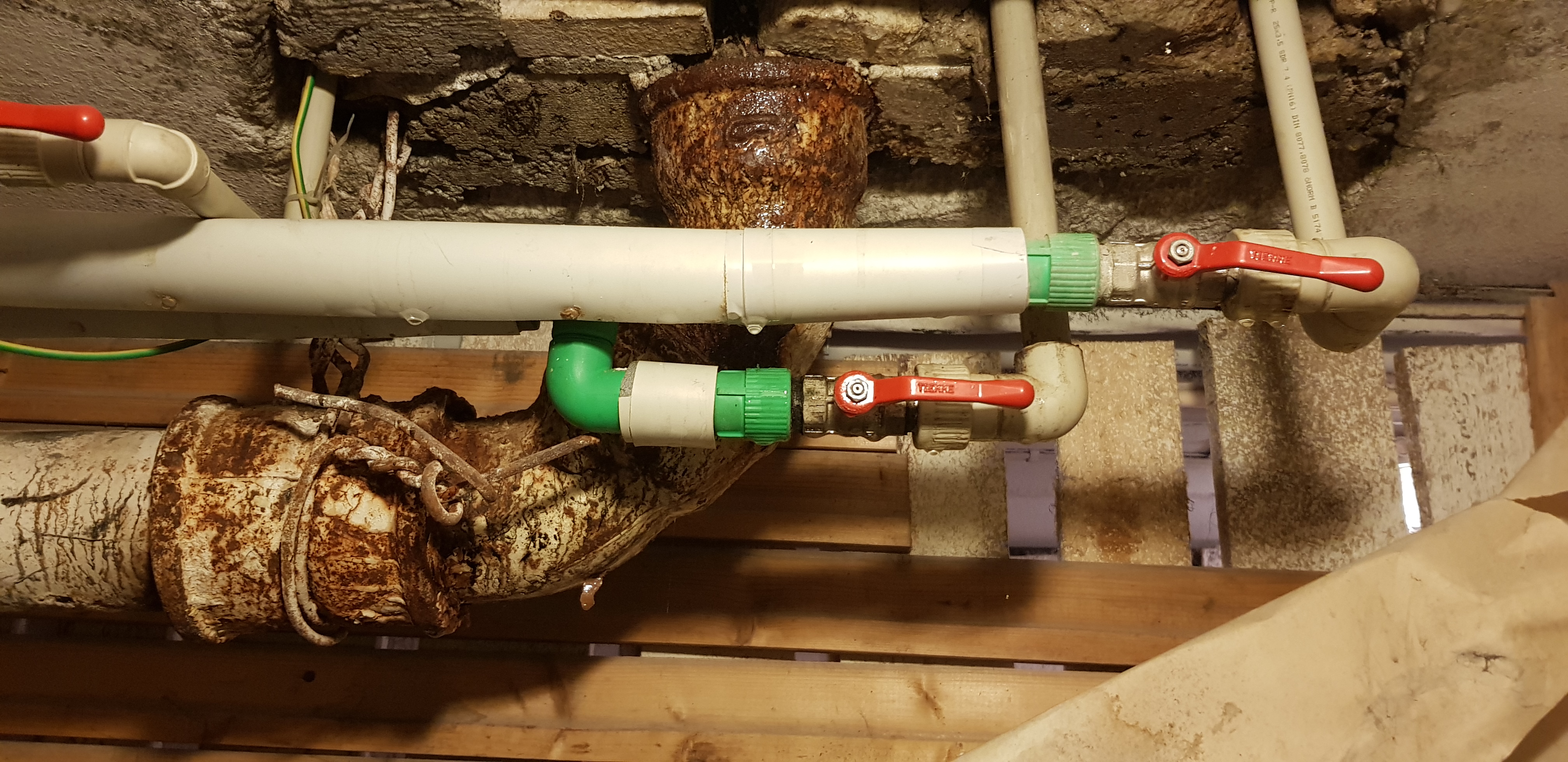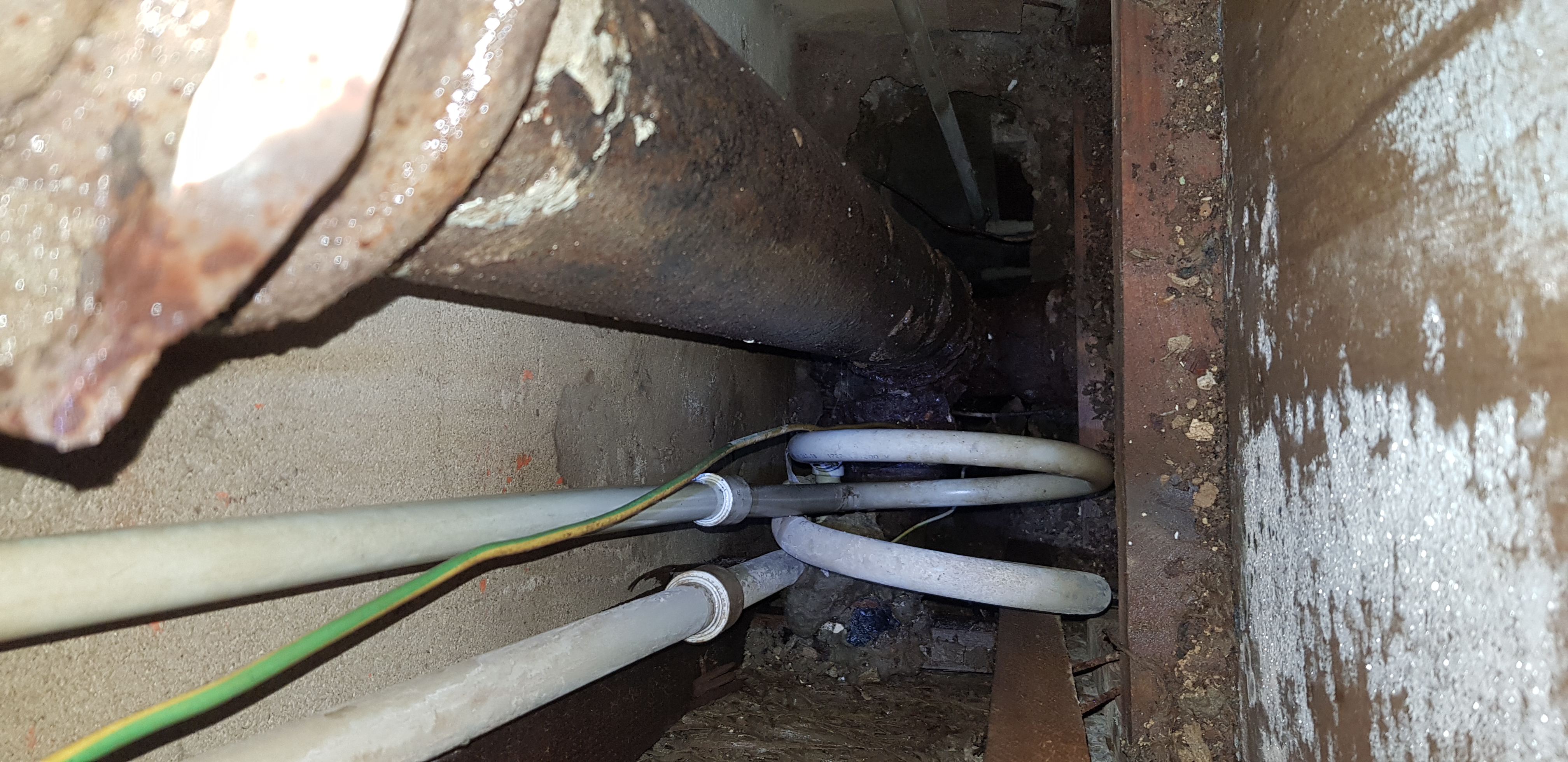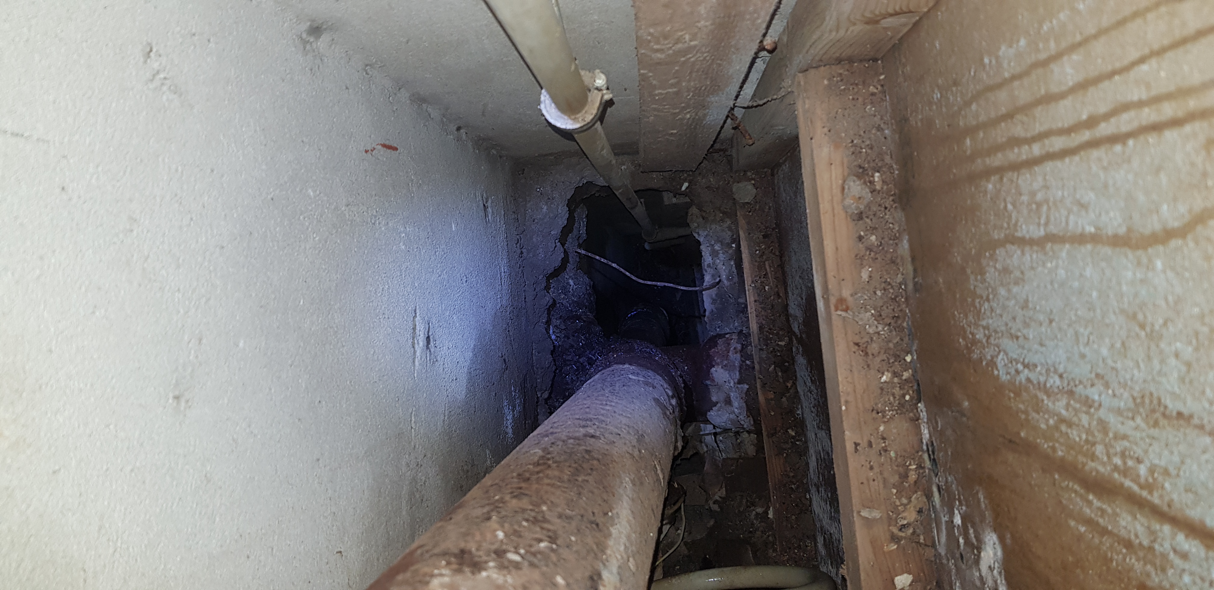 5-korruselise lamekatusega maja ühe ehitusaegse (1974.a.) malmist kanalisatsioonitoru püstiku vahetus püstikute liitumispunktist keldris (u 1 meeter püstikust) kuni katuse läbiviiguni. Torušahtis on vana malmtoru ja uued plastikust puhta vee torud suhteliselt lähestikku. Korruste vahed on avatud.