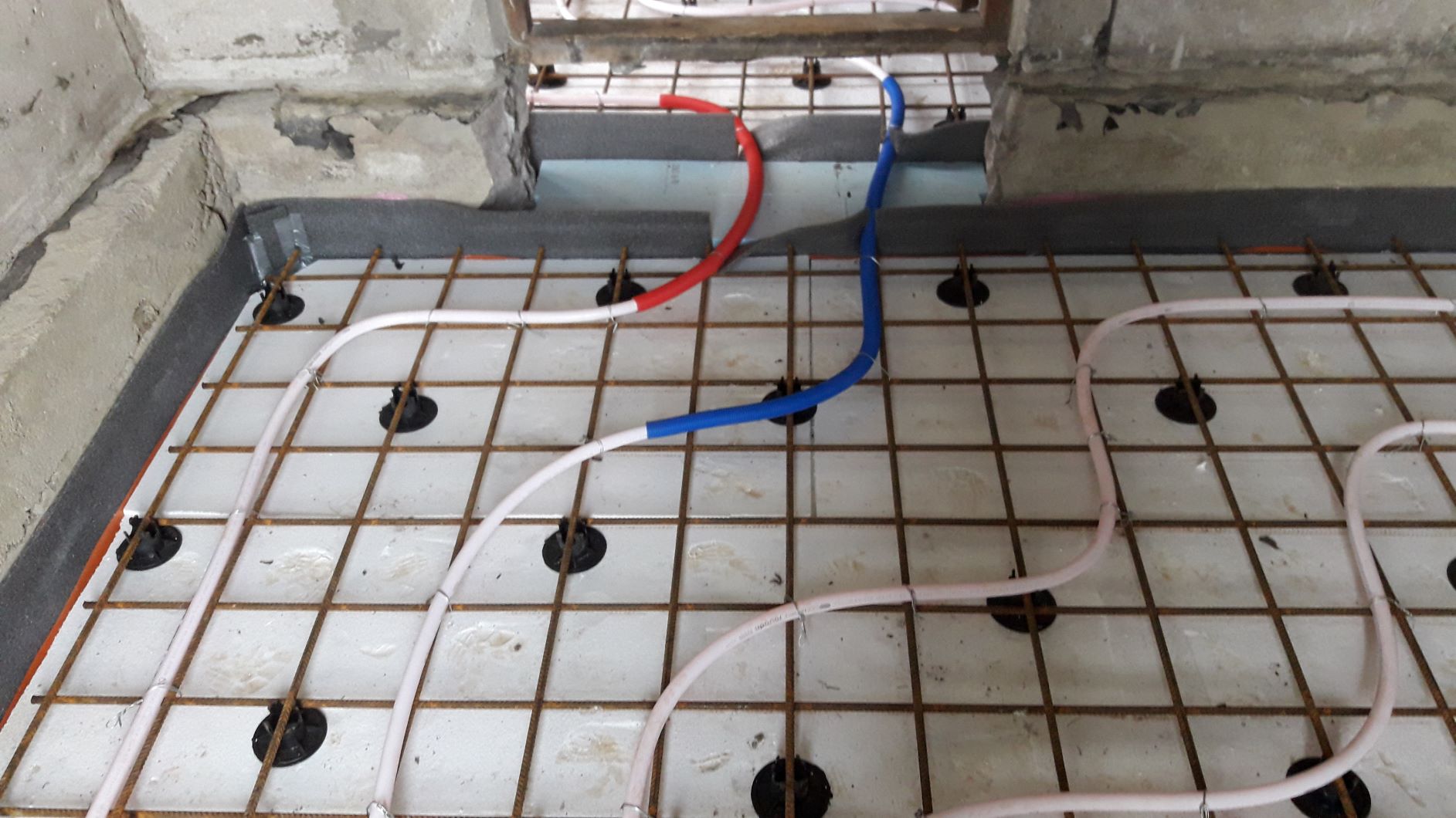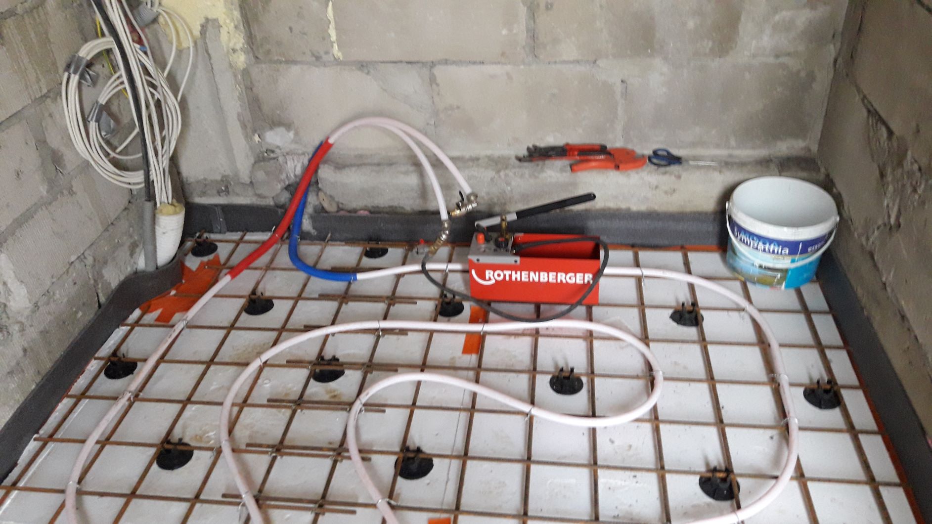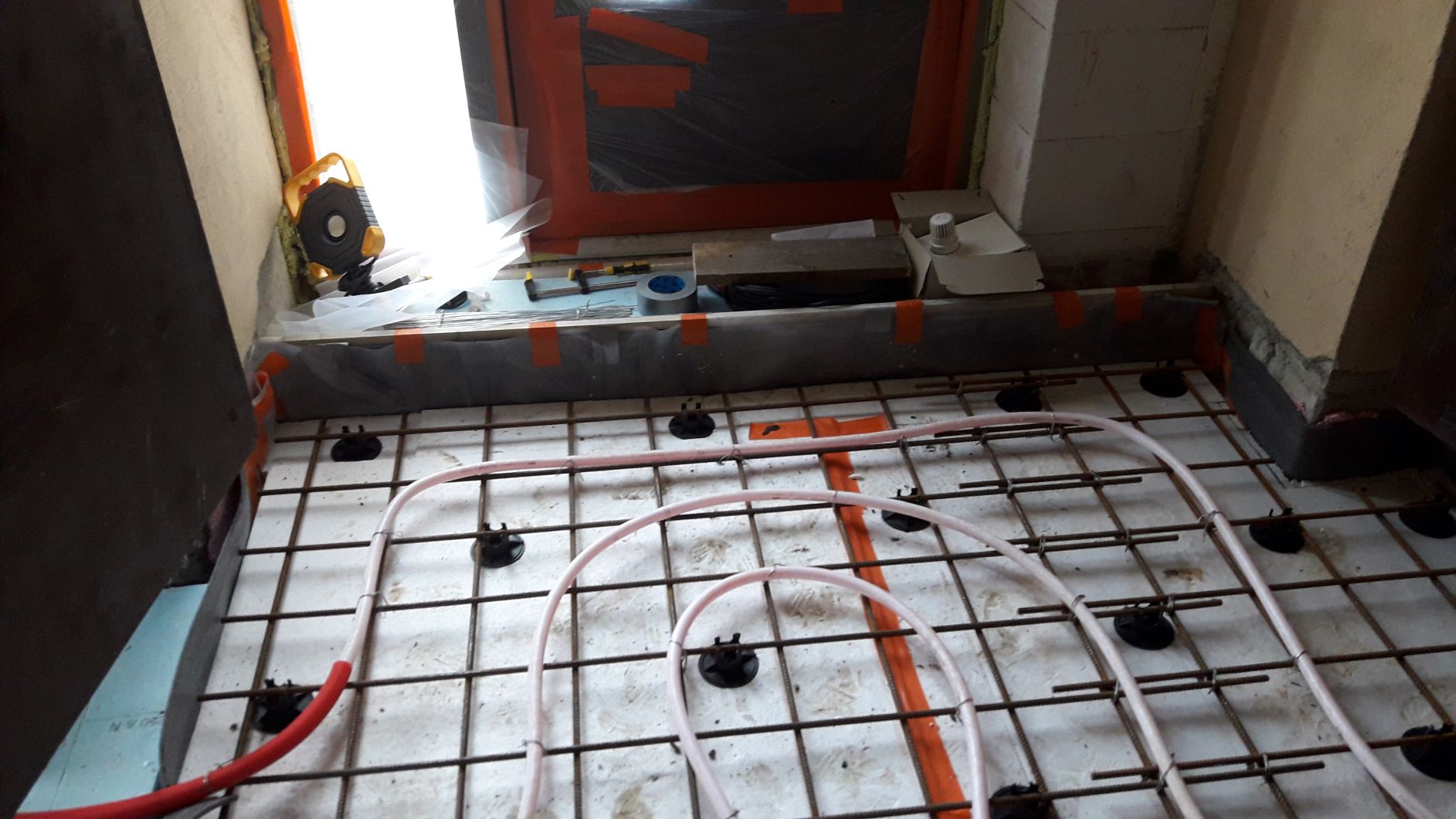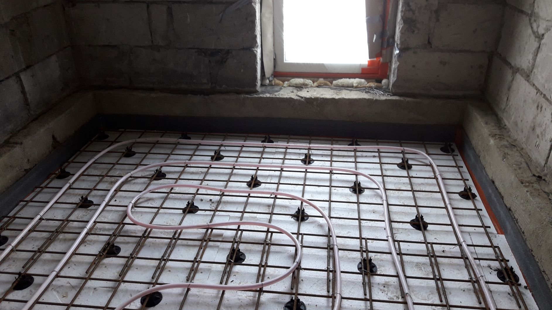Põrandakütte betoonpõranda valamine. Pind 12,3 m2 (2 ruumi - 2,6*2,7 ja 2,57*2,05m). Betoonikihi paksus 100-105 mm (Ø20 põrandakütte toru peale 40-45mm).