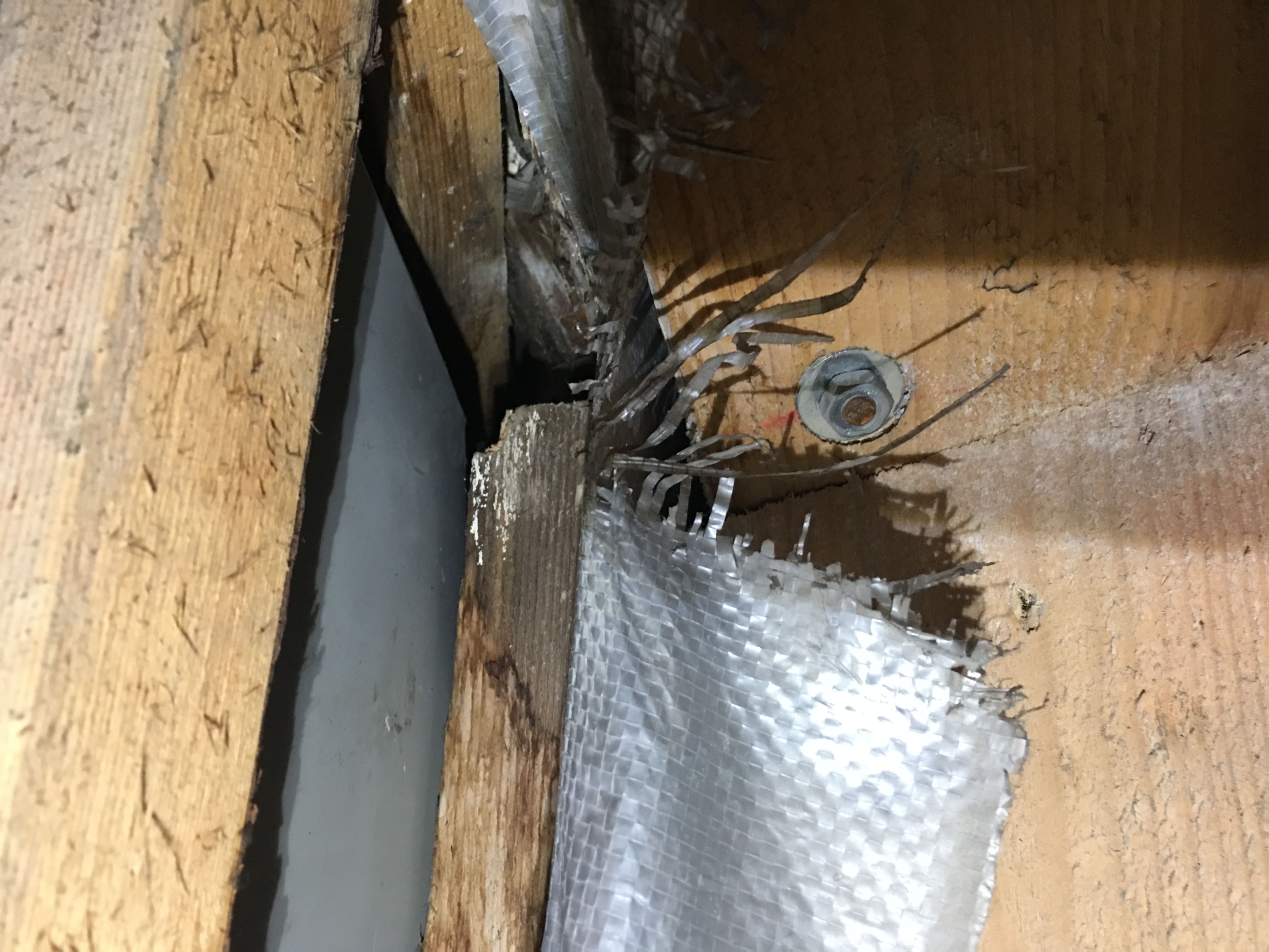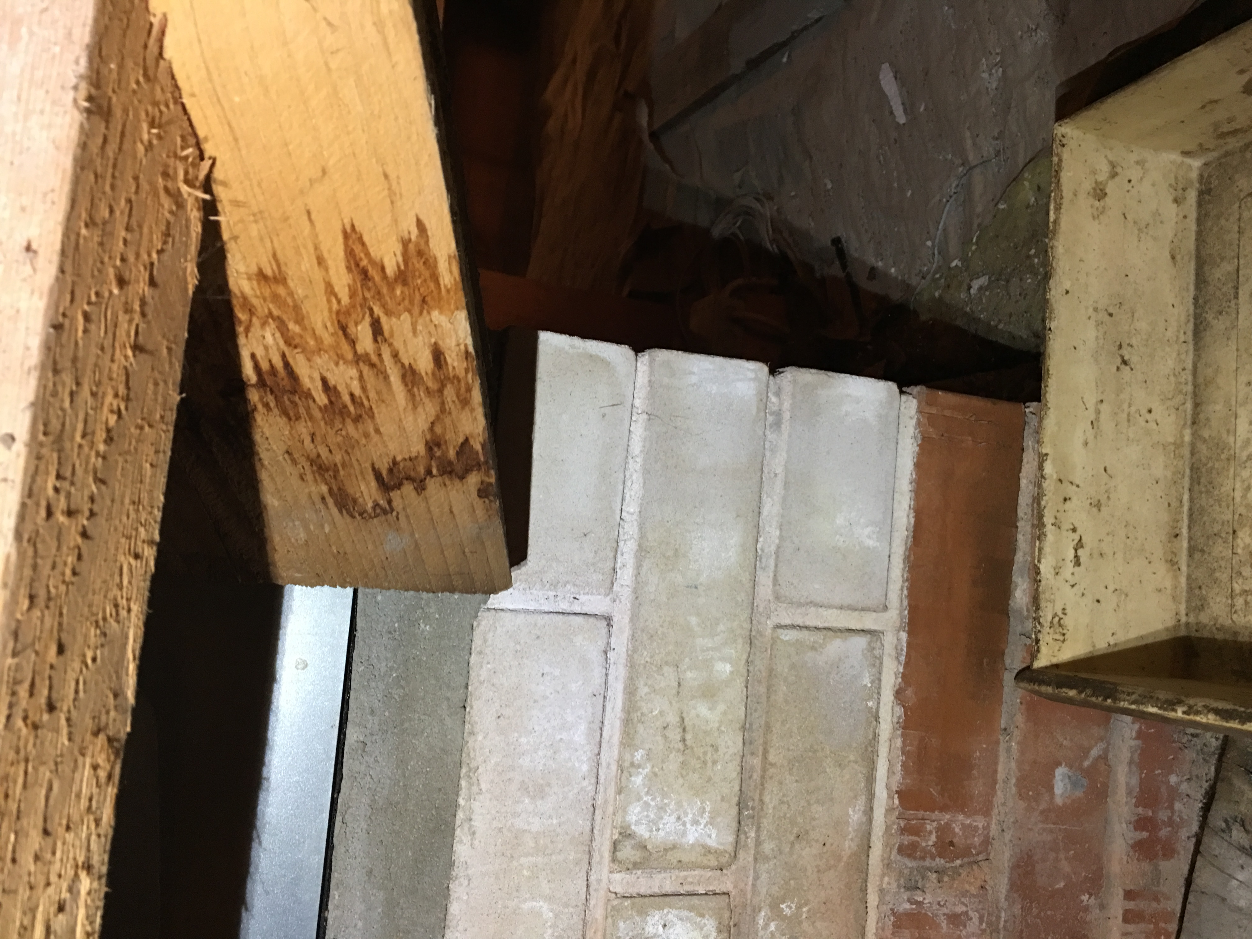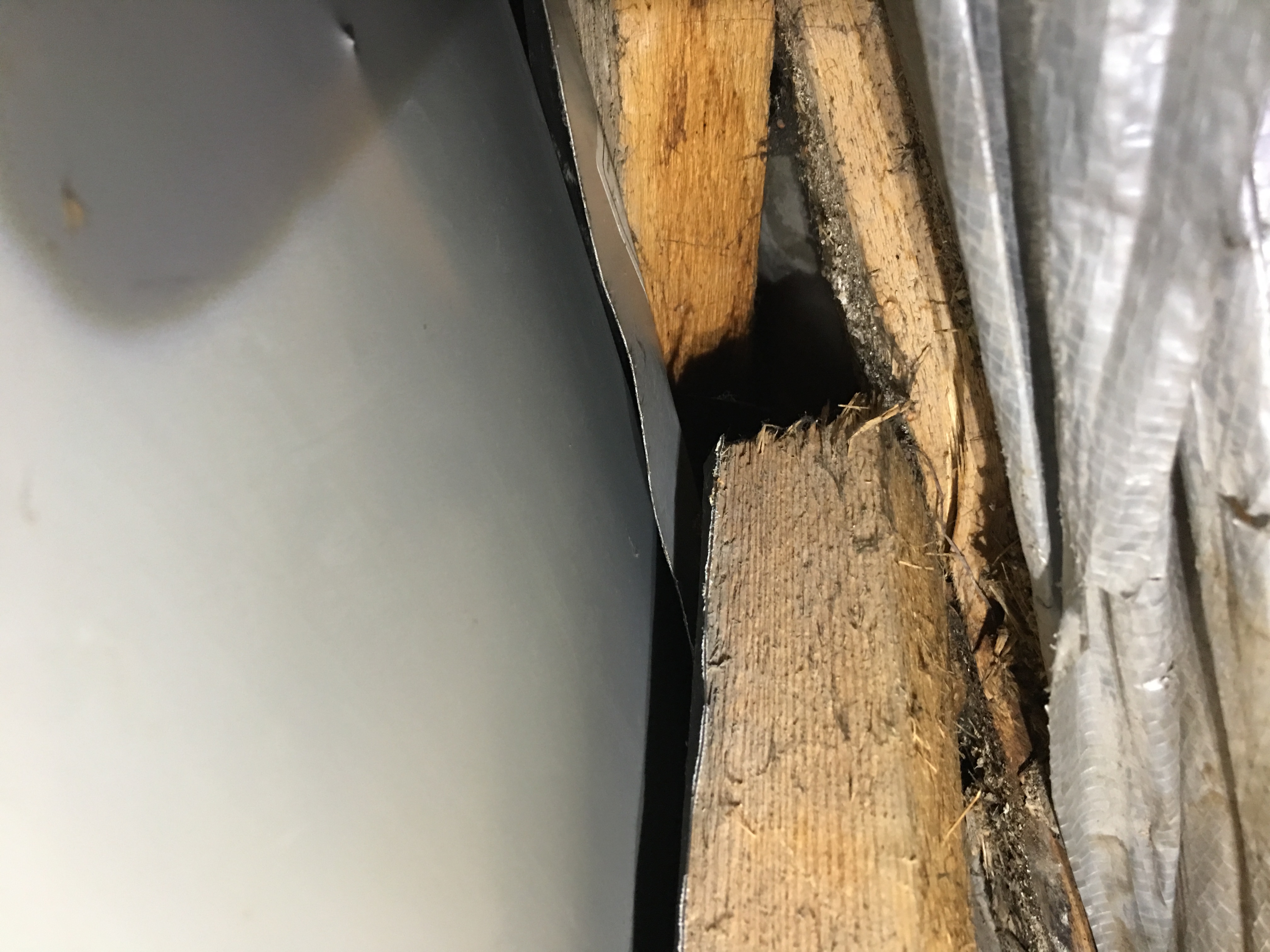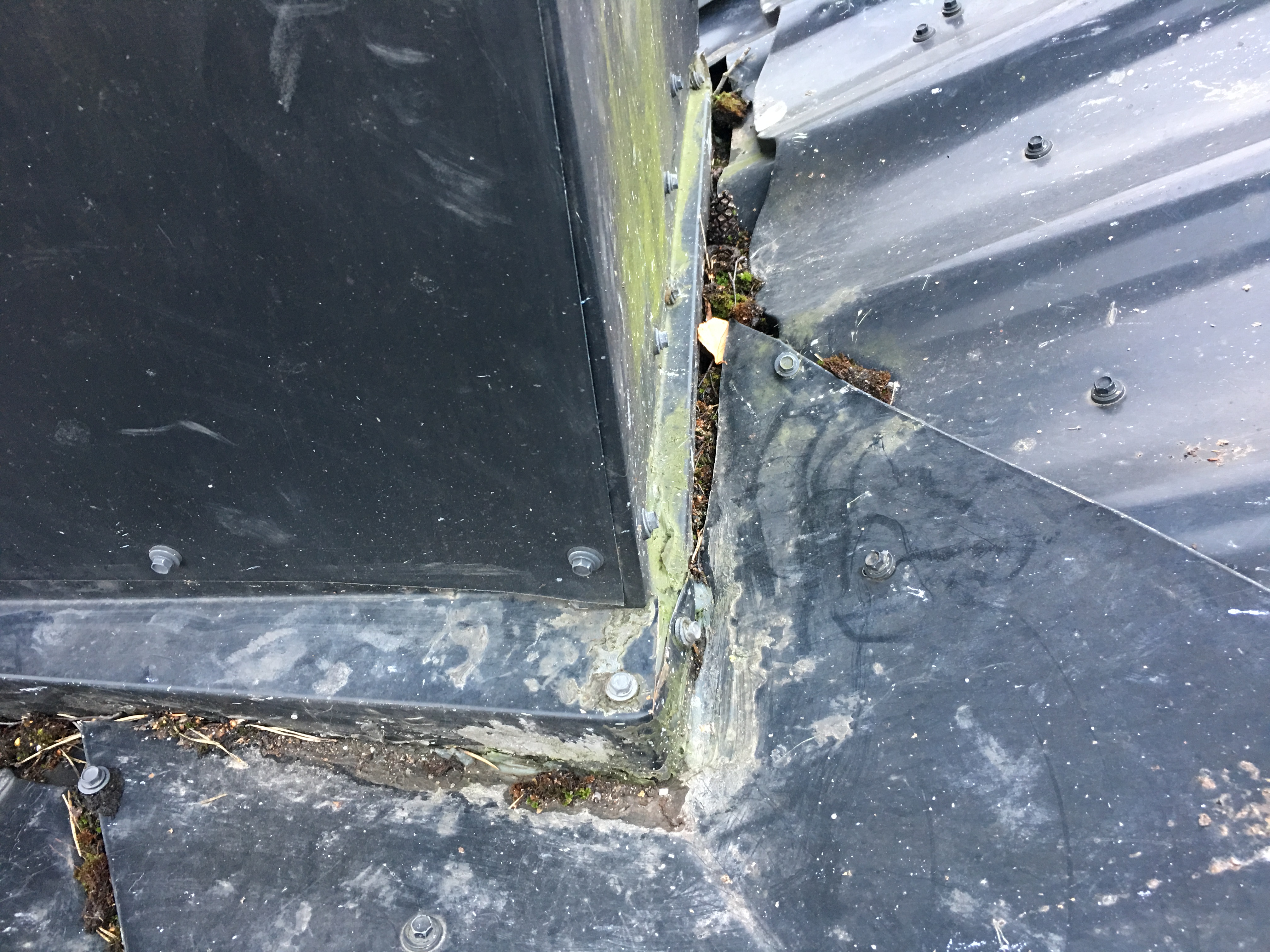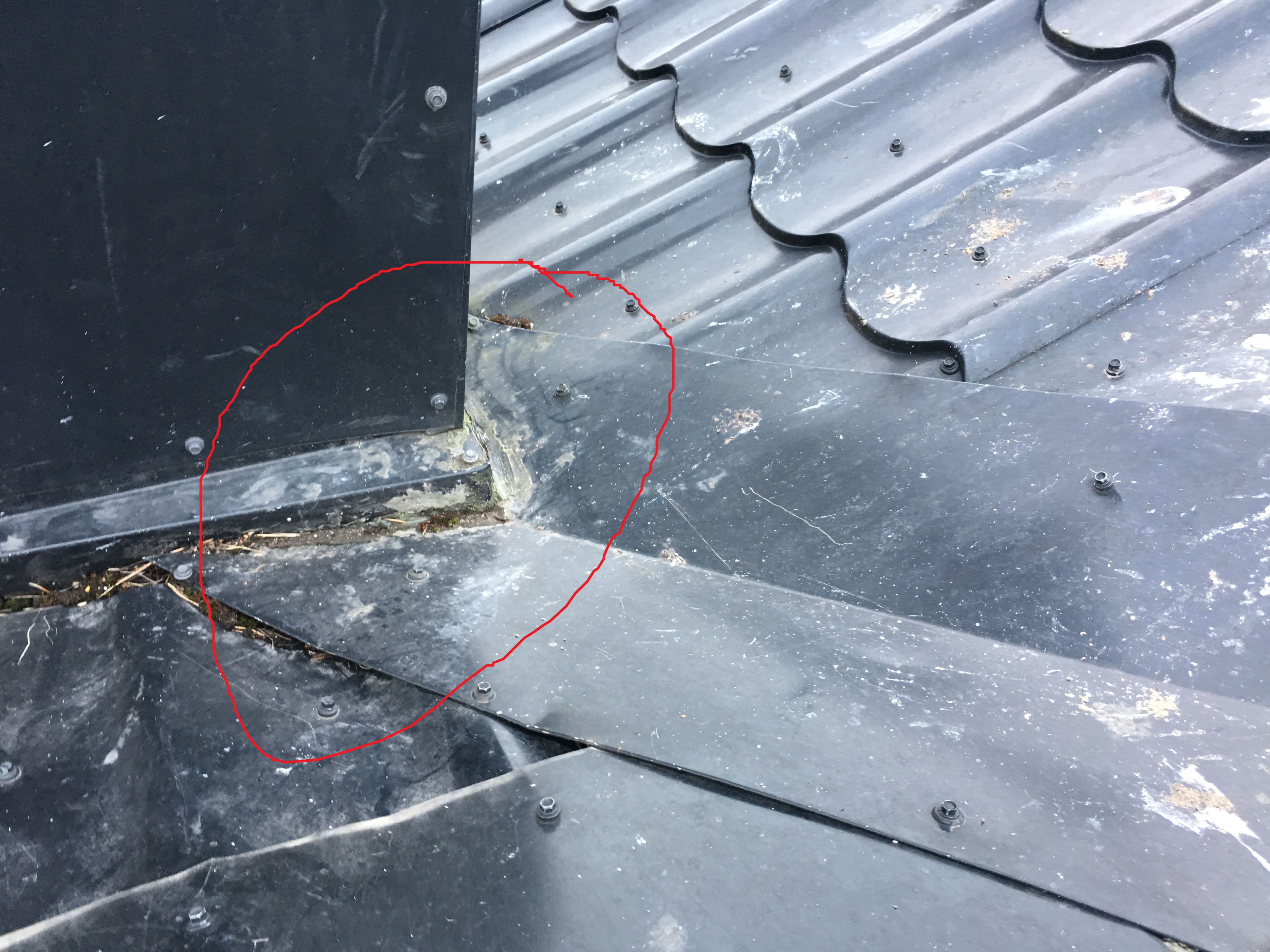 3) Kolmas probleem katusel on see, et korstna ümbruse 1 nurk lekib kui selle ümbruses on suurem praht (ühel pildil on prahihunnik alles, mis sai kuu aega tagasi likvideeritud) ja vajab tõenäoliselt ümbertegemist/täiustamist ning plekkseppa kätt. Punane ring on tõmmatud ümber ühel pildil probleemsele nurgale. Probleemi lahendus on ilmselt kohe selge kui eemaldada 1 neeluplekk, mis algab katuseharjalt. Sarikas ega puit konstruktsioonid vahetust ei vaja. Seda tööd saab teostada väga lihtsalt seistes katuseluugi avas olles pööningul enamik ajast ehk siis korsten on kohe katuseluugi kõrval (pööning on valgustusega). Juhul kui on vaja suurt plekki katusele saada siis saab seda kombineerida ideaalselt tööga nr 2. Loomulikult võiks katuse vahetult korstna ümbrusest ka puhtaks teha.