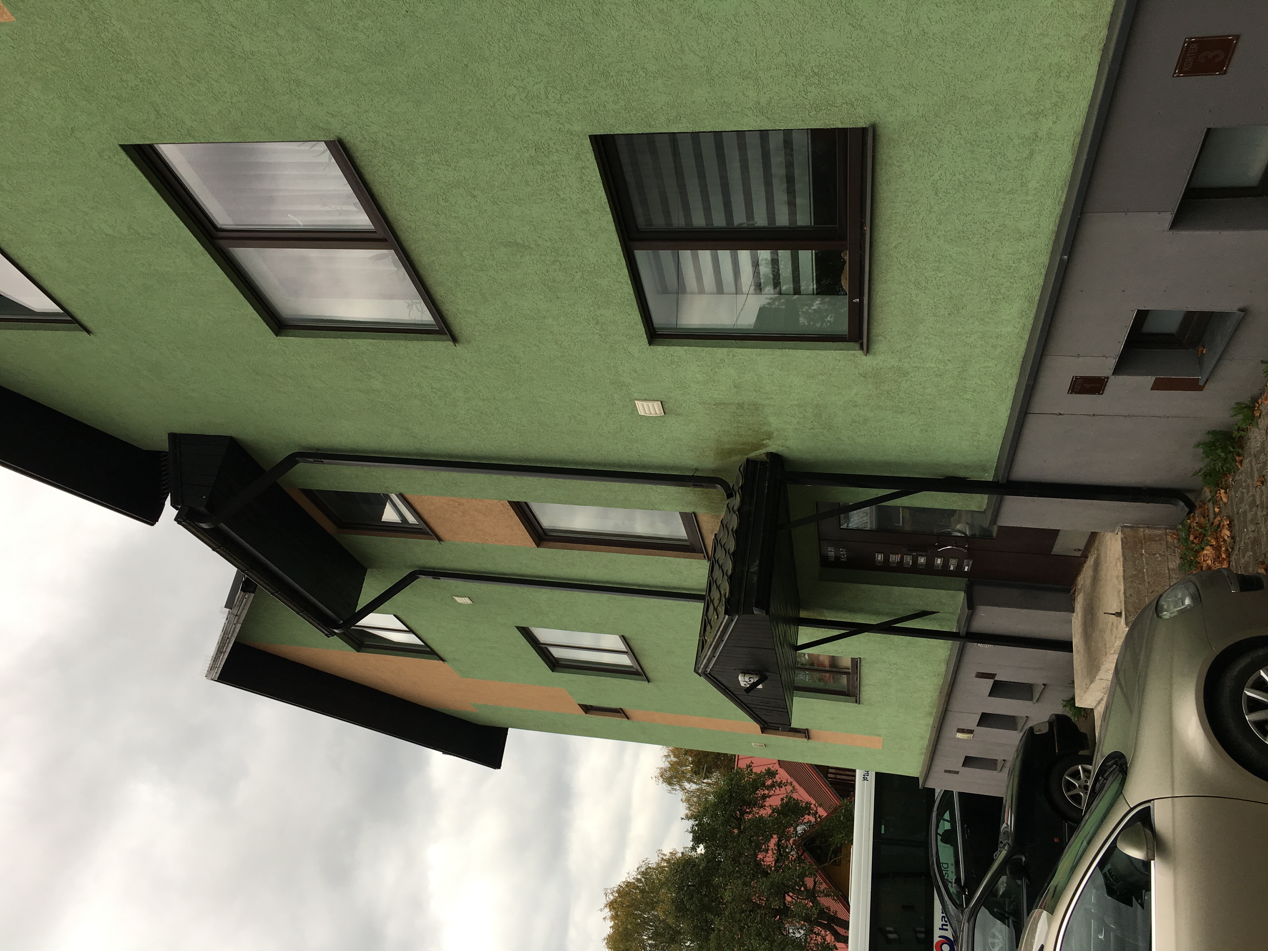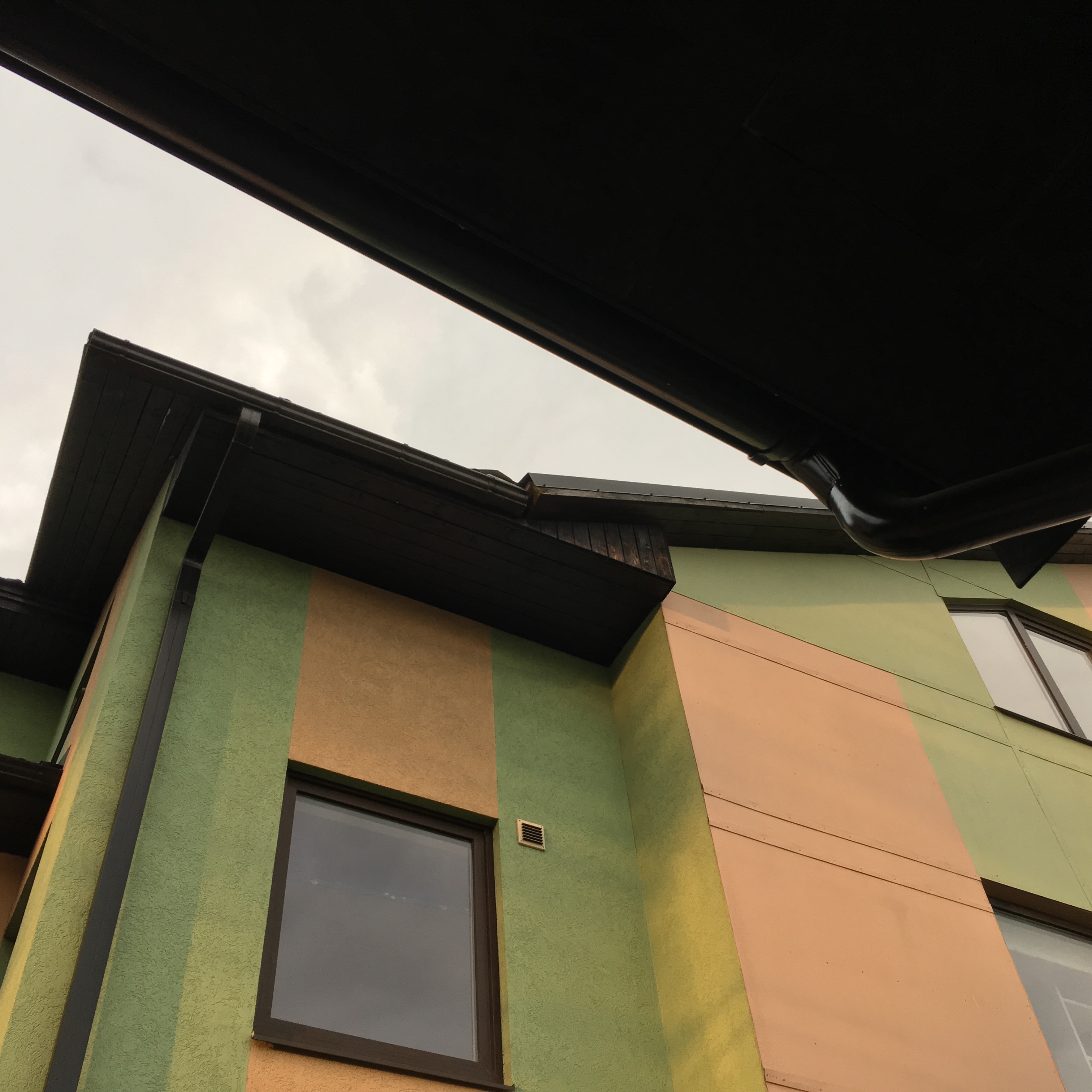 2) Maja taga olev neeluplekk viskab vee üle vihmaveerenni isegi väikse vihma korral. Võimalikud probleemi põhjused: neeluplekk võib olla natuke liiga pikk, vihmaveerenn natuke liiga madalal või suunab kannatada saanud lumetõke vee valesti vahetult enne selle langemist (lumetõkke probleemi korral võib selle eemaldada või seda lihtsalt lühendada). Usun, et sellele leidub kindlasti lihtne lahendus. Hoone katus on hoovist ligipääsetav nii korv- kui ka käärtõstukiga (kõrgust on ca 2,5 korruse jagu antud kohas). Vajadusel saab ka tellingu ehitada kuigi töö on lühiajaline.