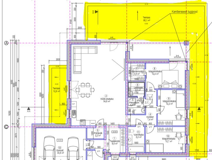 Maja ümber on kaks terrassiosa 13 m2 ja 92m2. Terrassid tuleb ehitada astmega.