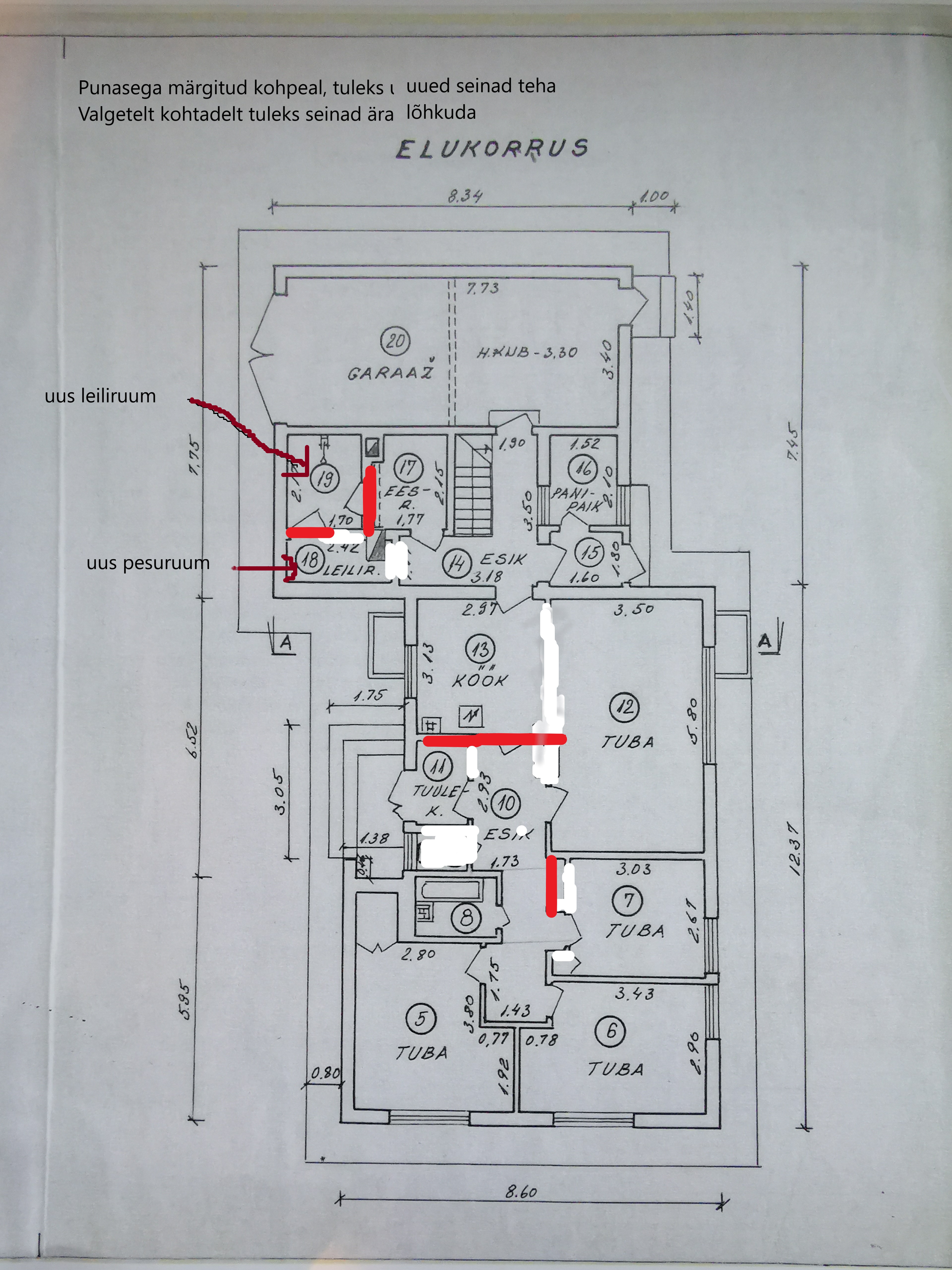 Vaja oleks teha saunaruumid korda, köögi ja elutoa vaheline sein maha võtta, wc teha praegusesse vannituppa ning sellega seoses lõhkuda hetkel wc ümbritsev sein, kuhu tuleks üks suur esik. hetkel esiku ja köögi vahel oleva seina puhul tuleb ukseauk täita - täis ulatuses jääks sein, mis peaks pidama vastu köögikappidele.
