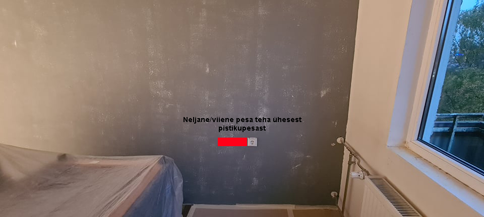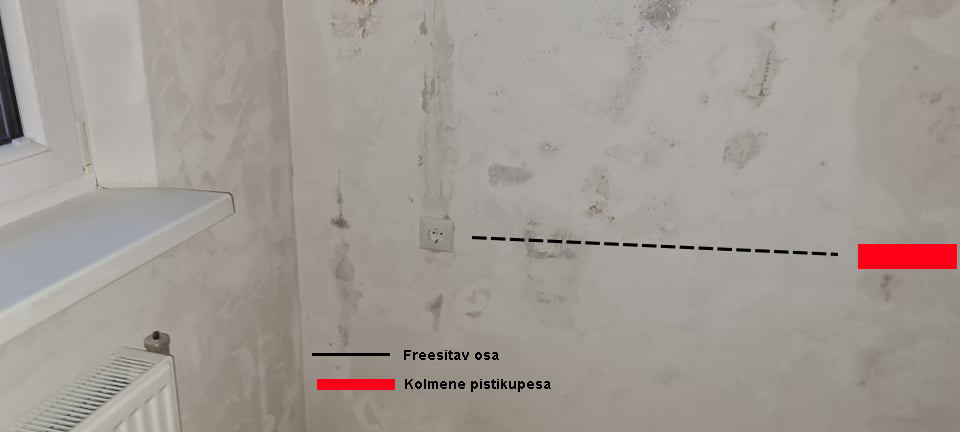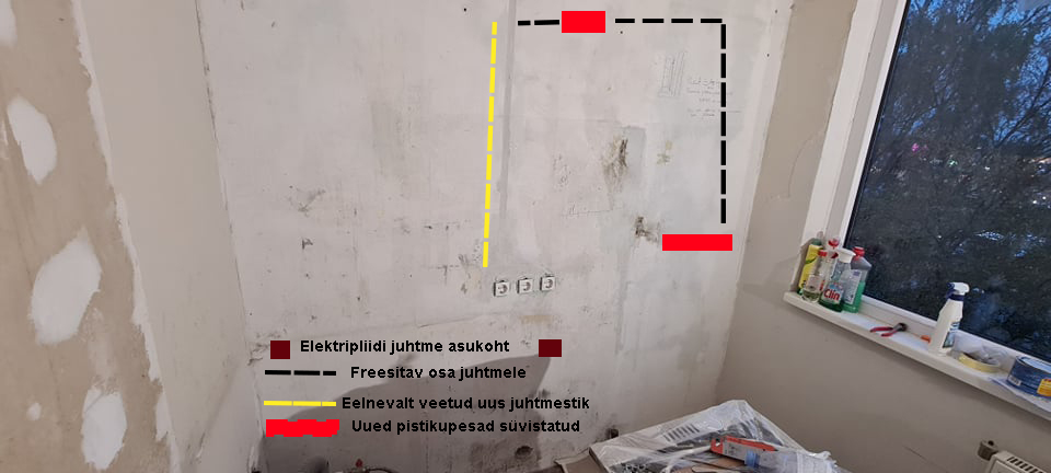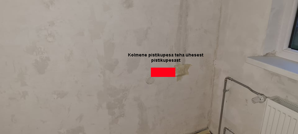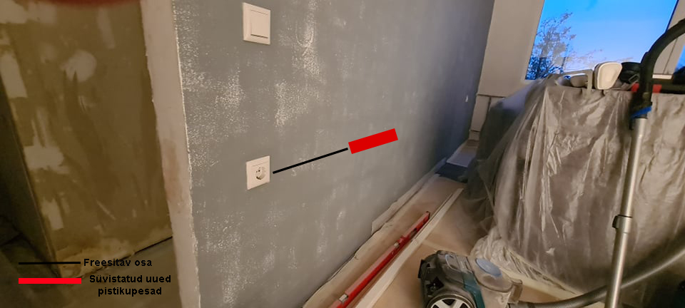 Köögiseinas oleks vaja olemasolevate pistikupesade asukohta muuta - viia sama juhtmega kahene pistikupesa ülespoole õhupuhasti ning köögikapi valgustuse jaoks ning kolmene/neljane pistikupesa köögitasapinna kohale.