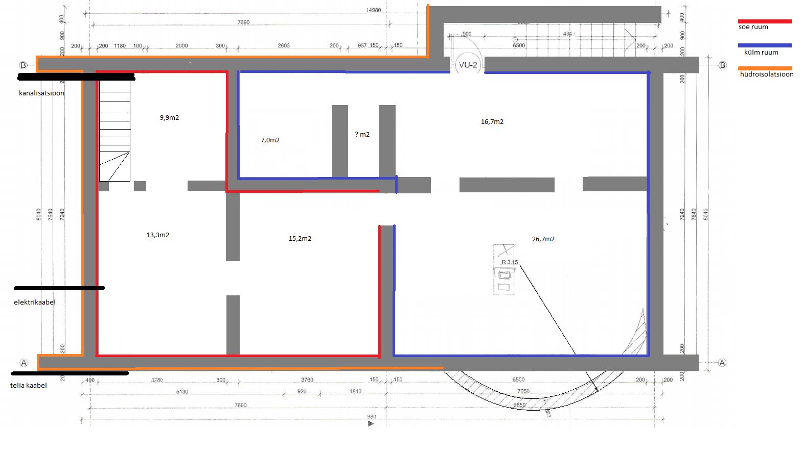 - kokku ca 40m2 pinda (joonisel näidatud punasega märgitud ruumid)