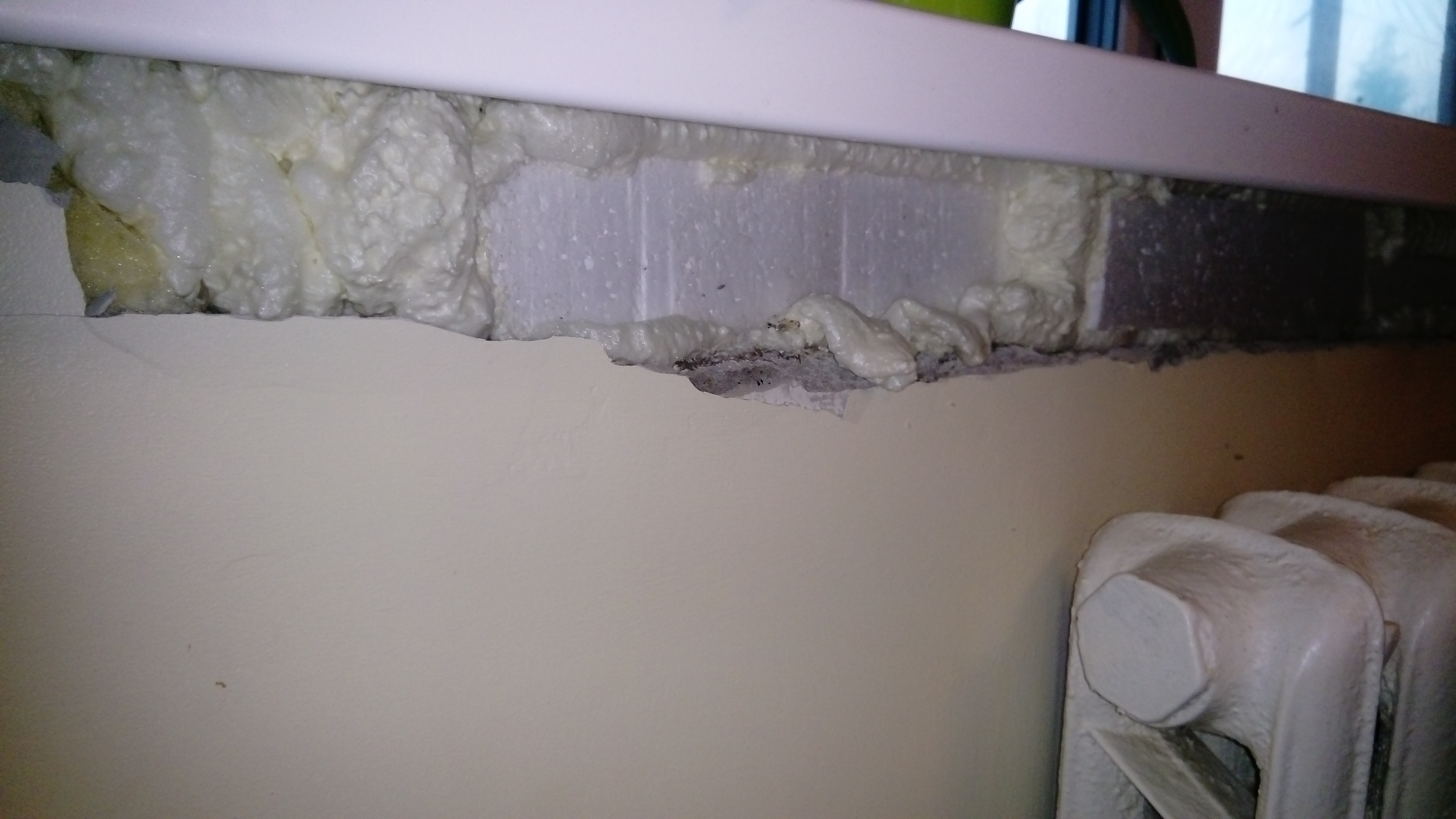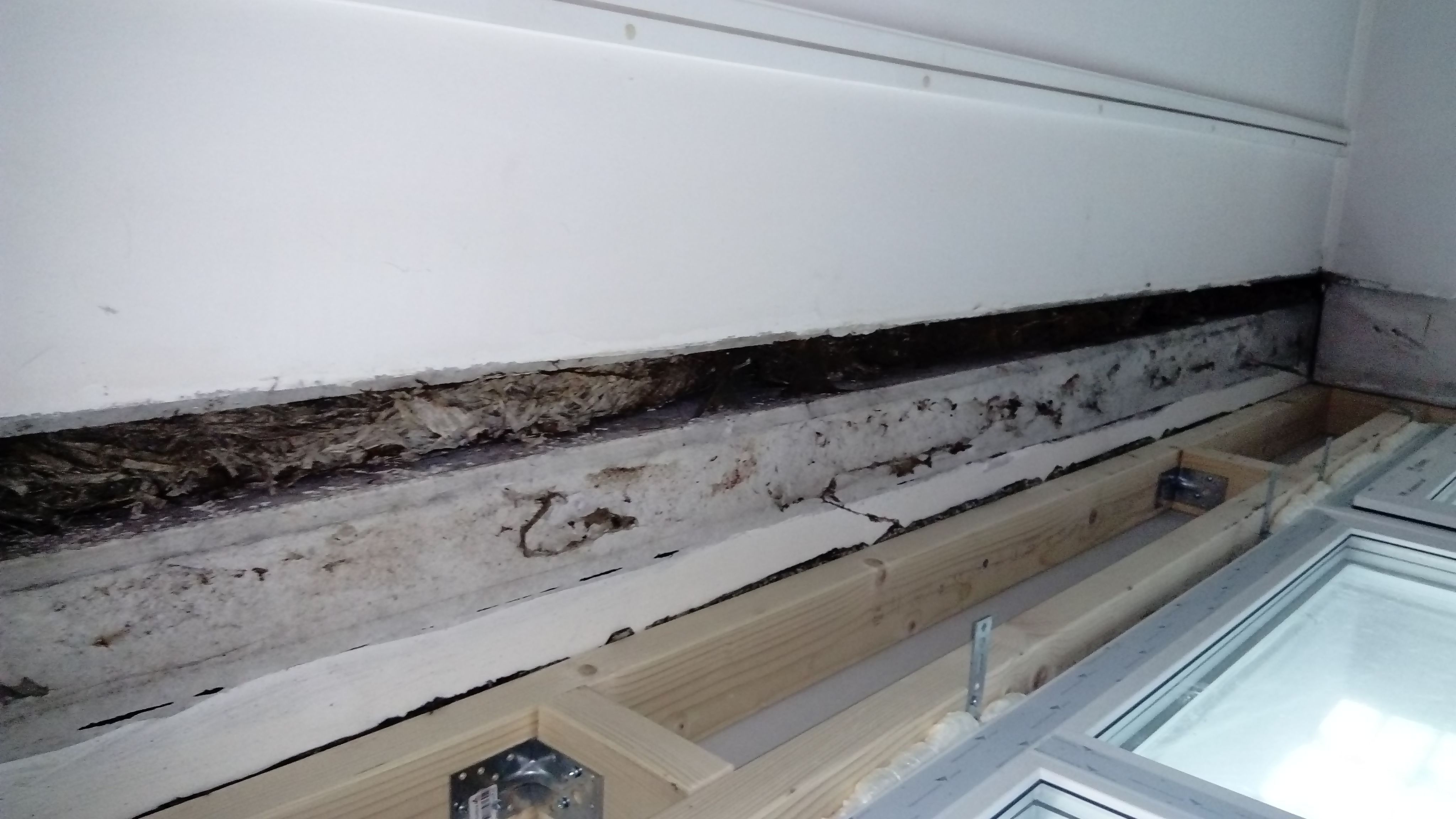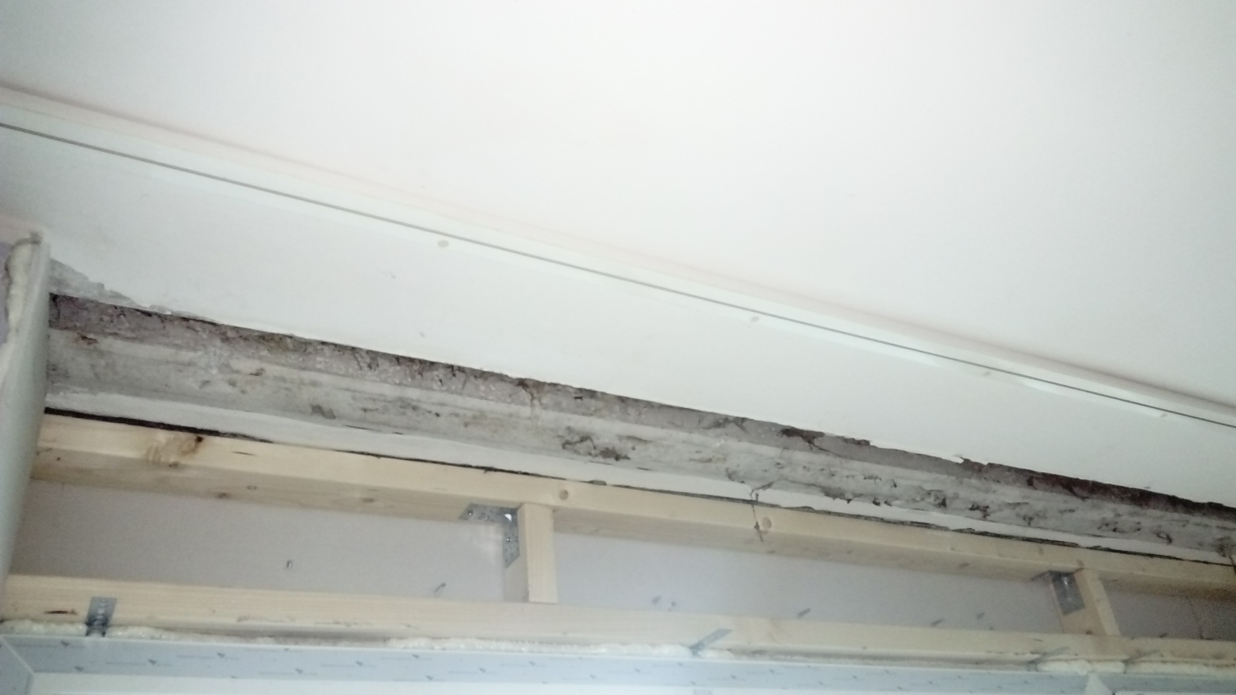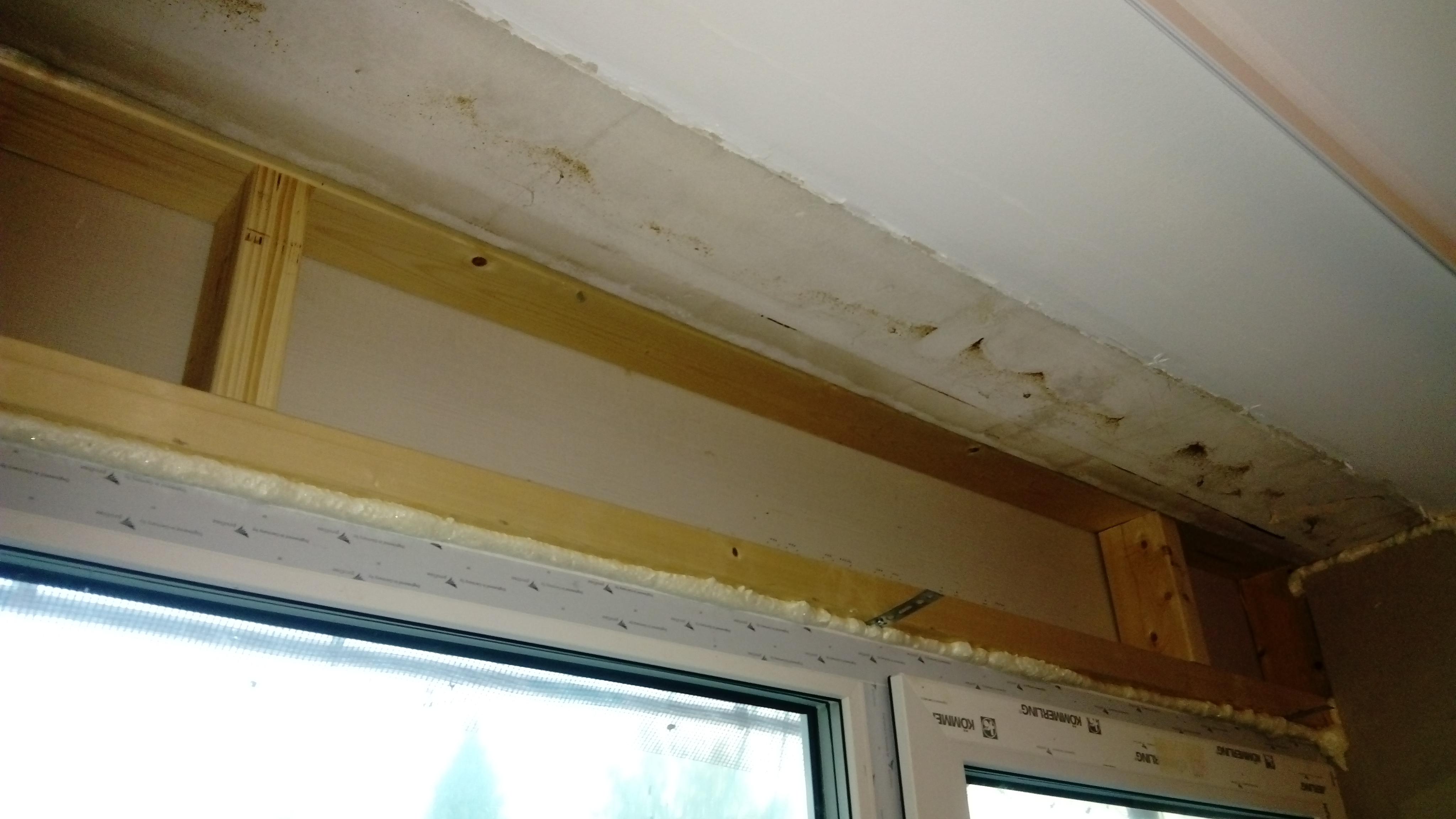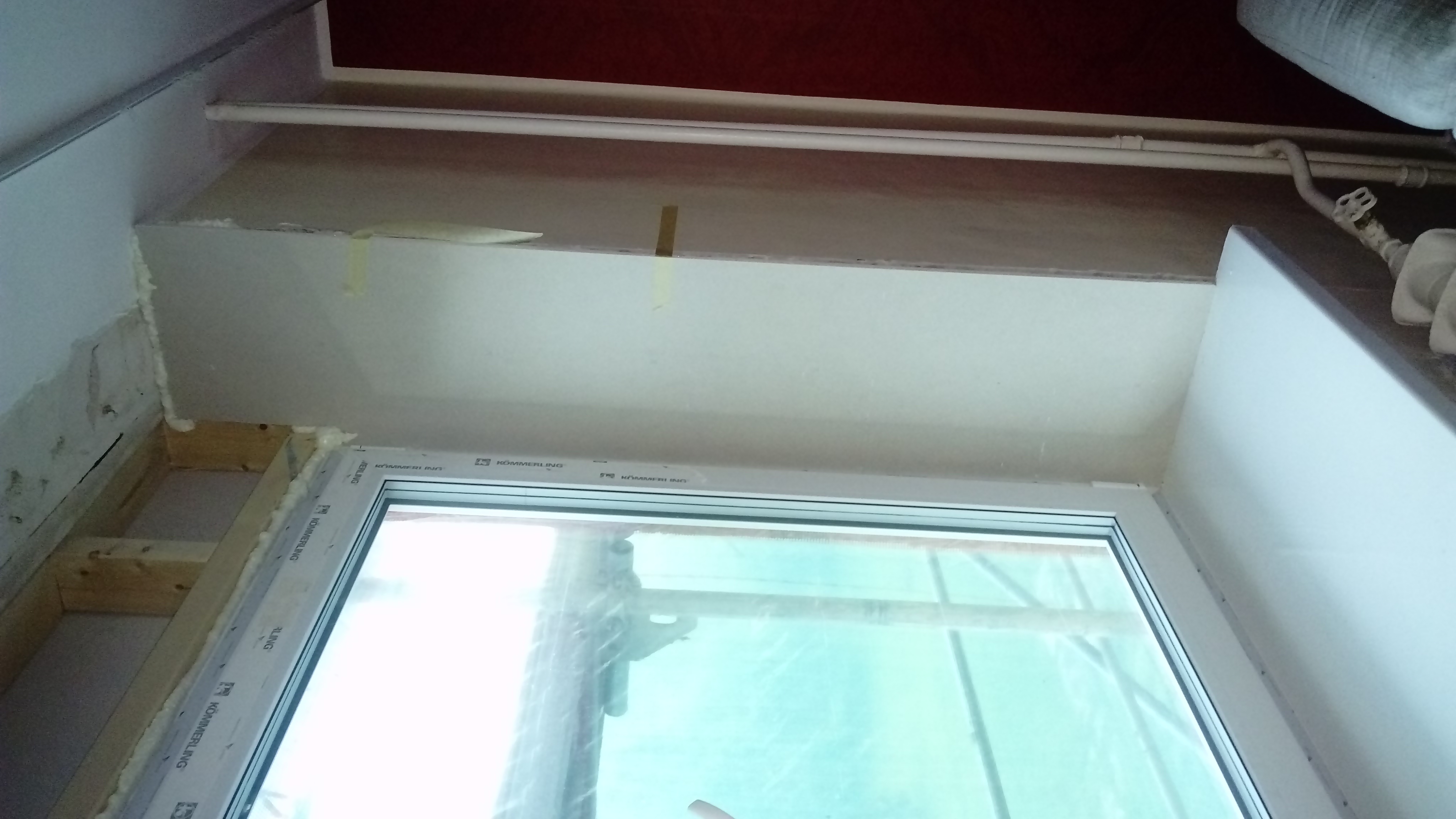 Ehitaja paigaldab mõlemale aknapalele kipsplaadi, et pind oleks sile (vt. pilt 1). Samuti paigaldatakse klaasvill akende kohal oleva kasti sisse, mis kaetakse vertikaalse kipsplaadiga (vt. kast pilt 2).