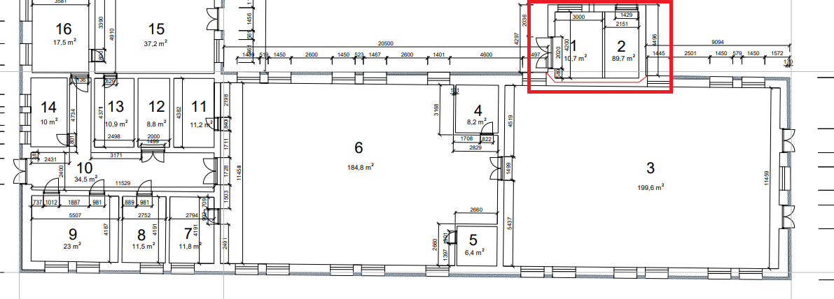 Lisasin joonise majast, mida vaja kütma hakata on. Ruumidel on m2 peal. Laekõrgused ei ole kõrged u.3m.Maja eesotsas on kontoriruumid ja taga 2 suurt laoruumi . Laoruumid lähevad veel pooleks, et kokku oleks 4 laoruumi vahet. Tegin joonisel punase kasti ümber, et kuhu võiks kütteseadmed ära mahtuda. Maad on meil umbes hoone umber 6000m2, et phmst äkki saab pakkumise teha ka maaküttele vms.