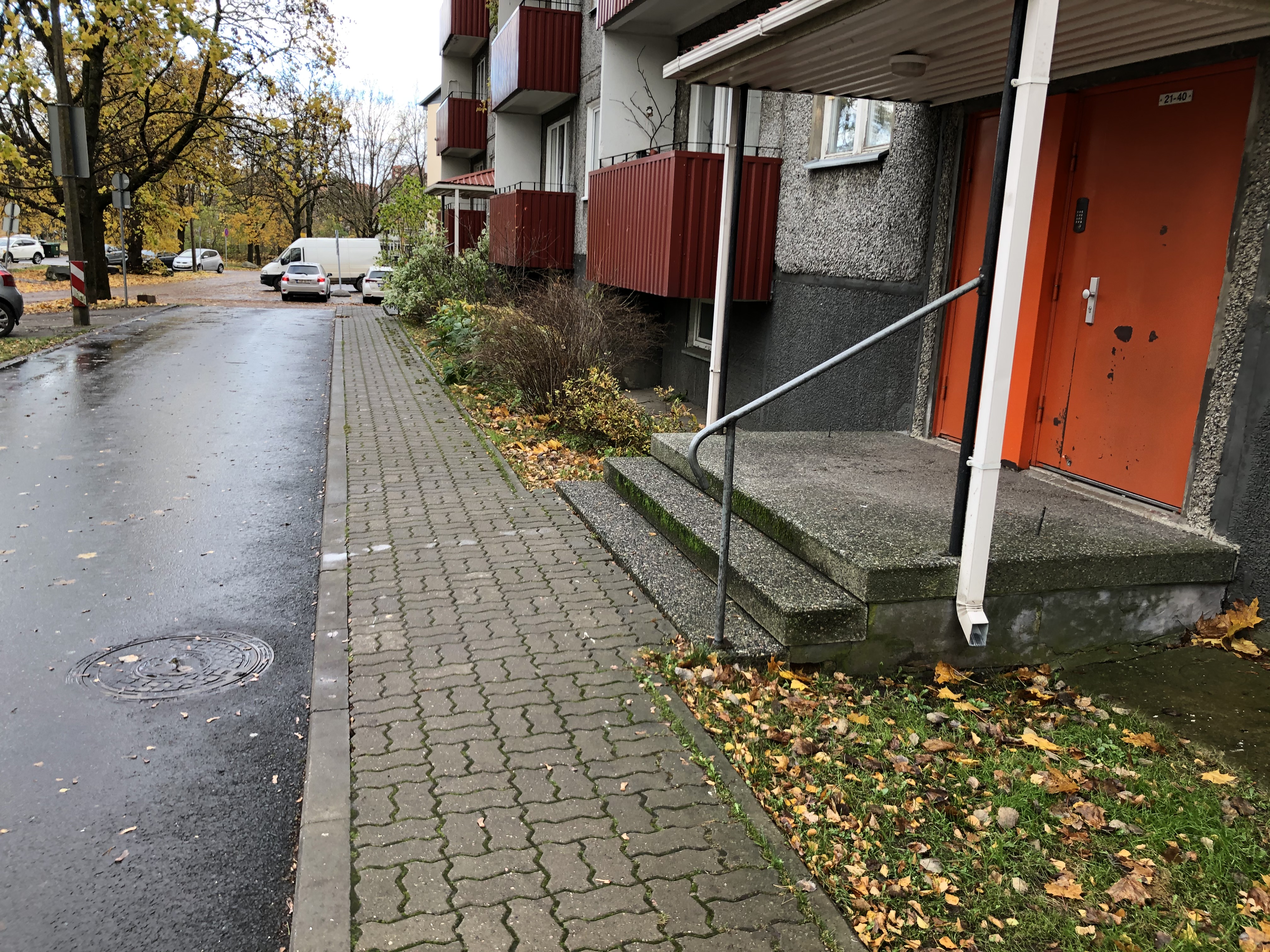Majas on neli trepikoda, igas trepikojas on neli püstikut. Iga trepikoja trepi ees on kanalisatsioonikaev, kuhu torustik suubub. Olemasolev toru kulgeb välistrepi alt. Maja ees on tänavakividega kaetud kõnnitee.