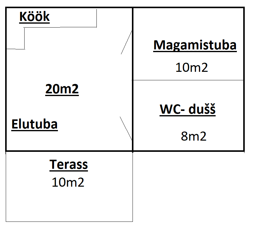 Aastaringeks elamiseks mõeldud 1 kordne maja 40-50m2, kus on 1 magamistuba, elutuba-köök, dušširuum-wc ja terass katusega u.10m2.