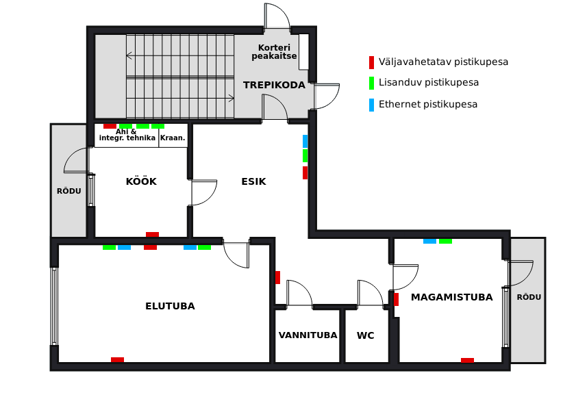 Esik: vaja on vahetada välja kaks olemasolevat kahest pistikupesa, lisada üks uus pistikupesa ning etherneti pesad, kust jooksevad kaablid tubadesse (esikus on ruuter, tubades interneti tarbijad). Esikus on seina peal olemasolev juhe, mis läheb vannituppa, selle võiks võimalusel esikus seina sisse viia.