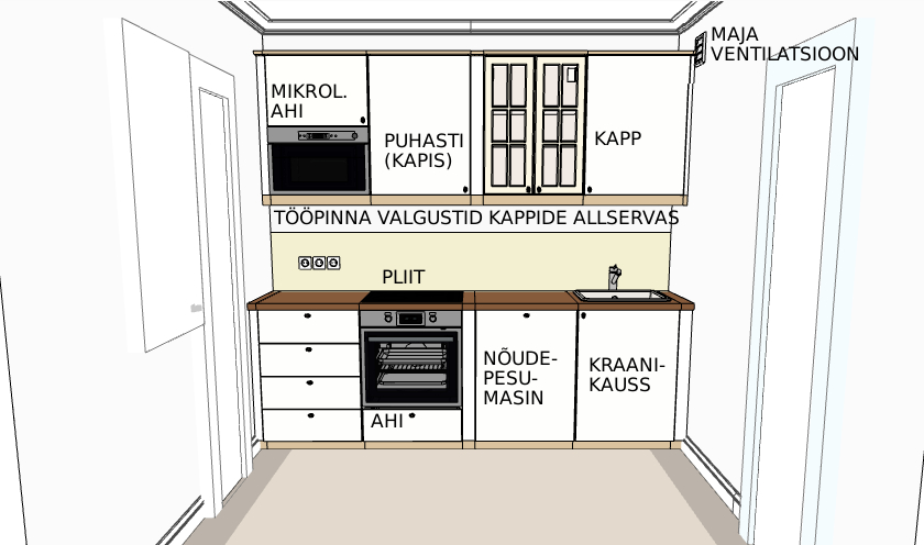 Kaasatud on pilt tulevase köögimööbli ja tehnika paigutusest. Köögimööbli ja tehnika paigutamine ei kuulu antud hanke juurde, pilt on vaid illustreerimaks integreeritud tehnika, mille jaoks on vaja juhtmeid ja ühendusi, paigutust seinal.
