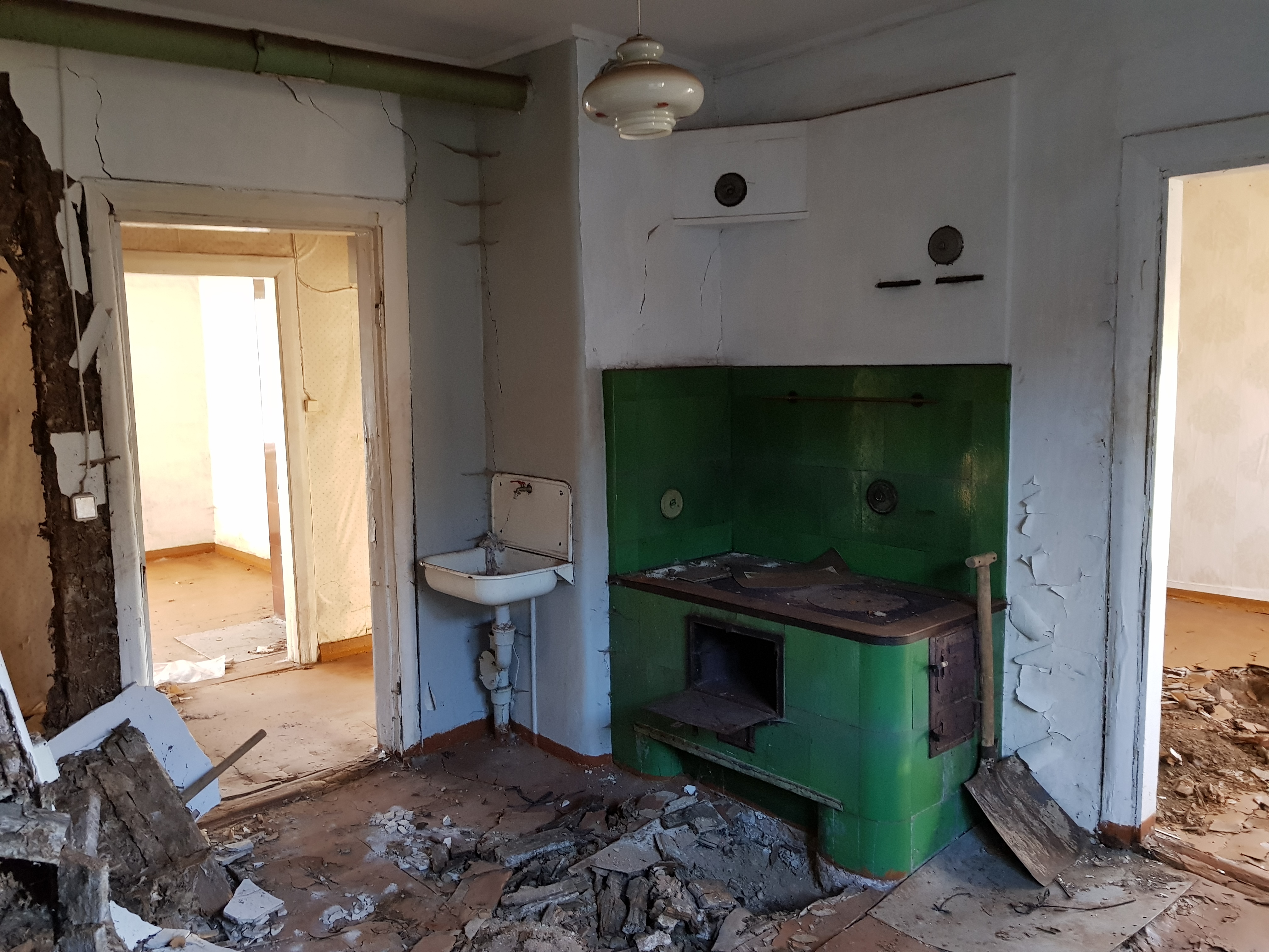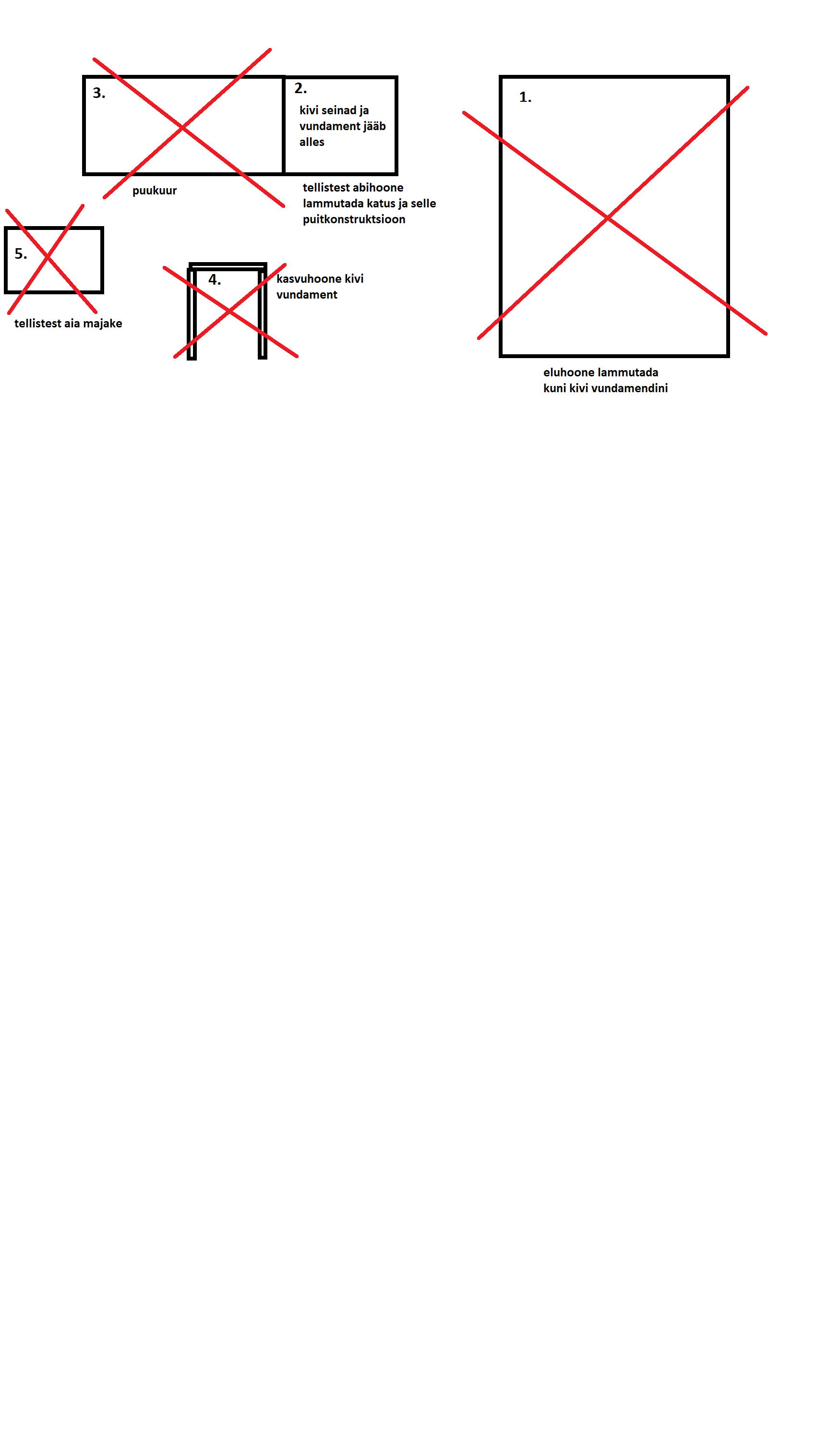 3. Elamu lammutamine kuni kivi vundamendini. Materjal: seinad- puitsõrestik + krohv, katus - plekk, aknad plastraamiga, küttekolded- 2 ahjupliiti ja 6 ahju, santehnika - enamus on eemaldatud. Mööblit ei ole.