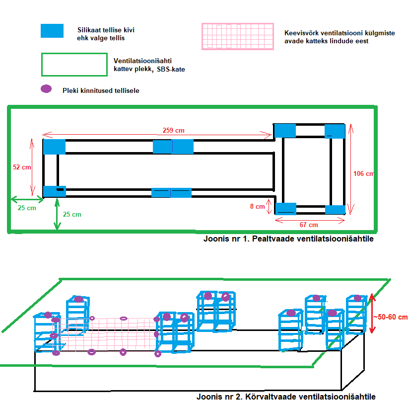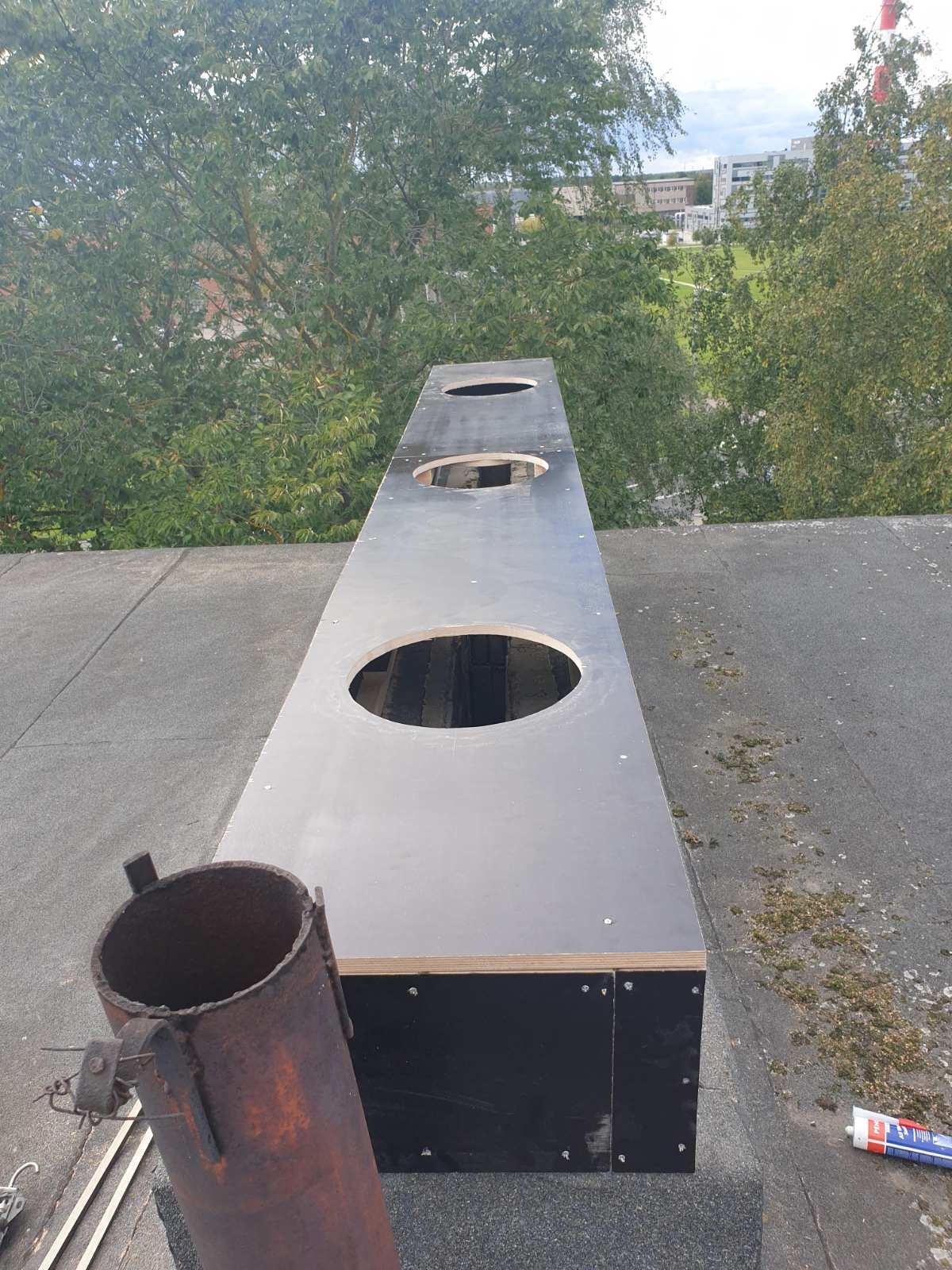 Varasemalt on ventilatsioonišahtile paigaldatud turboventilaatorid koos karkassiga, kuid soovime vastava lahenduse eemaldamist. Lisaks tuleb teha uus lahendus olemasolevale ventilatsioonišahtile tellistest kõrgendusena ja katmine SBS kattega, plekk+SBS kate ning keevisvõrk avade katteks lindude eest.