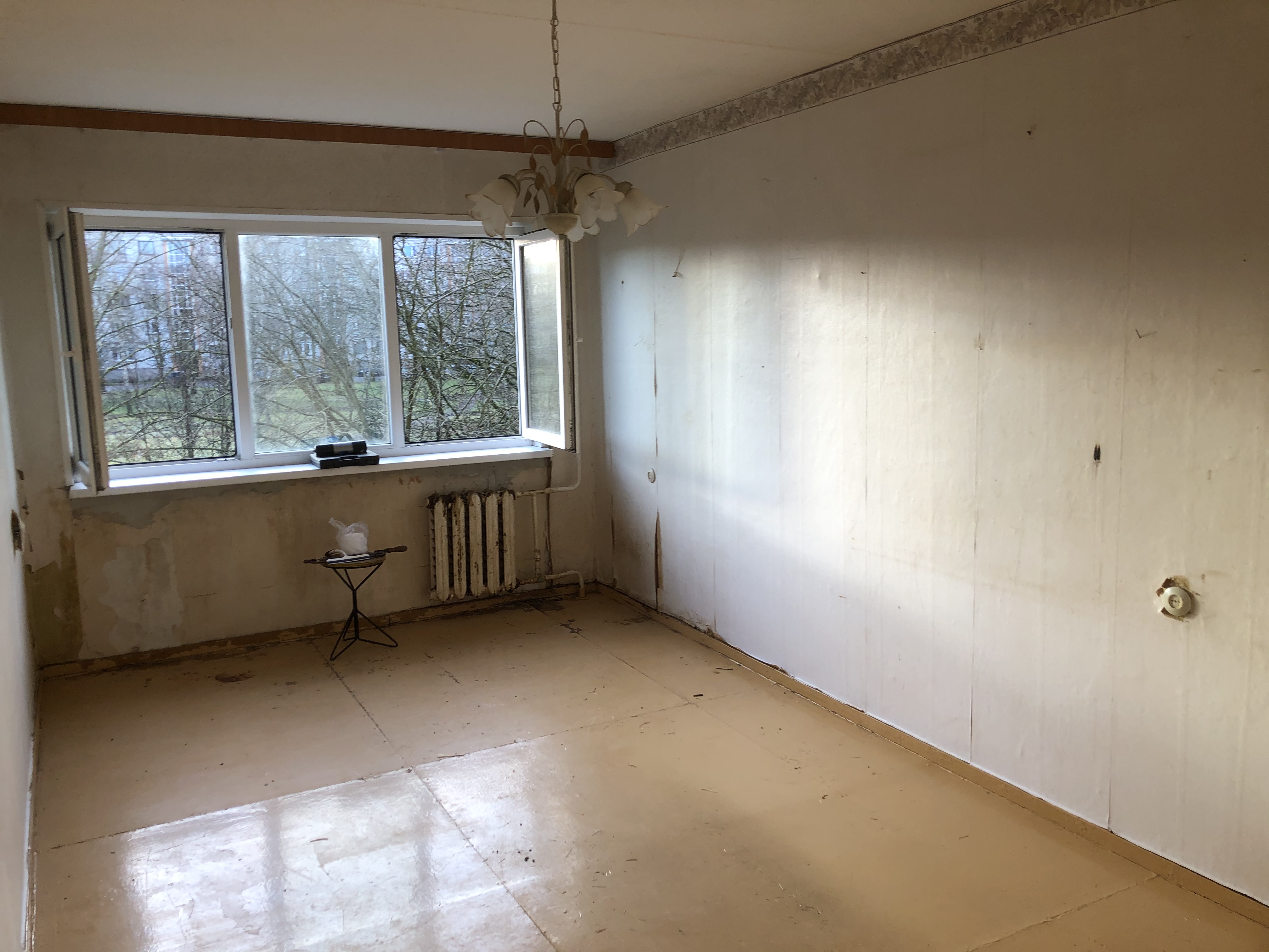 Seinad: viimistleda kahe toa vahelt eemaldatud seina servad, eemaldada vana tapeet, pahteldada vajadusel augud (ei ole vajalik lauspahteldus, kuna vanem korter, siis seinu loodi ajama ei hakka) (seinad värvime ise)