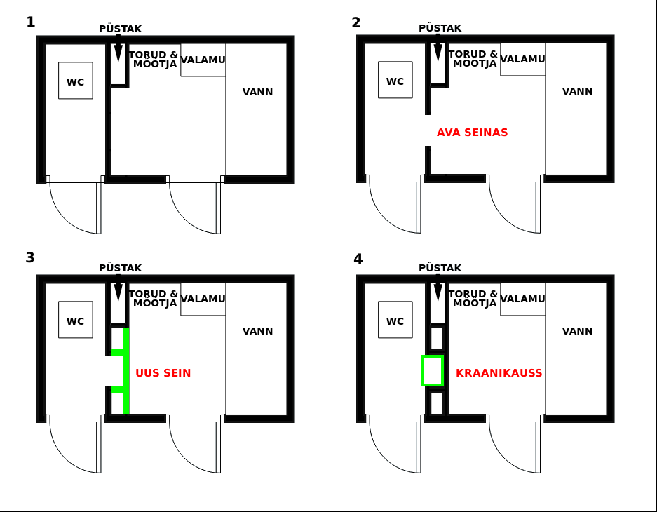 WC ja vannituba ei ole kokku ehitatud ja jäävad ka lahku. Püstaku asukoht jääb samaks. Olemasolevad vee- ja kanalisatsioonitorud vannitoas ei tule seina sisse viia.